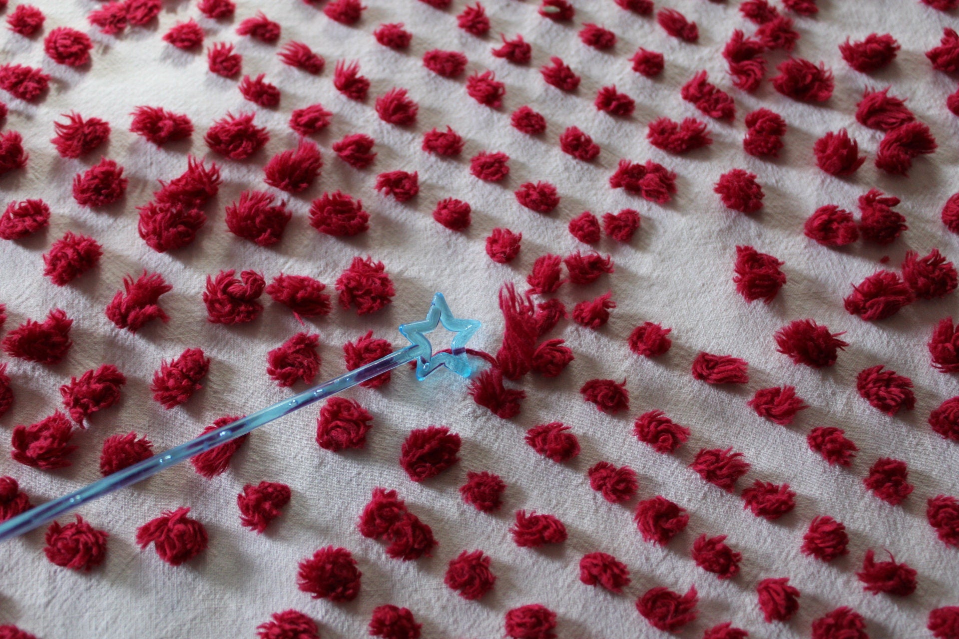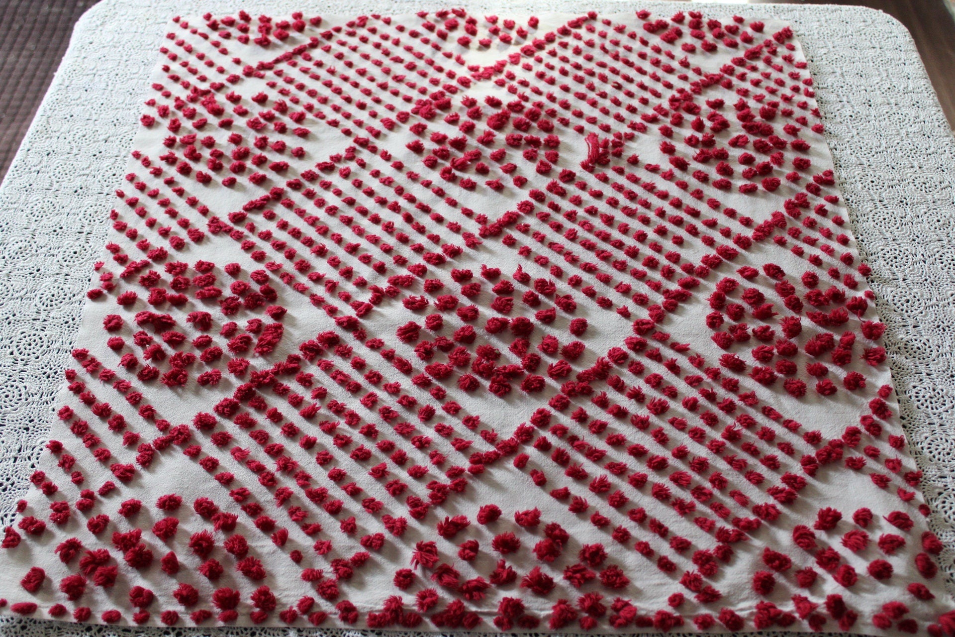 Make a bold, elegant statement in your special design with this fabulous piece of antique chenille fabric. It is an original, handtufted design with gorgeous red wine colored puffs that form a circular and diamond pattern.