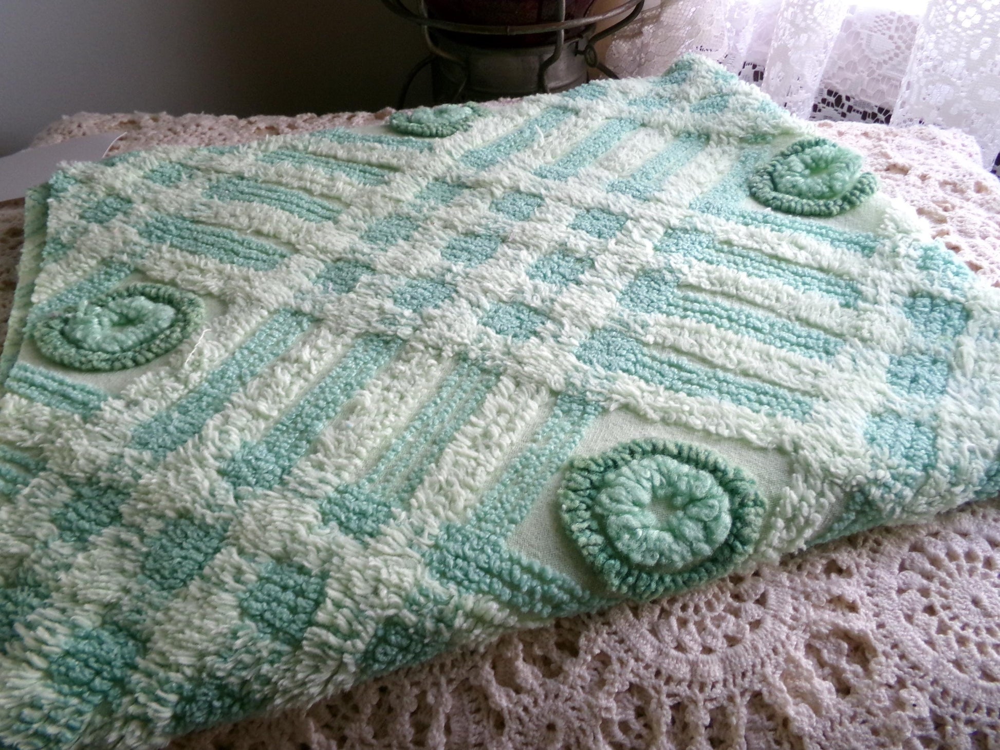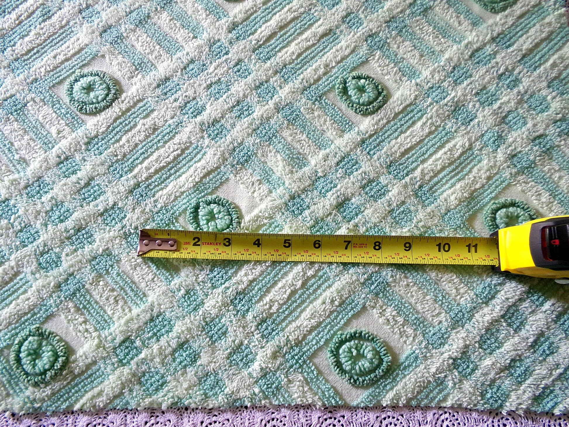 Fabulous tonal shamrock green vintage chenille fabric piece. Features an adorable pattern of round donut dots against a tonal green geometric bkgd. Very lightweight & easy to sew with. Cotton blend circa 1960s era. Measures about 24" x 20" inches.