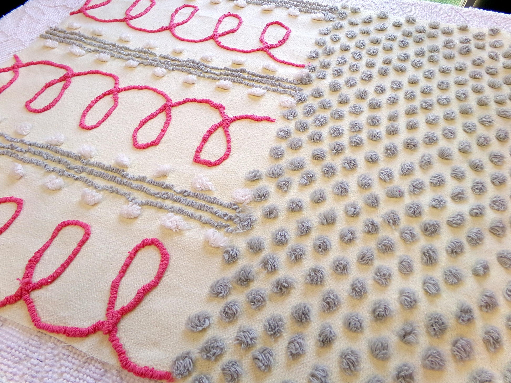 This unique vintage chenille fabric will surely inspire your creativity: bouncy grey pop tufts highlight a red needletuft doodle design, all set on a fantastic buttery yellow cotton groundcloth.Approx 20" x 24" piece. 100% cotton. An original Cabin Crafts pattern in one of the rarest designs they ever made. Ideal in handmade chenille quilts, DIY pillows, and other sewing and craft projects. ***Note the cotton bkgd is really a buttercream yellow color, not white.
