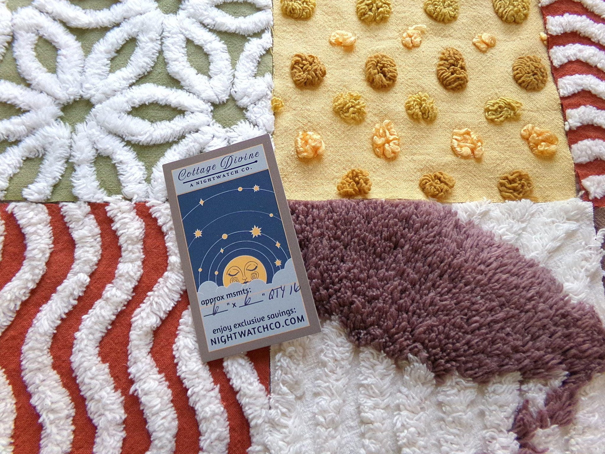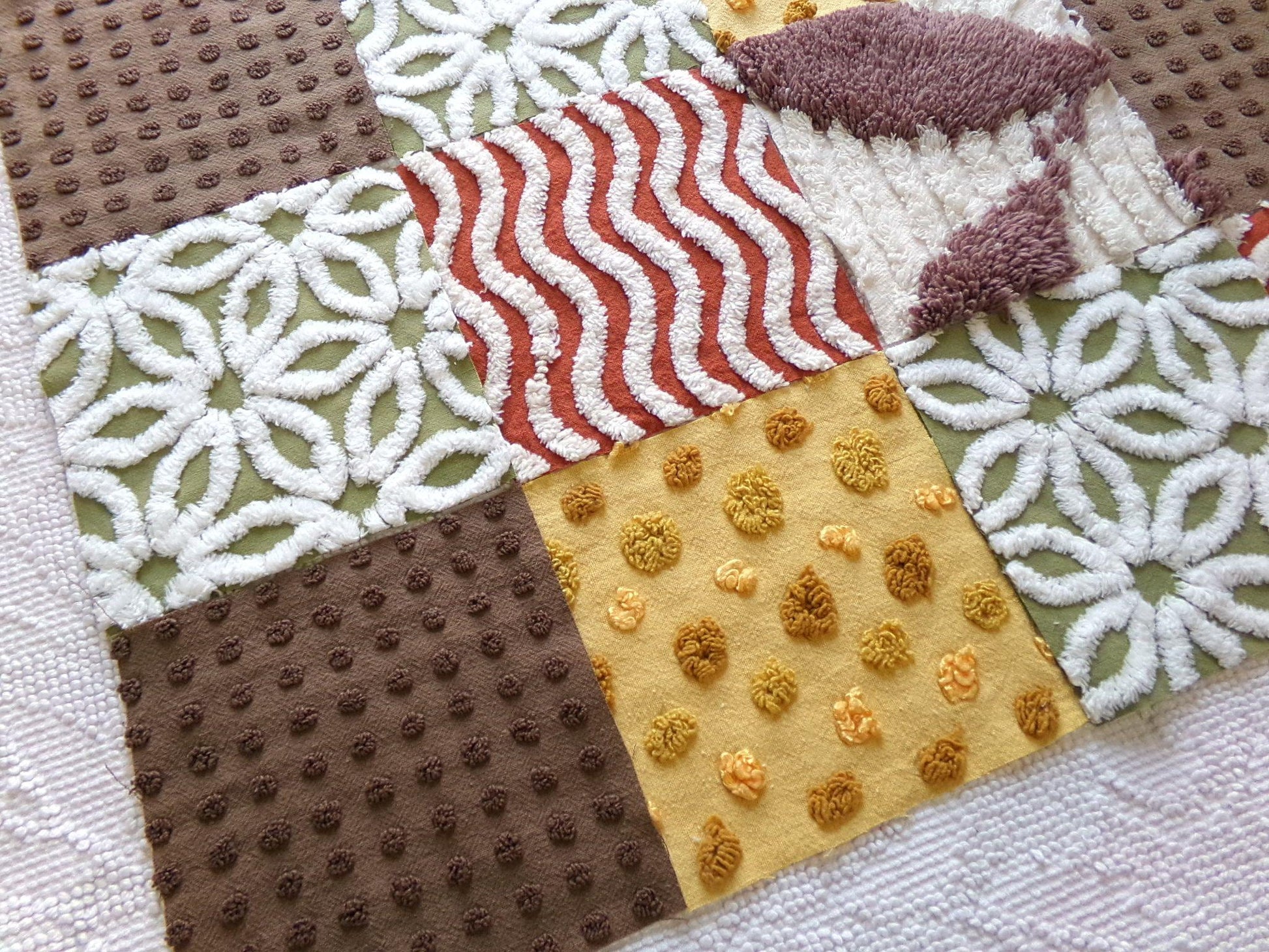 This assorted premium mix of fabric squares has been rotary cut by hand from original vintage chenille bedspreads. All are cotton or cotton blend. Ideal in DIY pillows & handmade quilts.