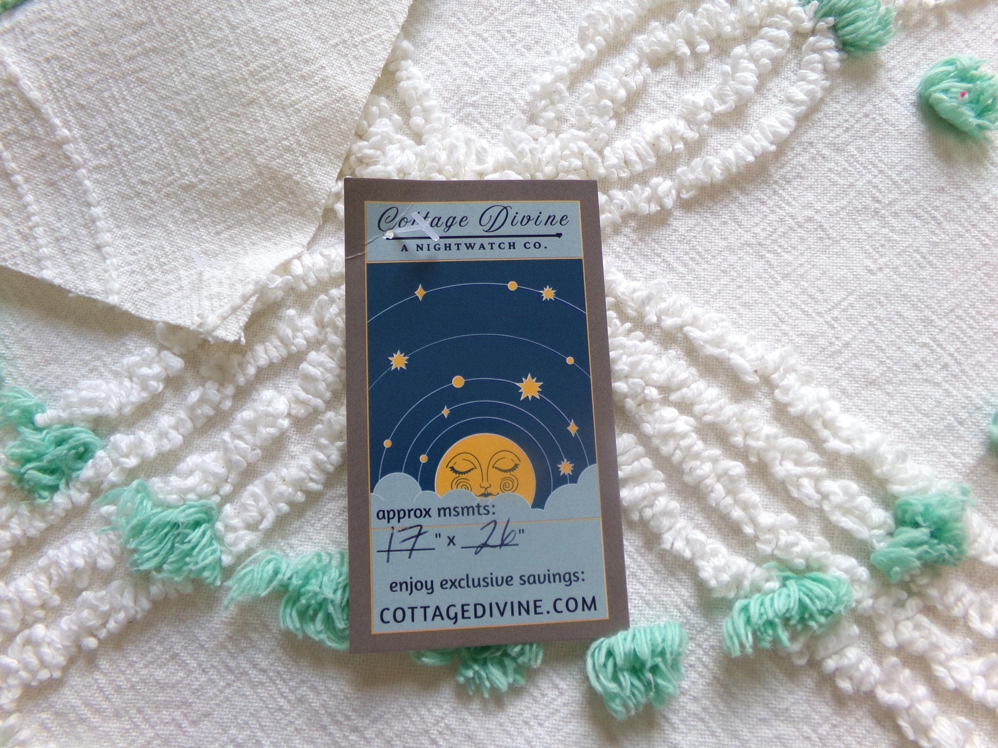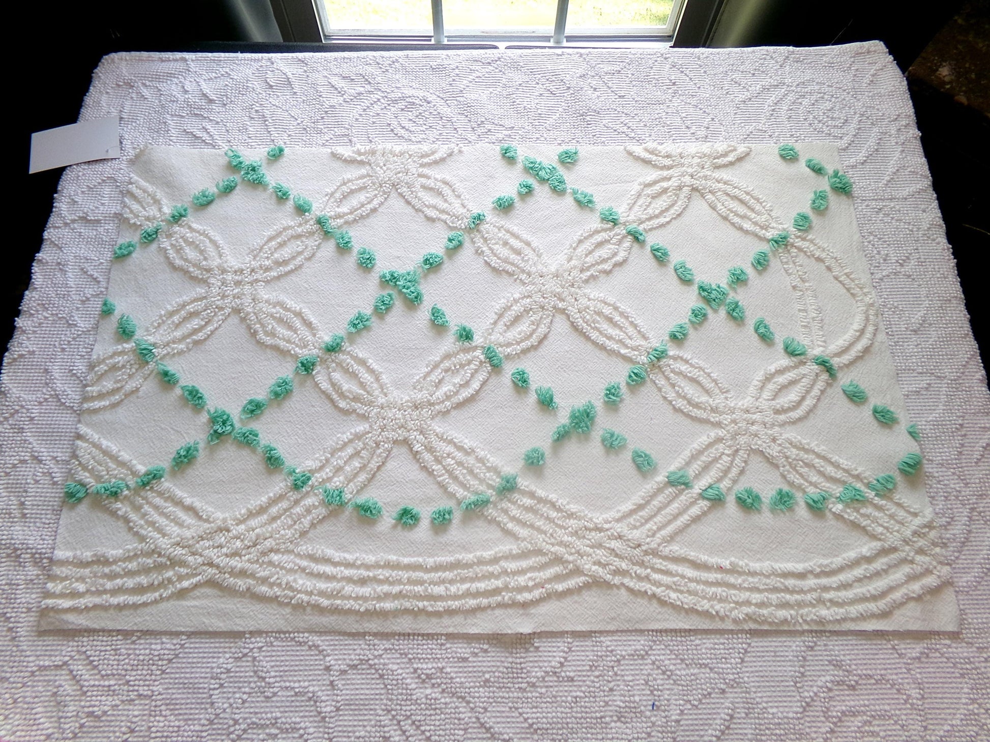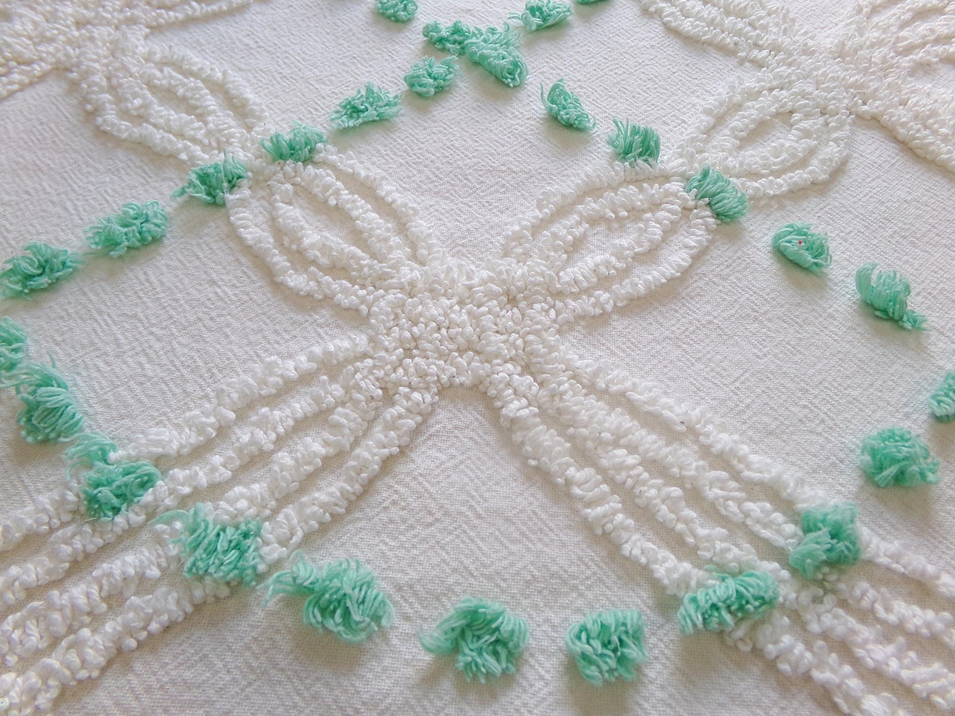 see more, cottagedivine.comThis is an elegant piece of vintage chenille fabric in a gentle ivory spider tuft geometric design accented by jade green pops that create a striking presentation.