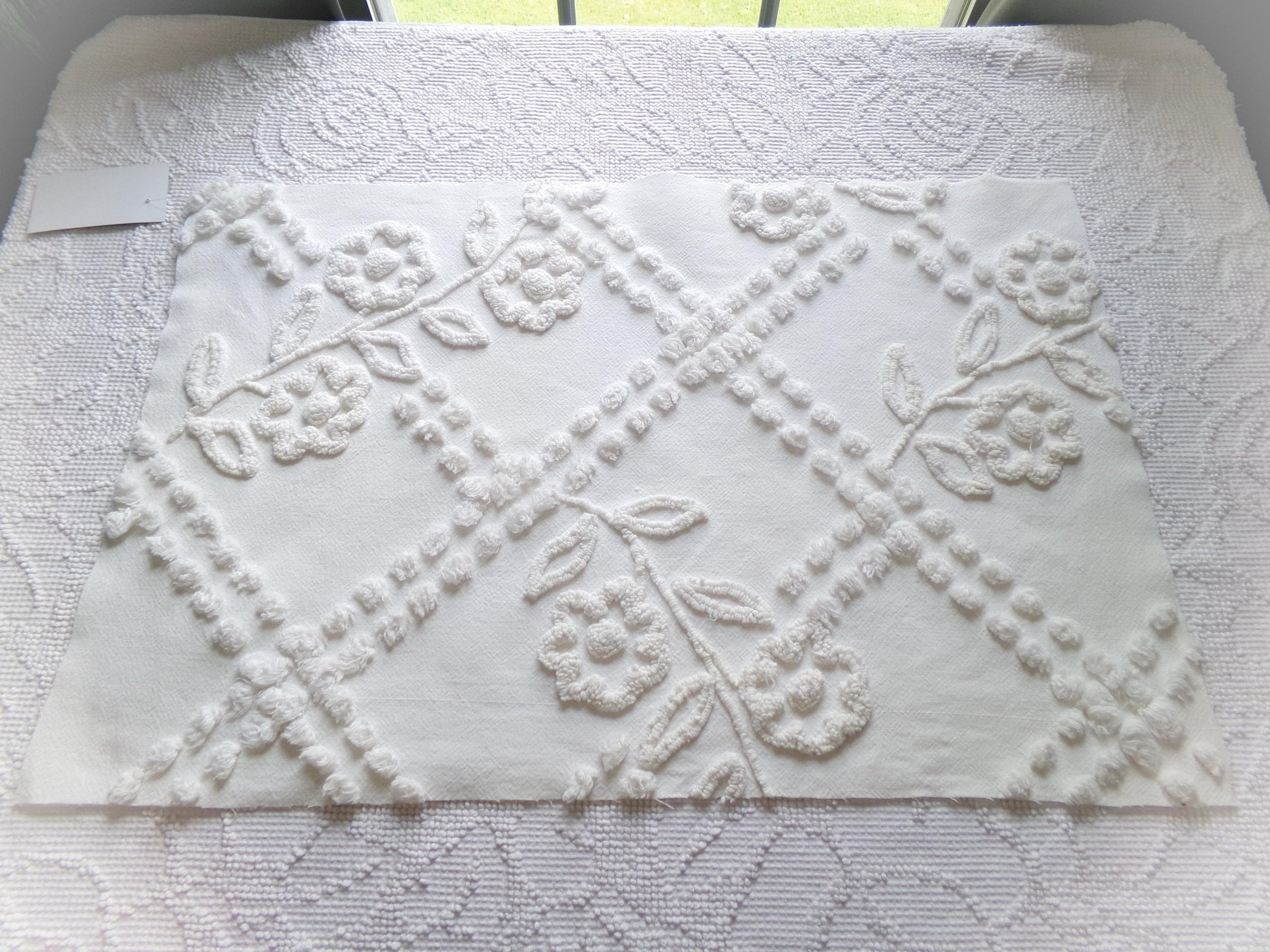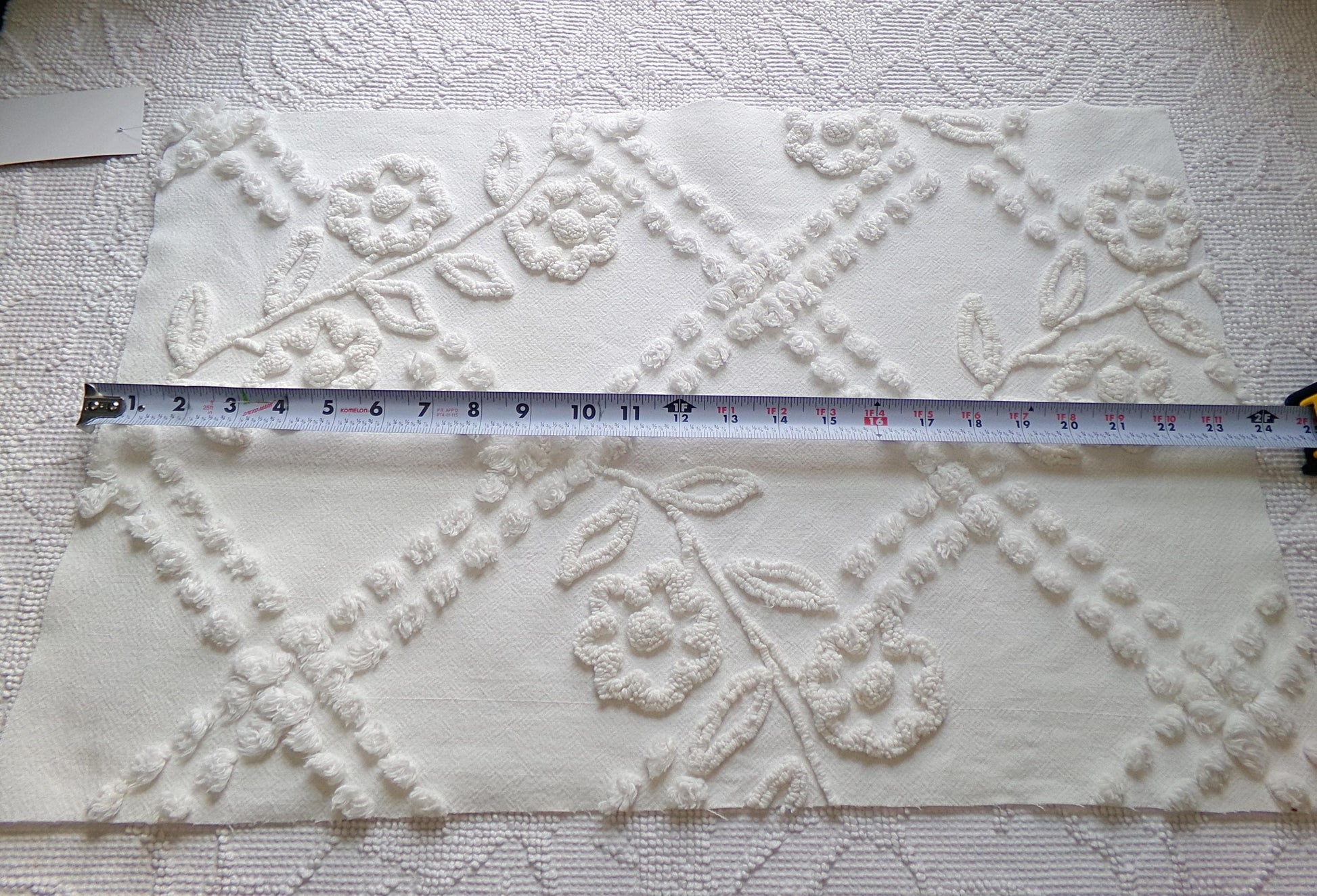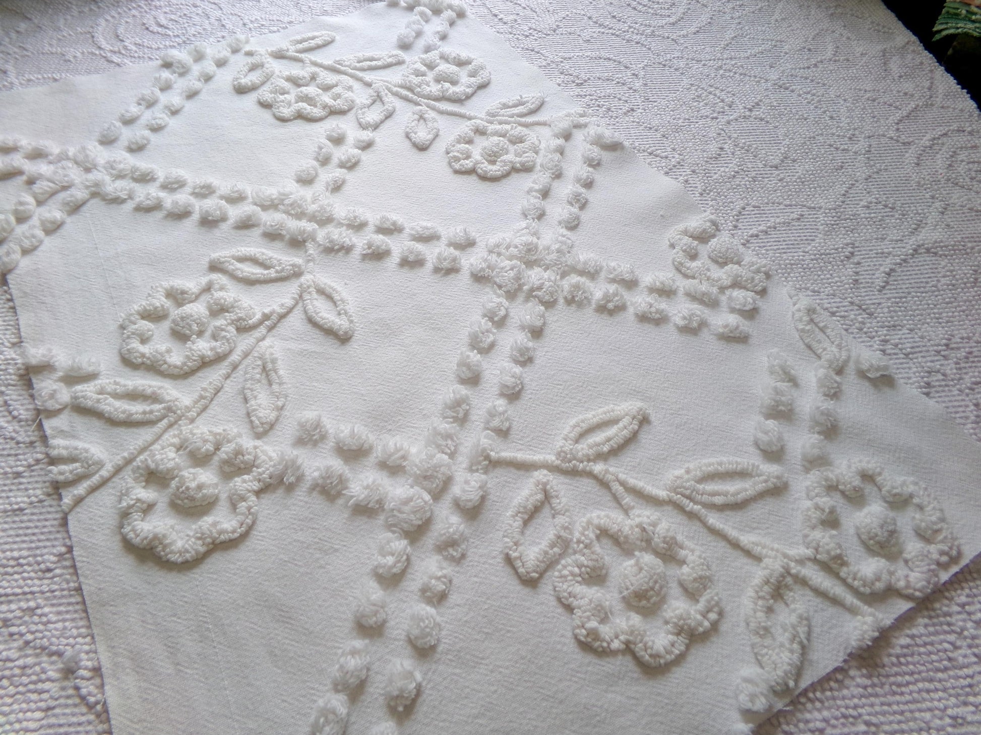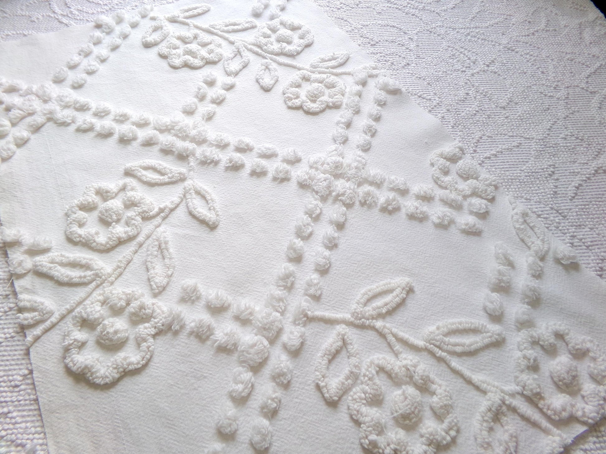 see more, cottagedivine.comBeautiful piece of white vintage chenille fabric ideal to upcycle in small sewing projects and crafting. Features a vining floral design emphasized by intersecting double dot lines. 100% cotton. Note a light area of age color variance, pinhole as seen final img.