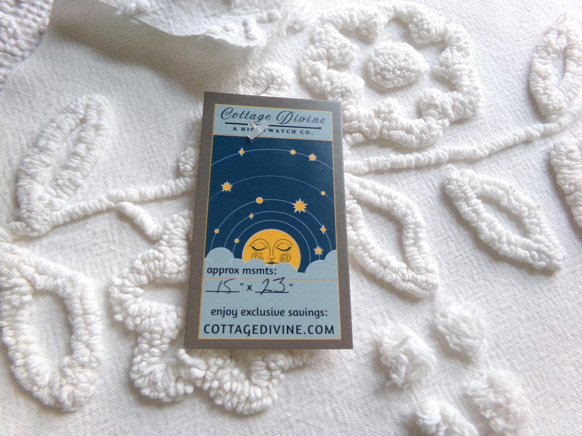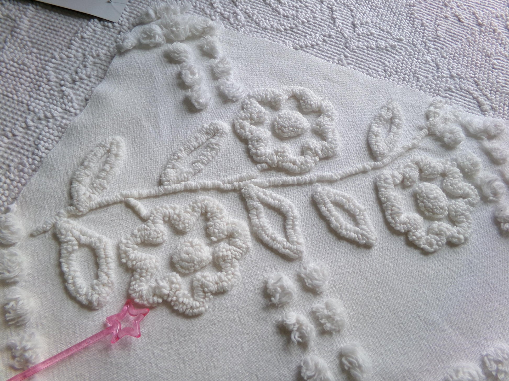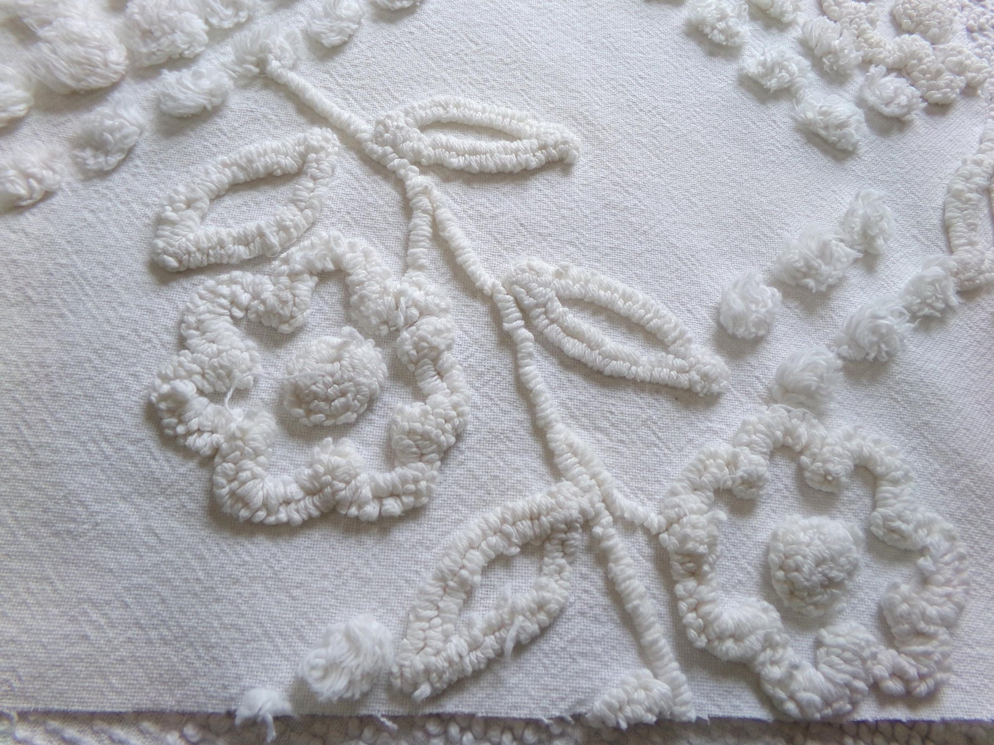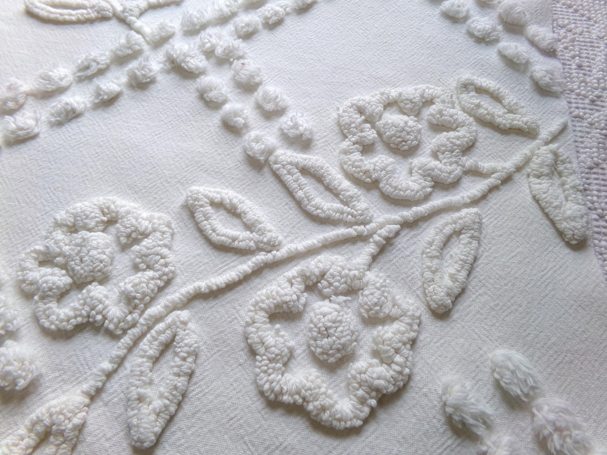 see more, cottagedivine.comBeautiful piece of white vintage chenille fabric ideal to upcycle in small sewing projects and crafting. Features a vining floral design emphasized by intersecting double dot lines. 100% cotton. Note a light area of age color variance, pinhole as seen final img.