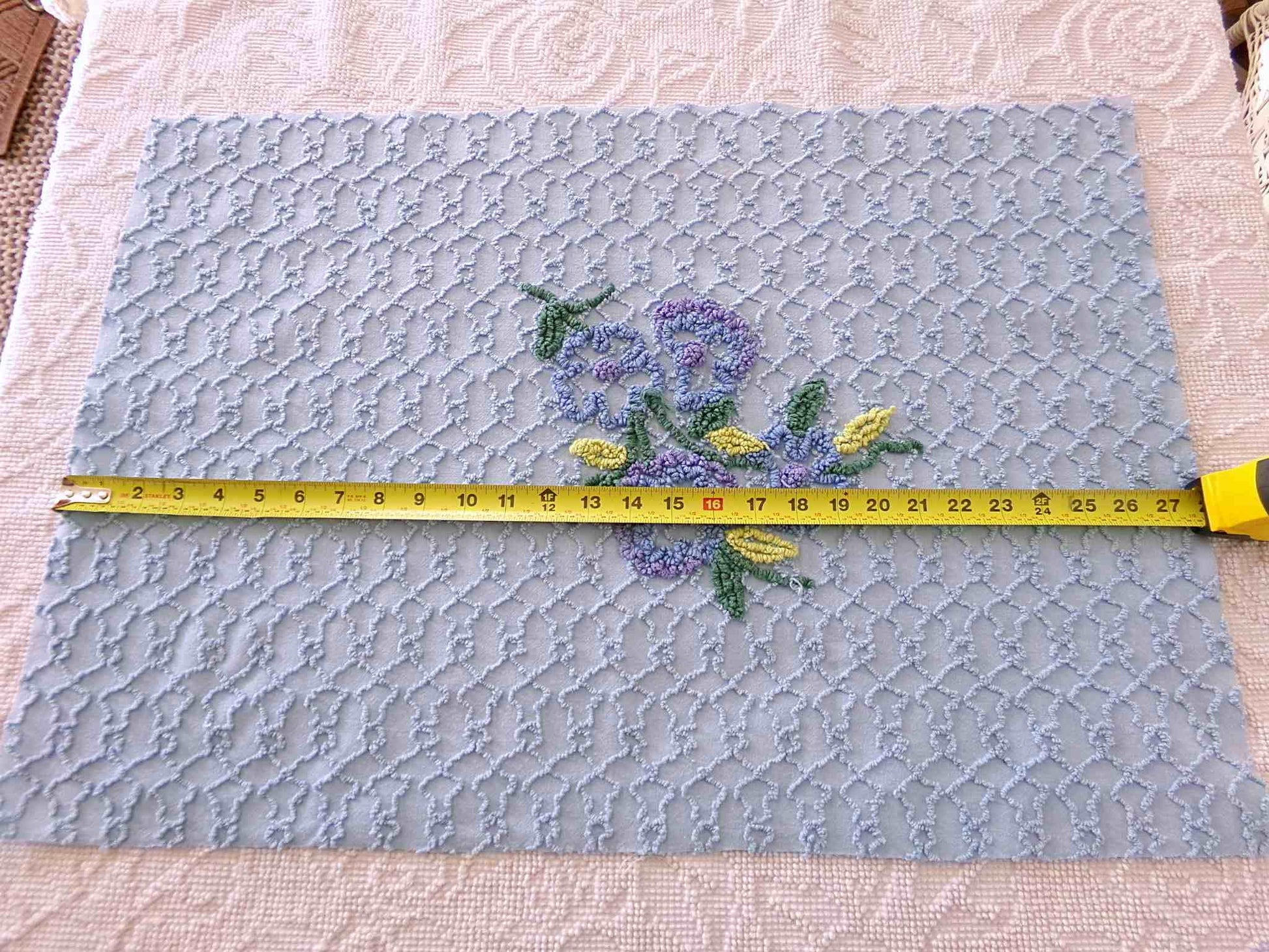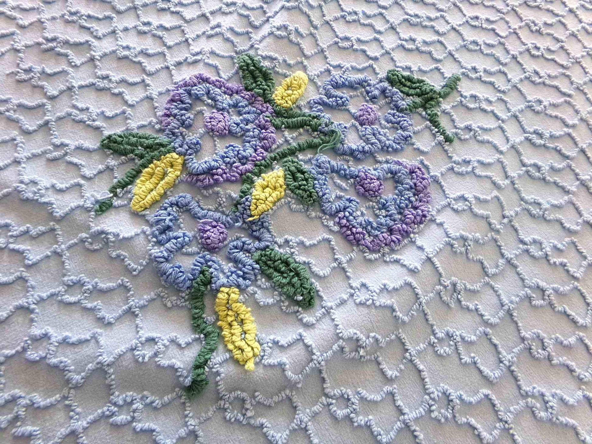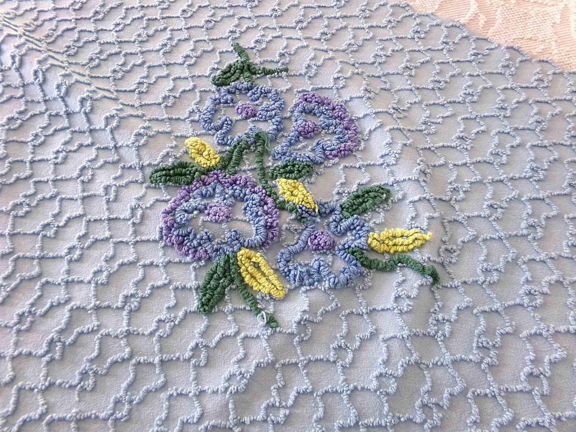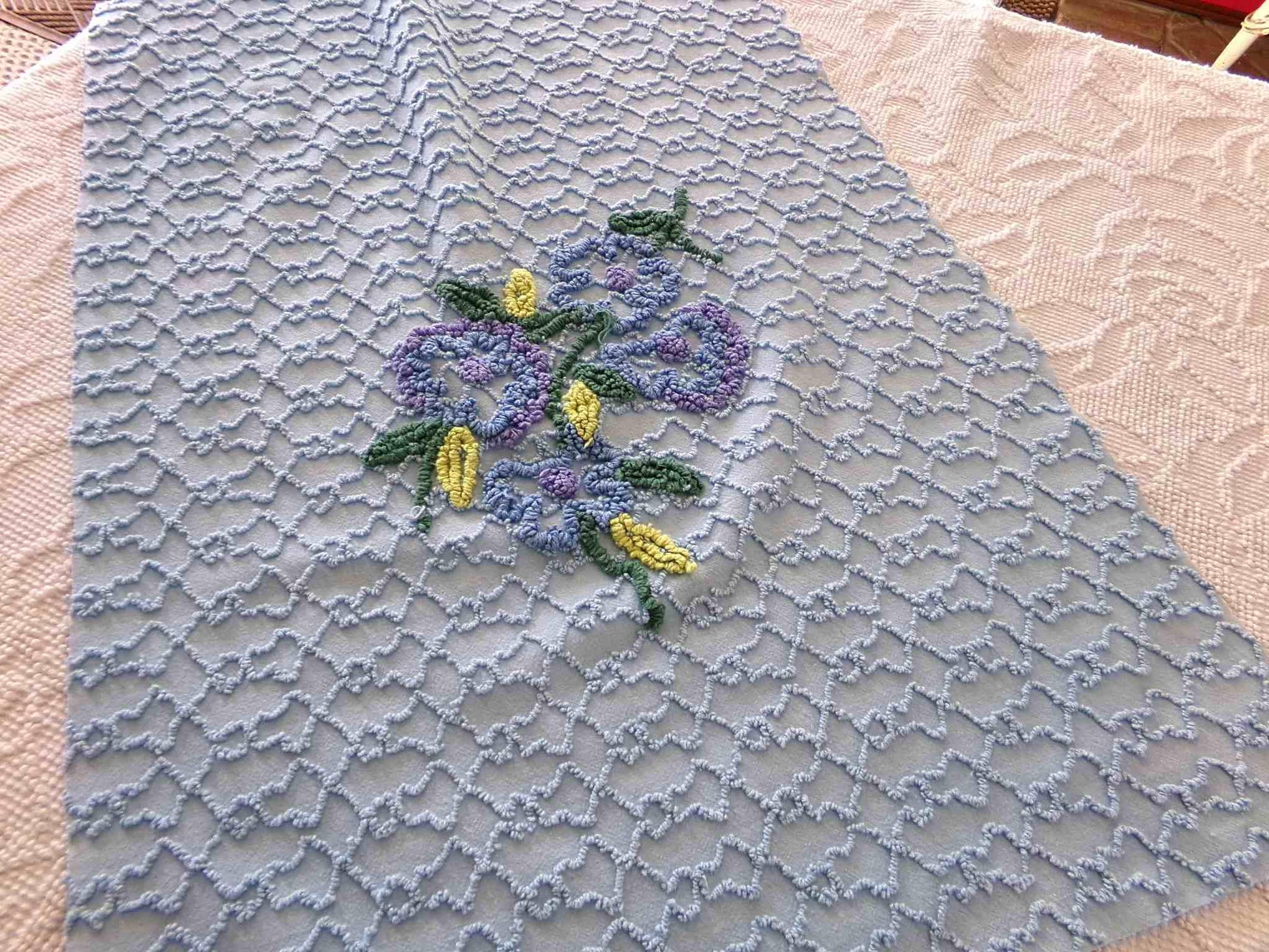 This uniquely colored piece of vintage chenille fabric is in a soothing midnight blue shade, a rare find from vintage maker Cabin Crafts. A texturized chain link design surrounds a cluster of tufted florals in beautiful coordinating colors.Piece measures approx 27" x 18" inches. Please be sure to study the placement of the floral motif if it is important to your design, as it is not perfectly centered. 100% lite cotton, strong for all your sewing and craft projects. May have minor skipped needletufting.