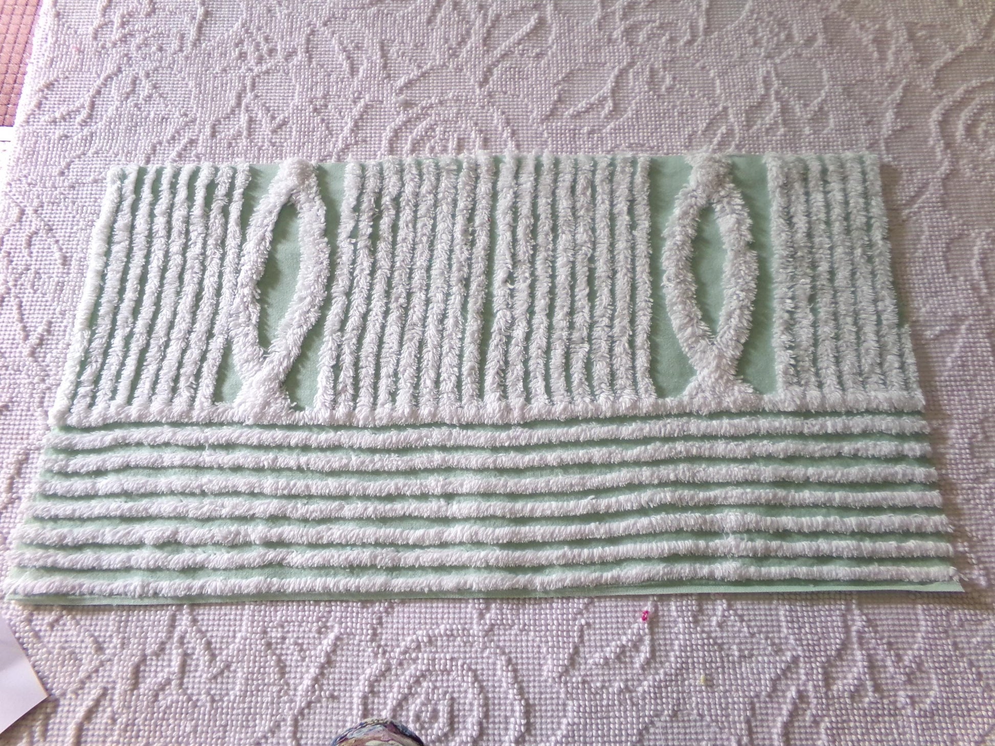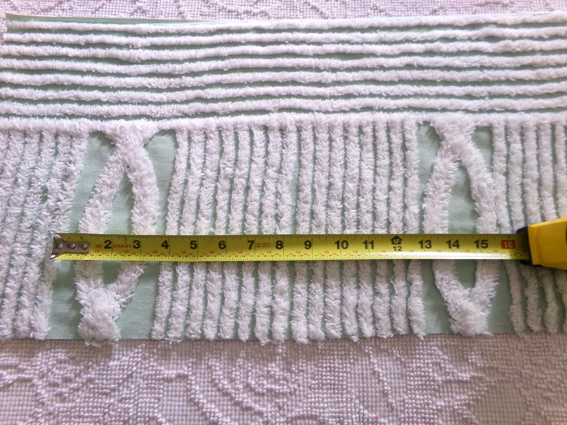 Unique piece of vintage chenille fabric, featuring a contrast design of white stripes with a pair of geometric designs. Set on a pretty mint green bkgdMeasures about 12" x 22" inches. 100% cotton; easy to sew with.Vintage fabric is an easy way to breathe new life into your creative design. Chenille especially offers a special charm and unique history. From small decor projects to handmade quilts, there are endless possibilities for repurposing and upcycling these beautiful textiles.