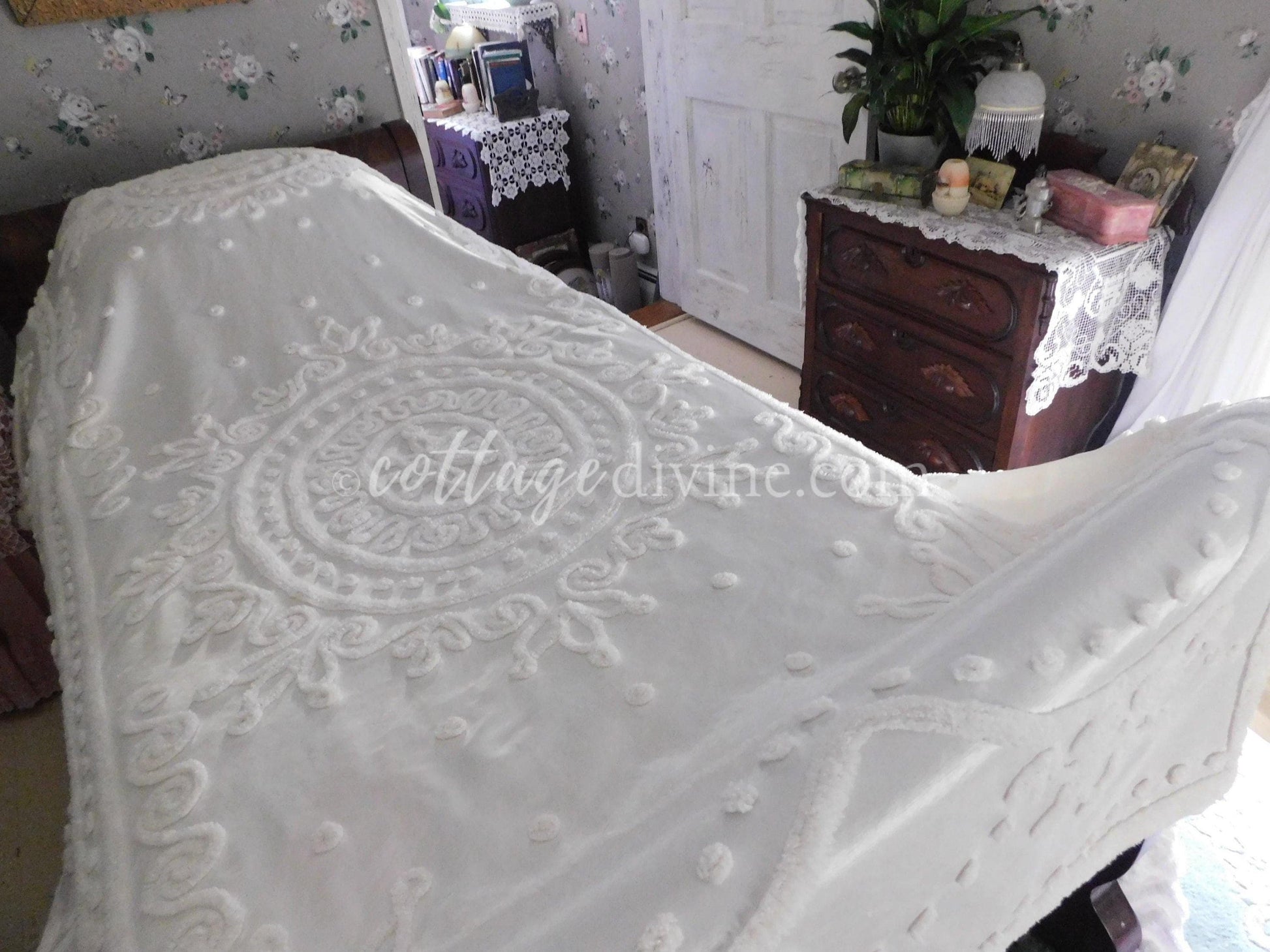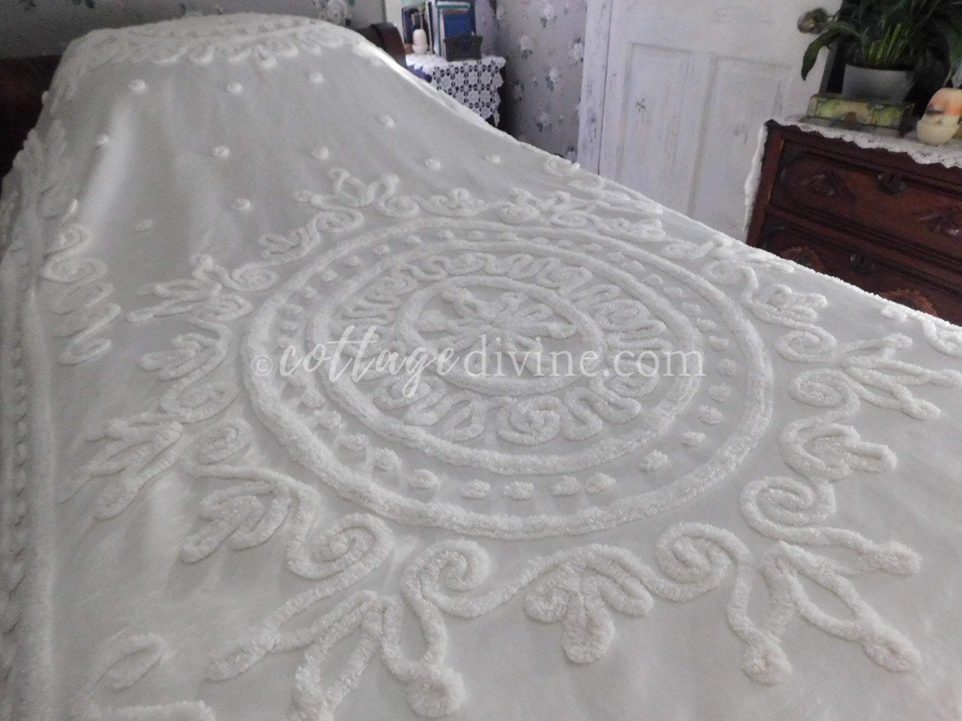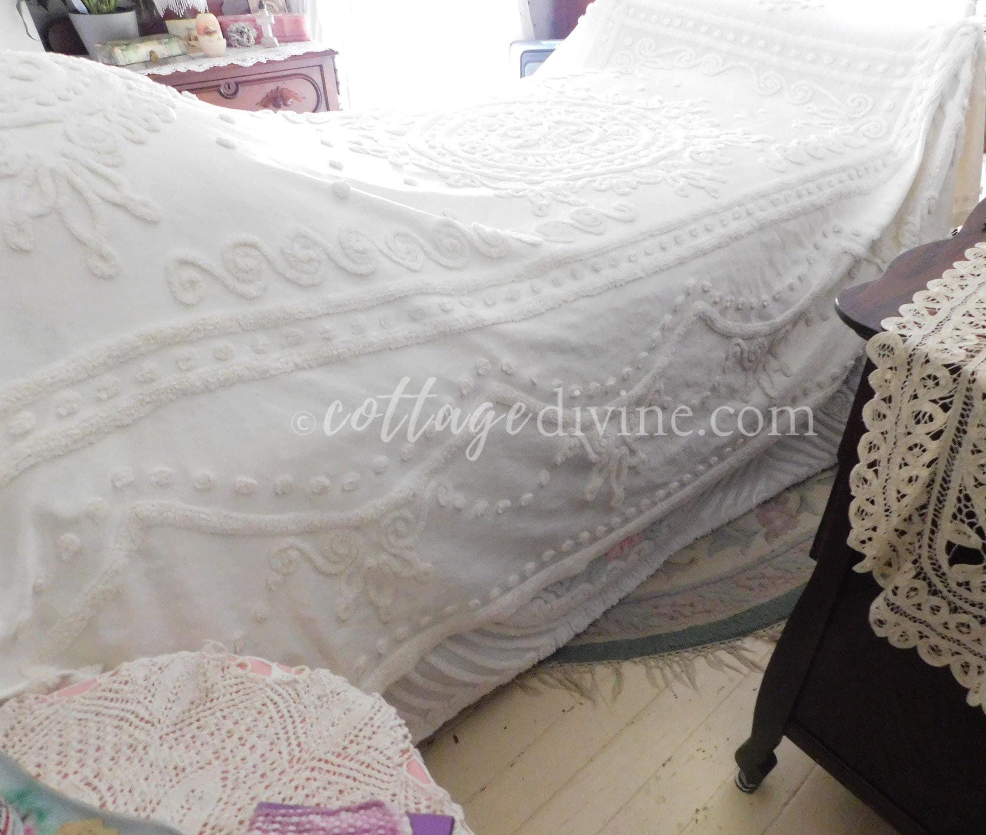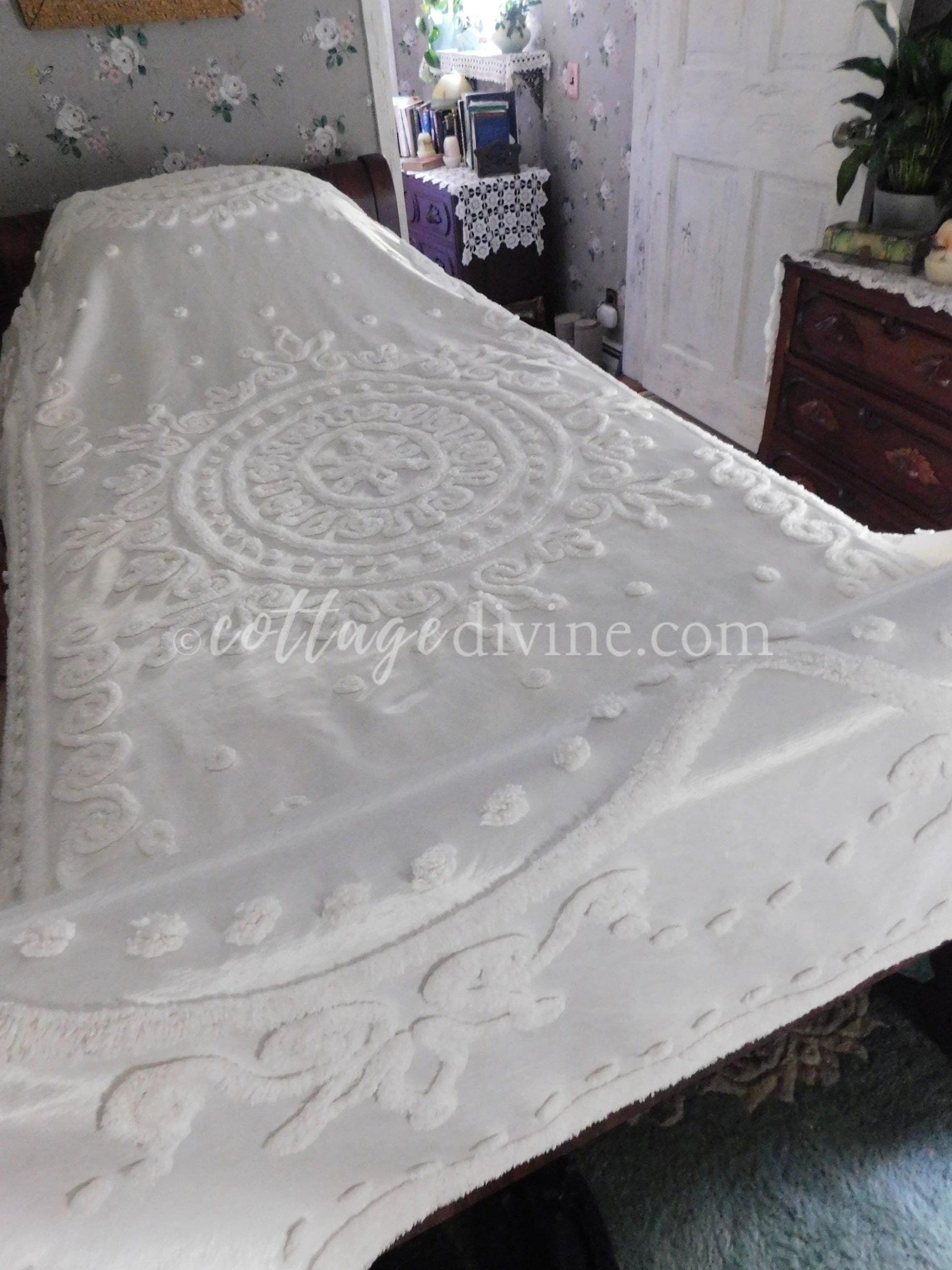 Shabby chic. Cottage style. Farmhouse chic. The Cottage Divine specializes in a blend of all three, emphasizing a curated selection of chenille bedspreads, robes, fabric, quilt squares & moreWhy vintage chenille? Because of its availability in an endless array of colors & textures...its unique ability to adapt to both vintage and modern settings...Wherever it is incorporated, chenille infuses an unmatched warmth & nostalgiaOh, one little mention: once it enchants you, a single piece of chenille will quickly multiply - and you'll never quite have enough 🌷