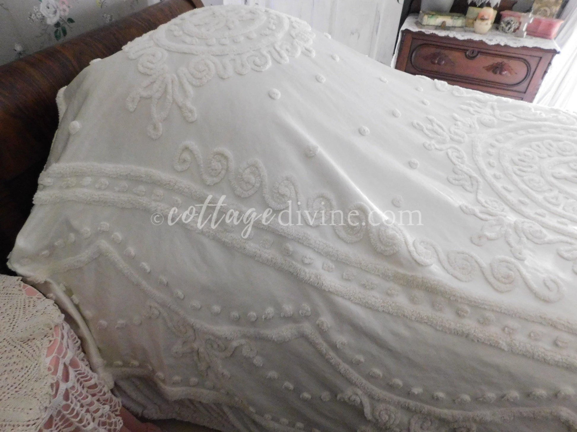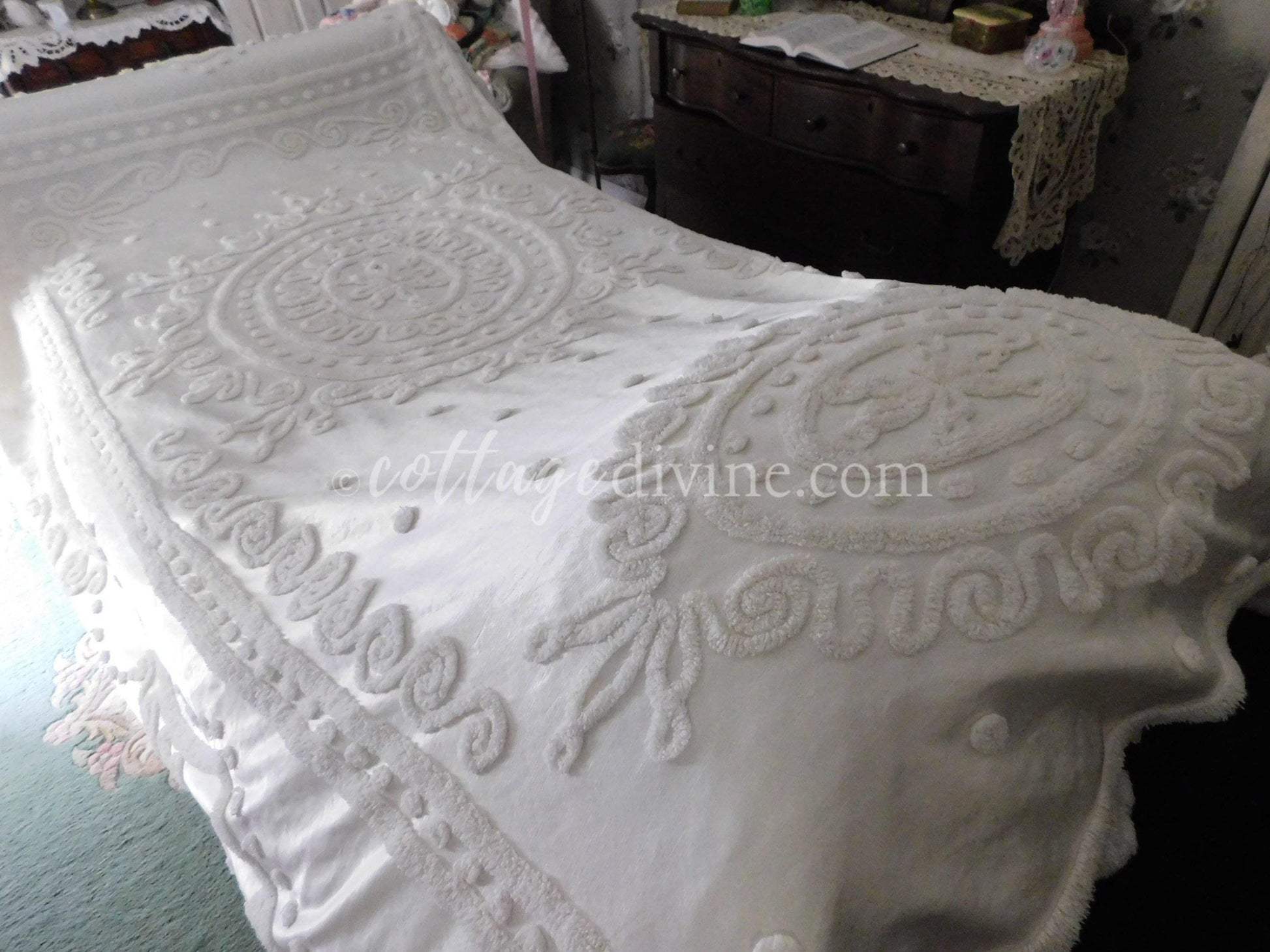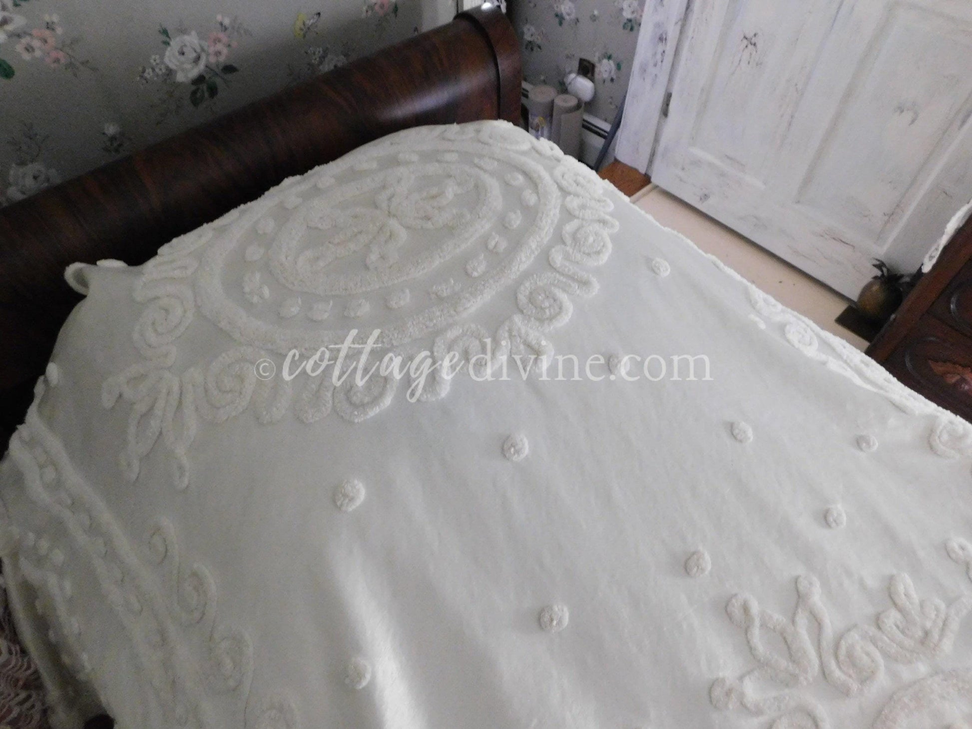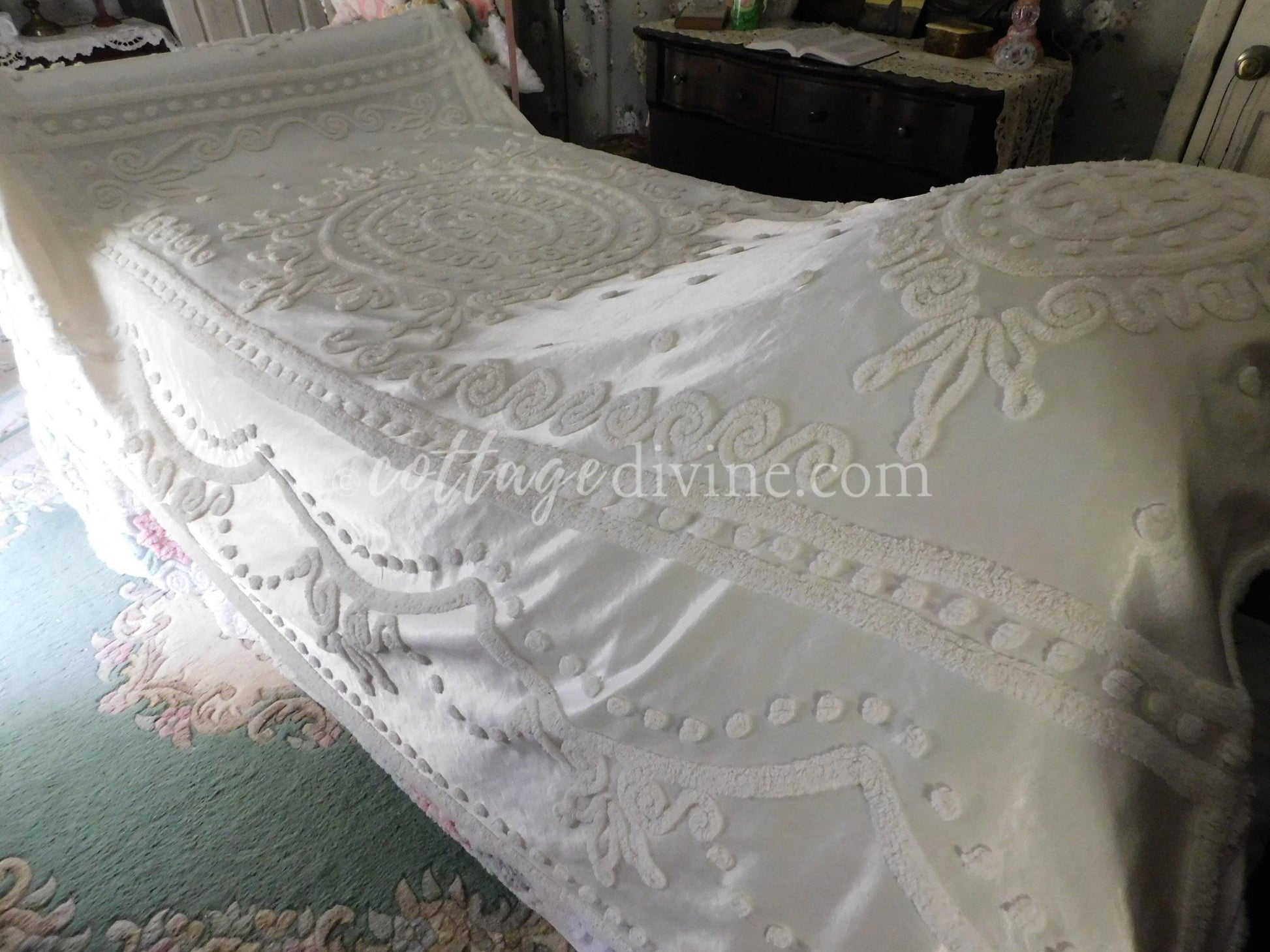 Shabby chic. Cottage style. Farmhouse chic. The Cottage Divine specializes in a blend of all three, emphasizing a curated selection of chenille bedspreads, robes, fabric, quilt squares & moreWhy vintage chenille? Because of its availability in an endless array of colors & textures...its unique ability to adapt to both vintage and modern settings...Wherever it is incorporated, chenille infuses an unmatched warmth & nostalgiaOh, one little mention: once it enchants you, a single piece of chenille will quickly multiply - and you'll never quite have enough 🌷