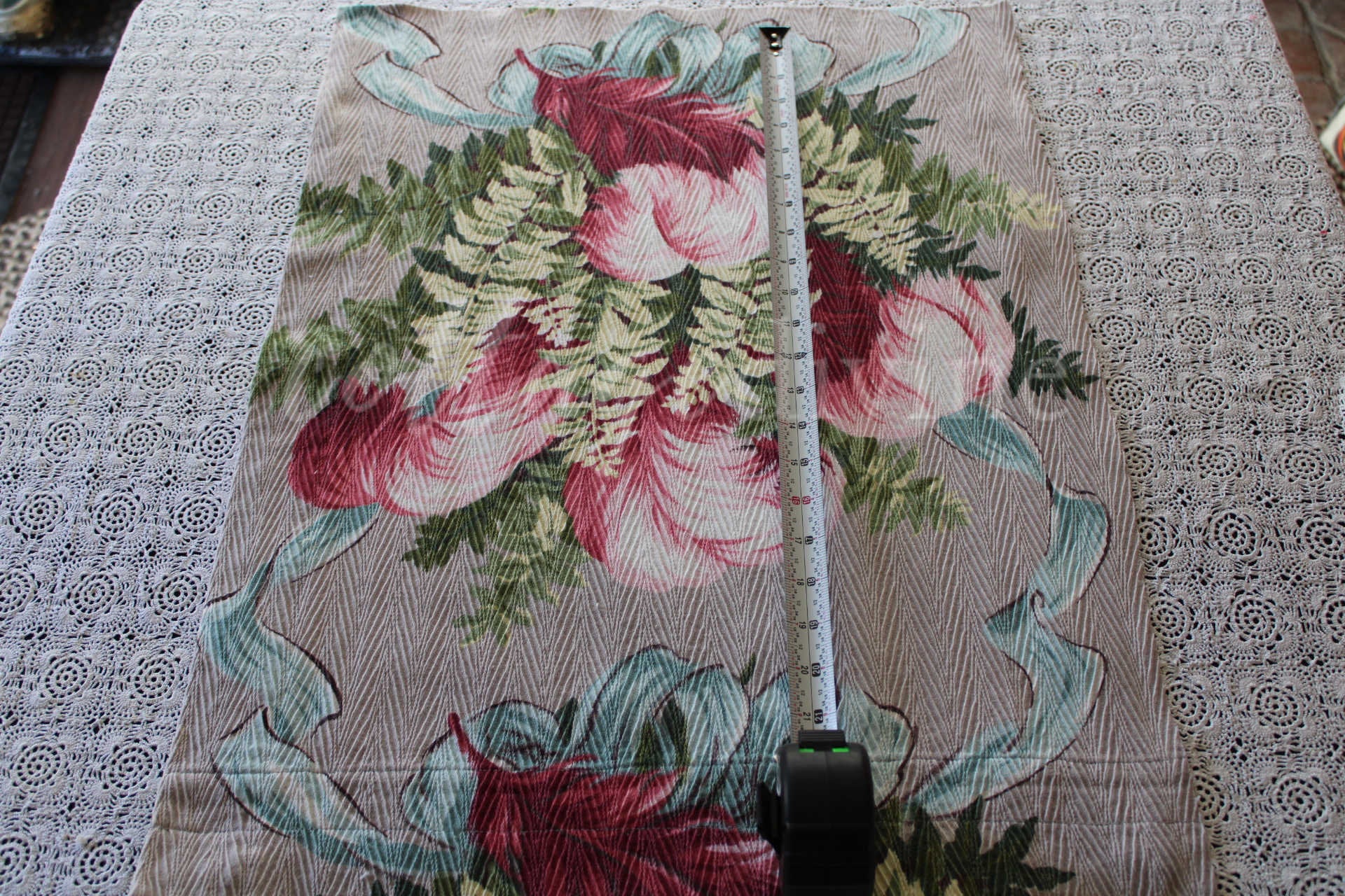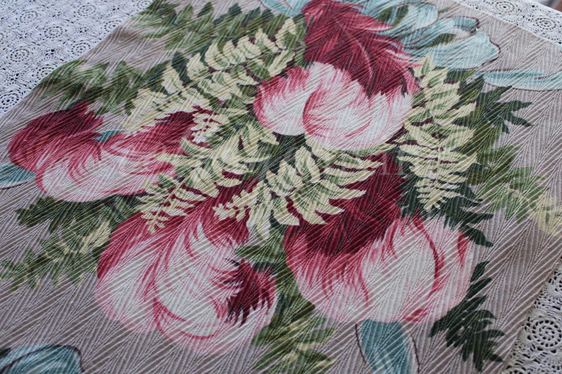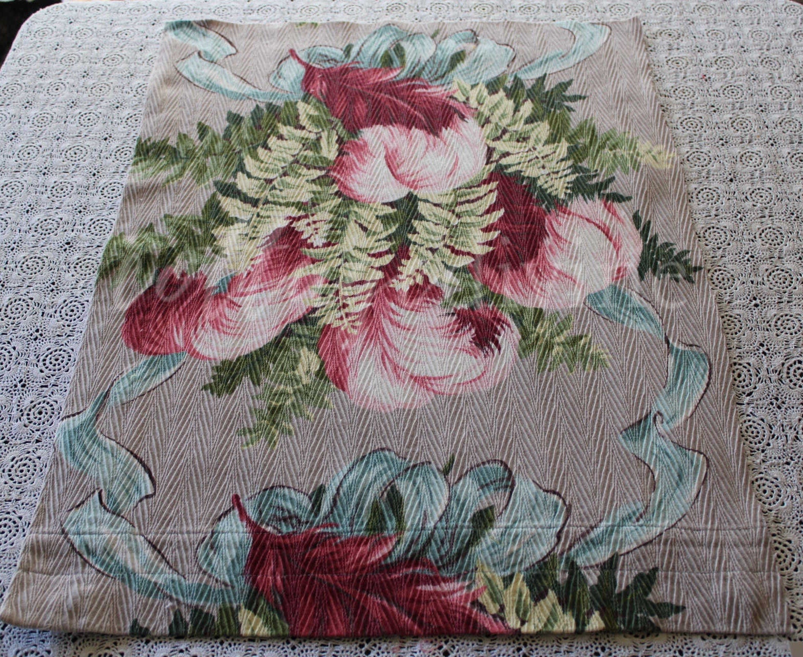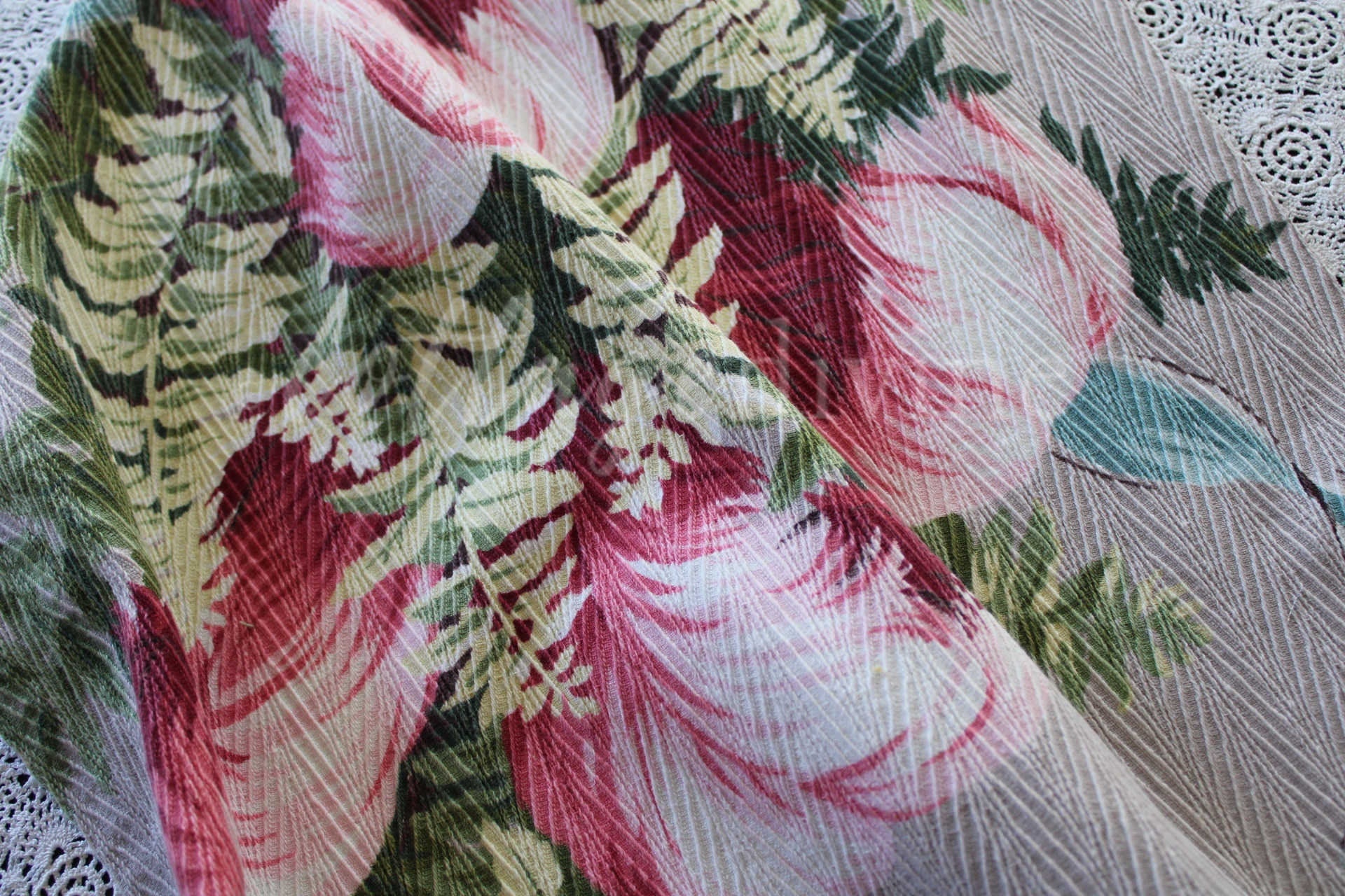 Absolutely gorgeous piece of vintage barkcloth fabric, salvaged from an original 1940s era curtain panel. This beautiful piece of textile history features a large, showy botanical pink plume against cool grey.And the texture? Divine. See closeup img #5 showing incredible texturized groundclothIdeal for DIY pillow designs to add instant tropical vibes. Measures approx 18" x 25" inches.Original hem present as seen final img. Few light age marks.