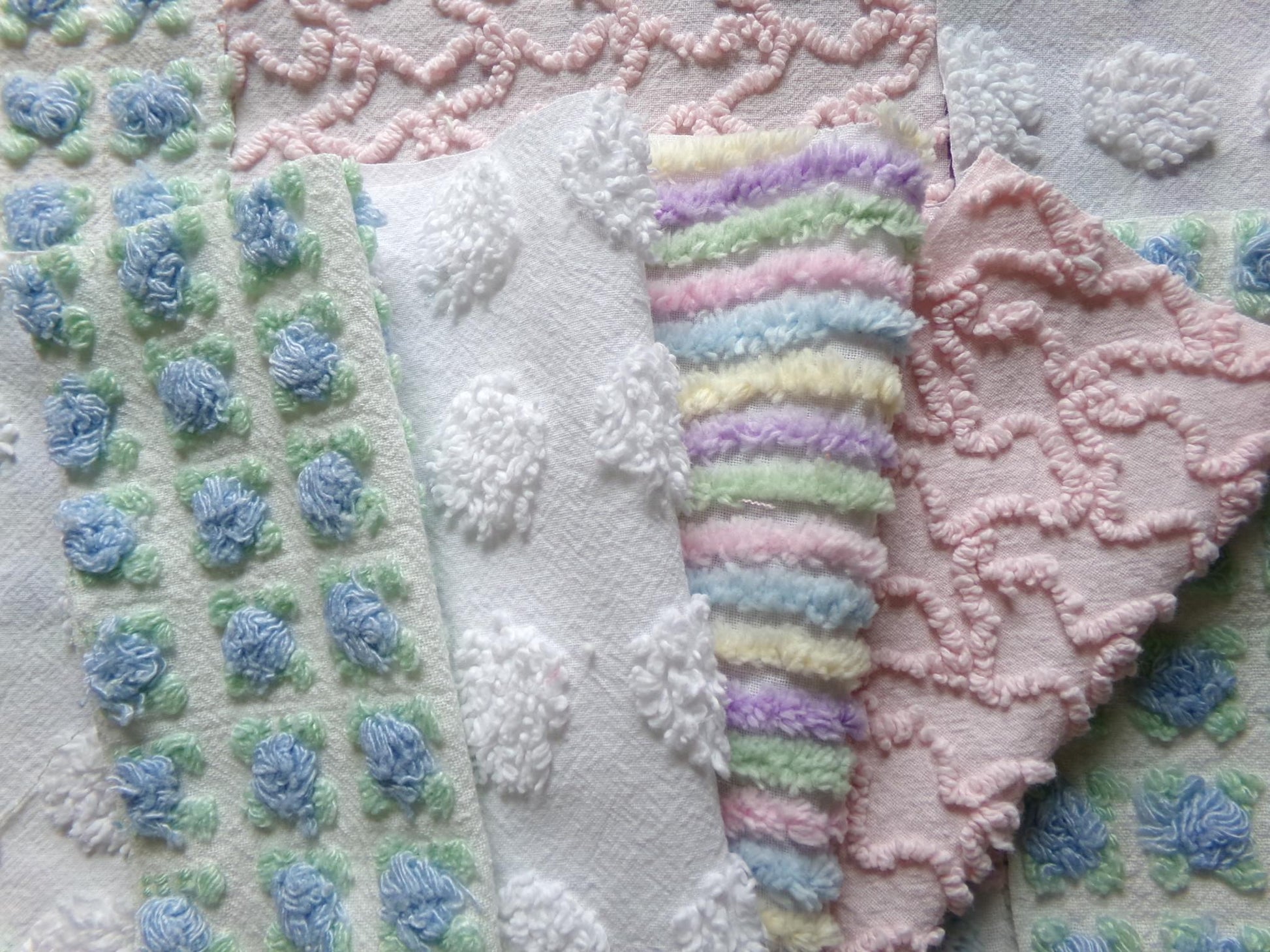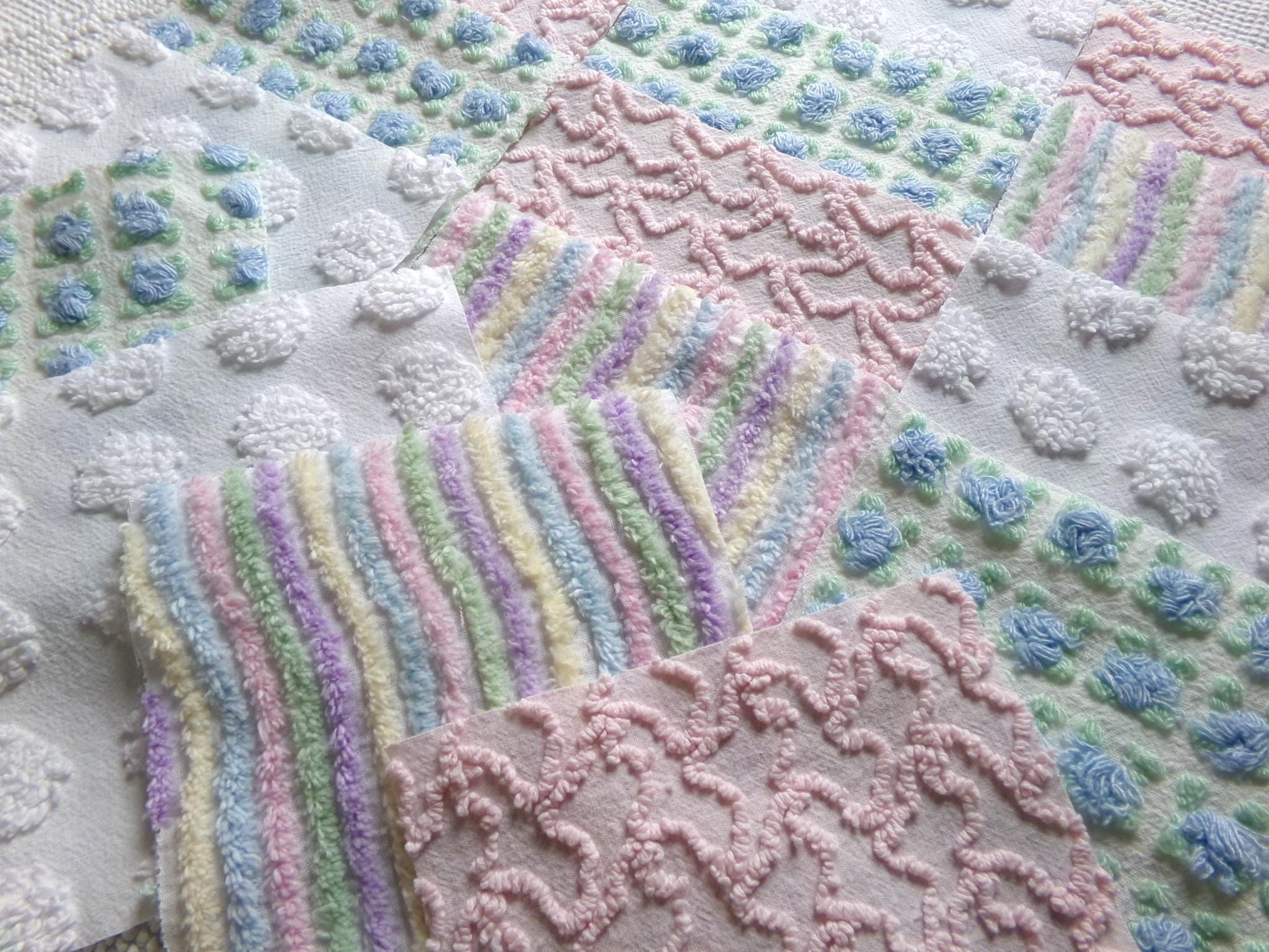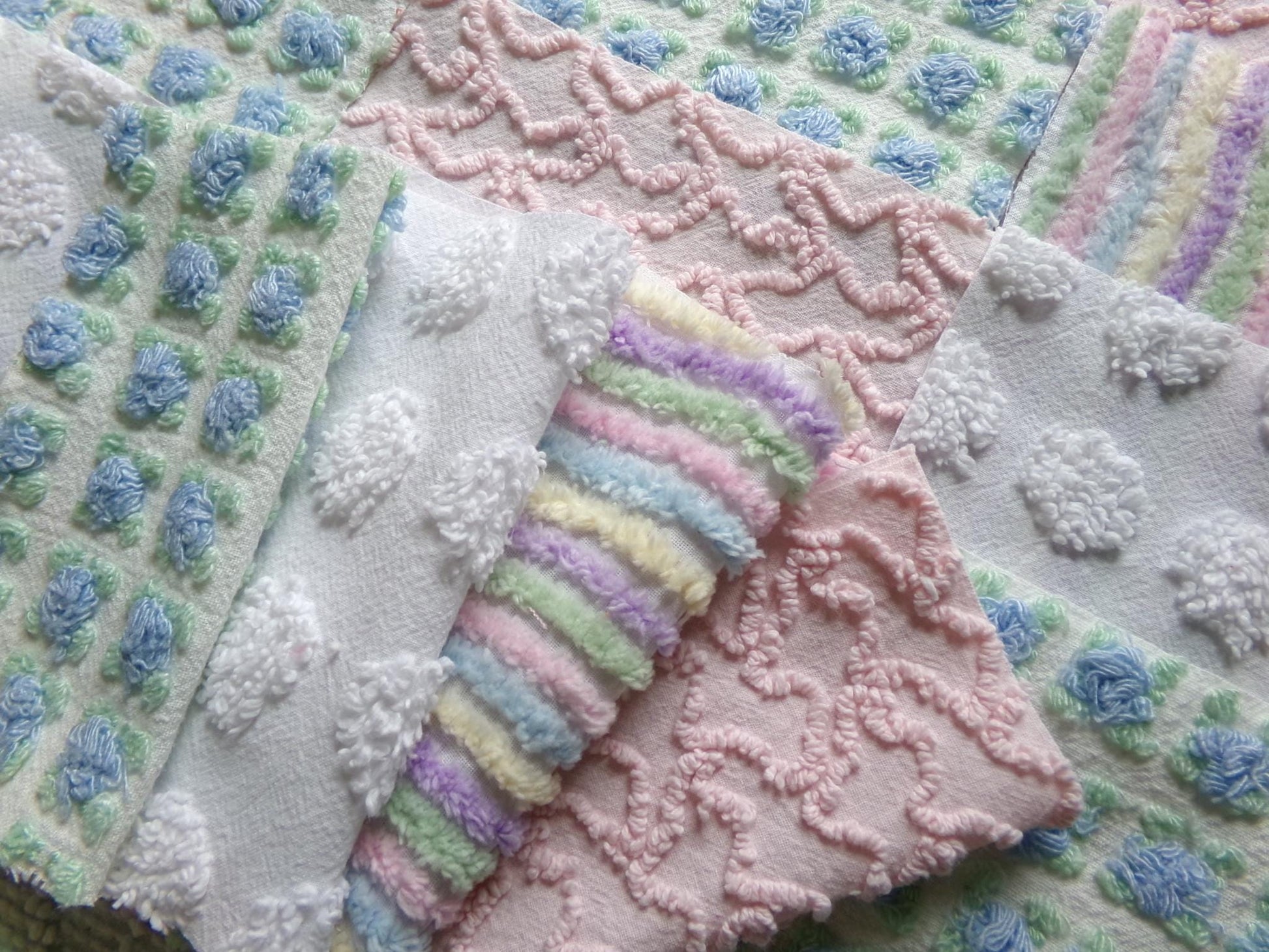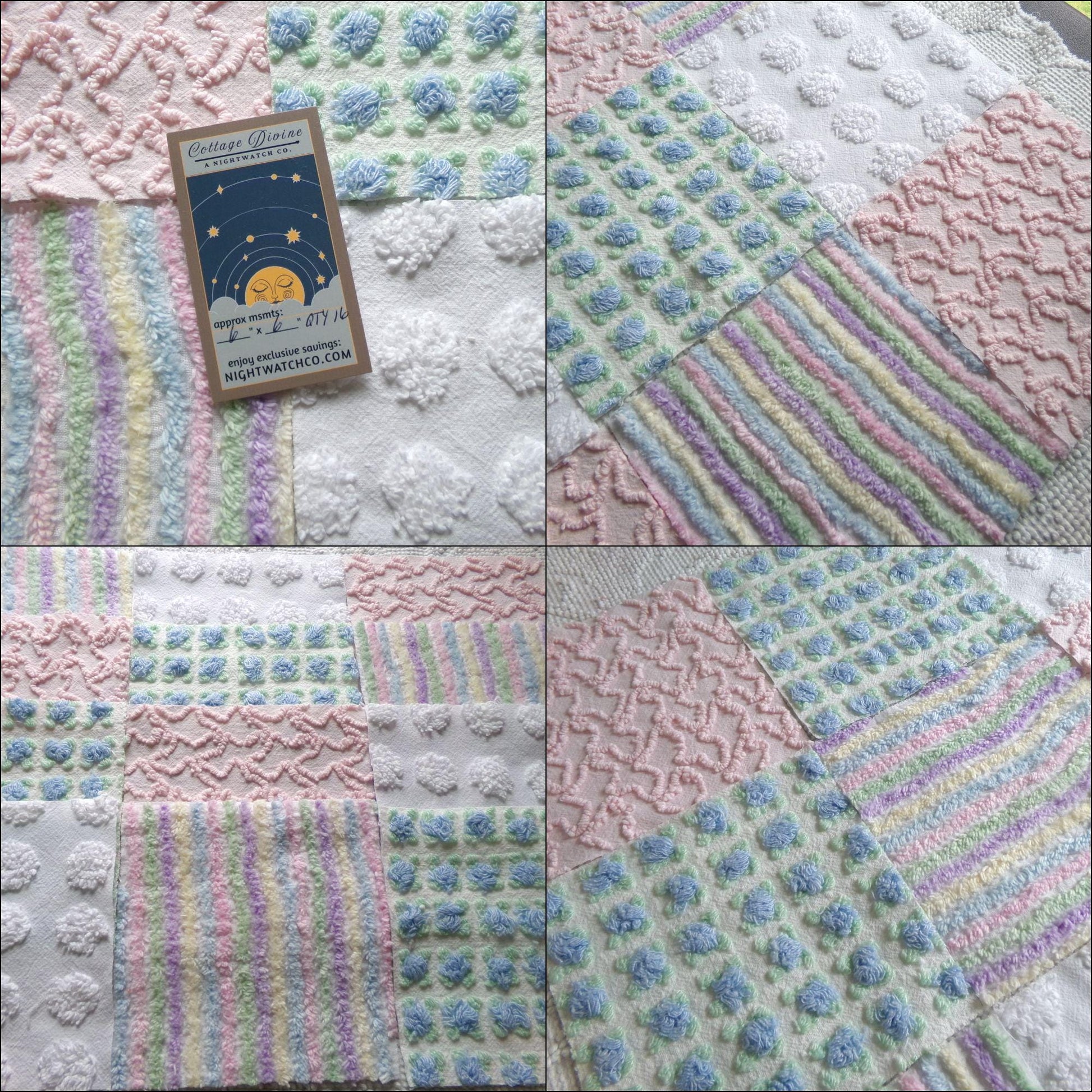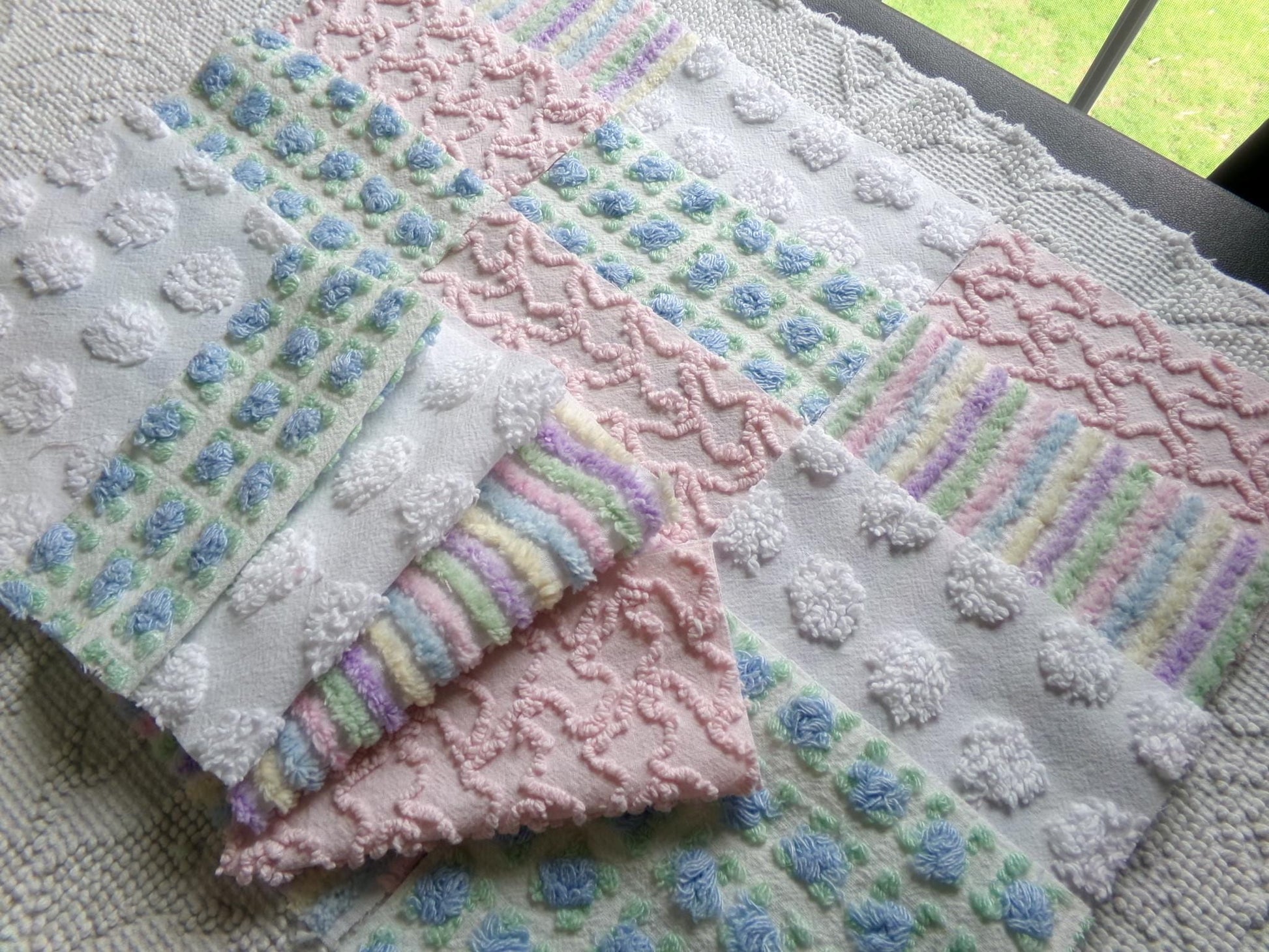 What will you create with this set of vintage chenille "fairy fantasy" fabric squares? I chose the colors to emphasize dreamy, gentle colors in soft pinks, pastel rainbow, cool white & serene blue. ✨You'll receive 4 of each pattern: blue rosebud, white coin pop, pastel rainbow stripe, pink squiggle