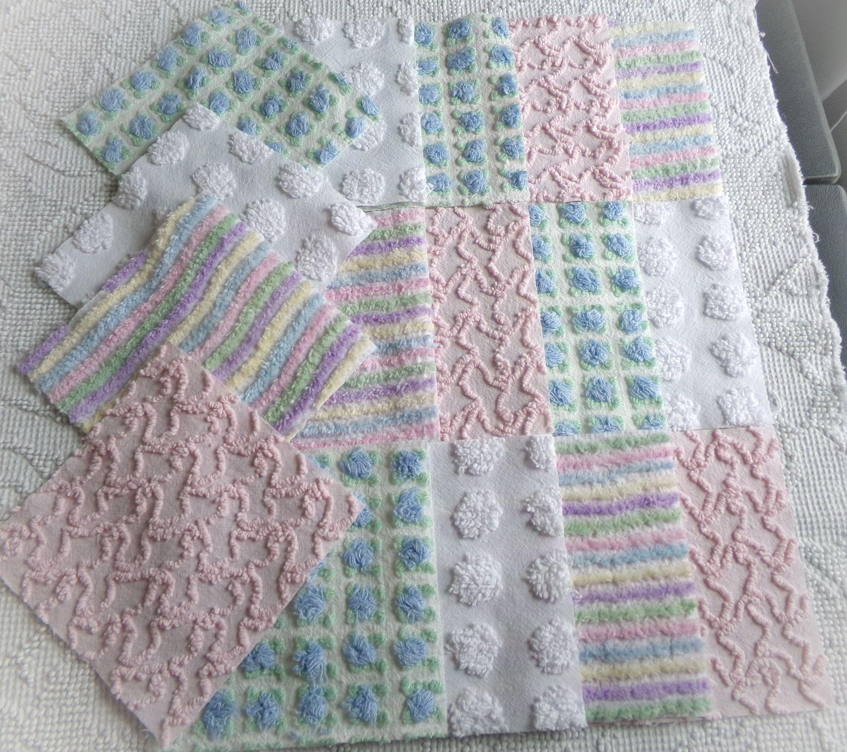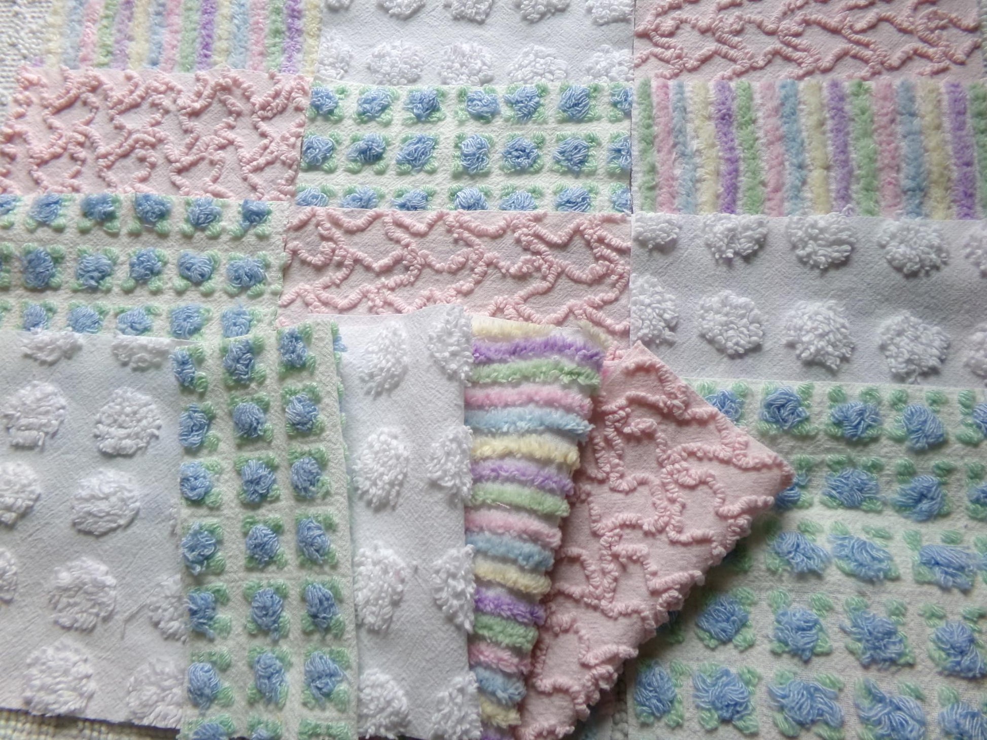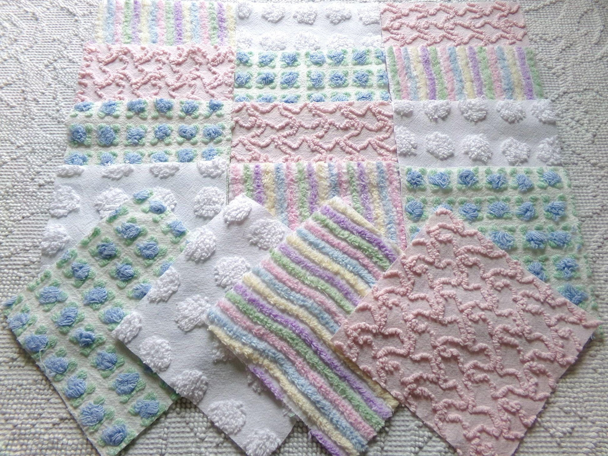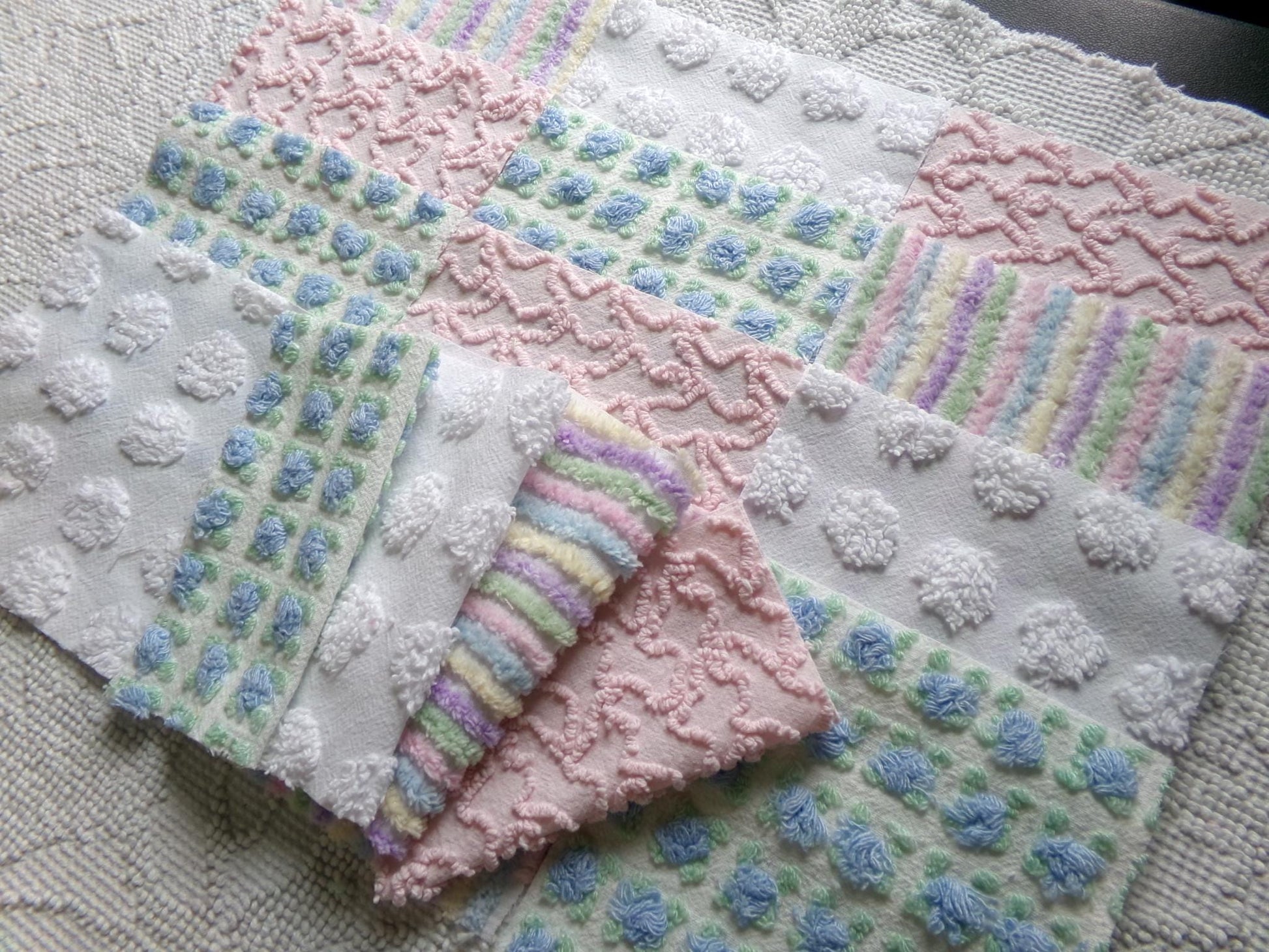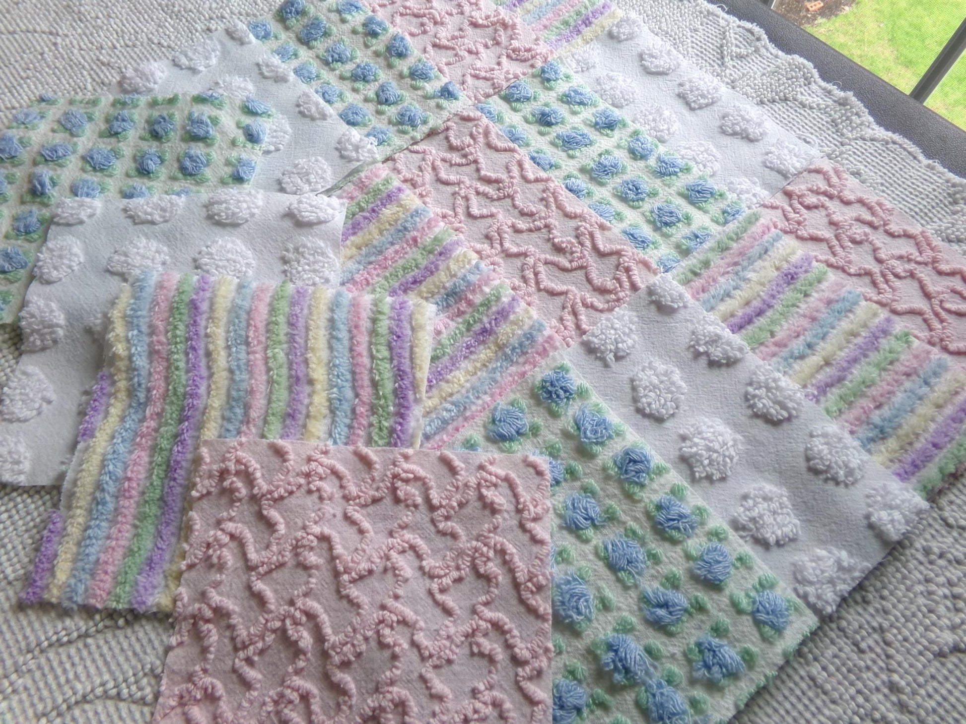 What will you create with this set of vintage chenille "fairy fantasy" fabric squares? I chose the colors to emphasize dreamy, gentle colors in soft pinks, pastel rainbow, cool white & serene blue. ✨You'll receive 4 of each pattern: blue rosebud, white coin pop, pastel rainbow stripe, pink squiggle
