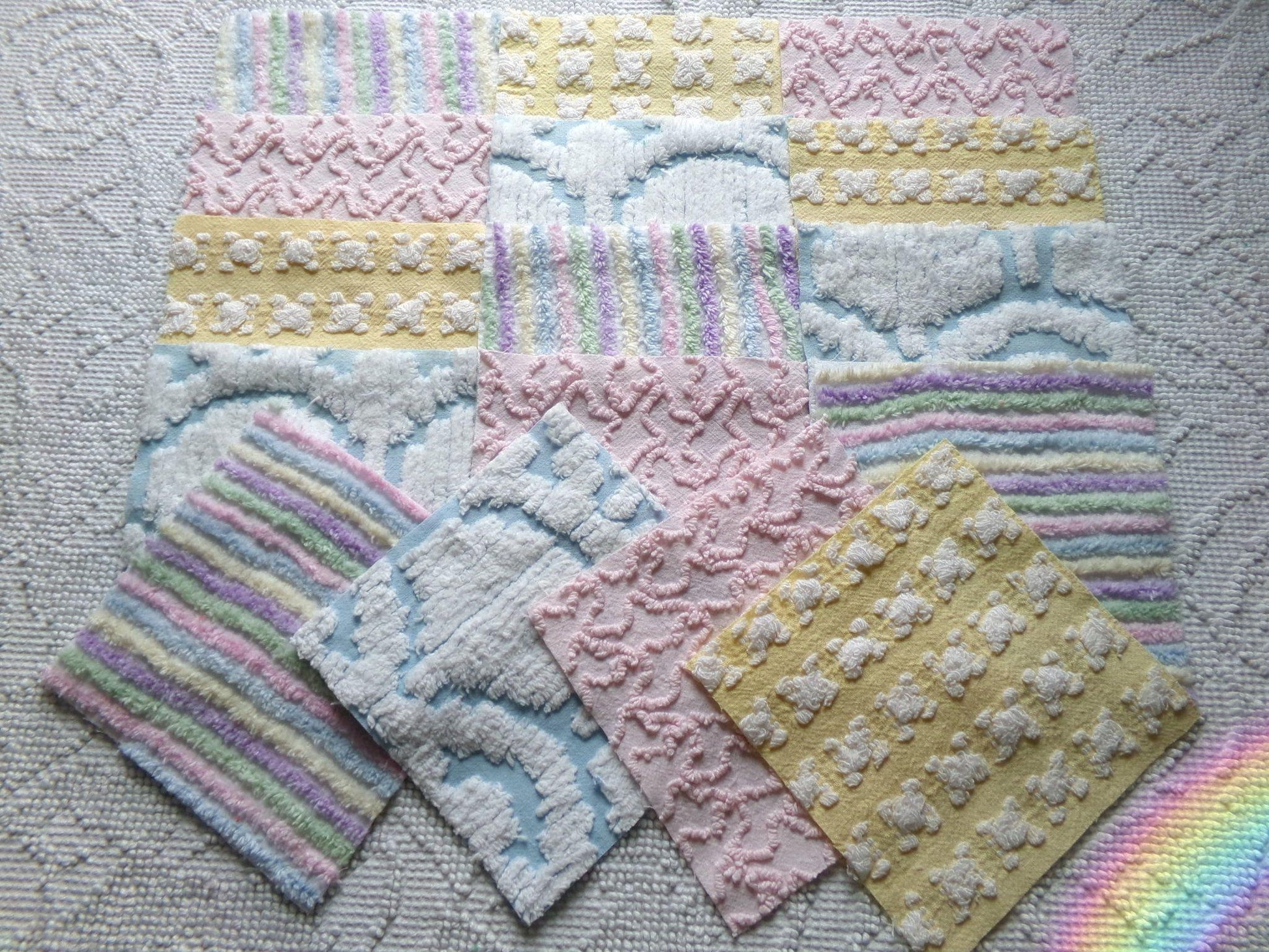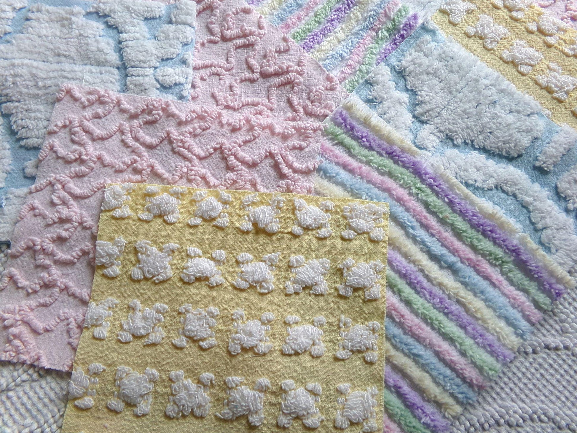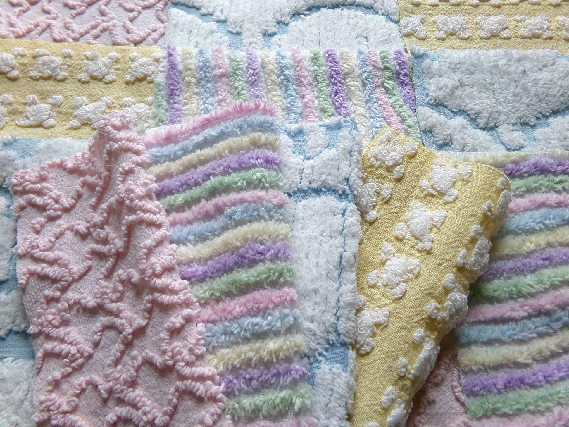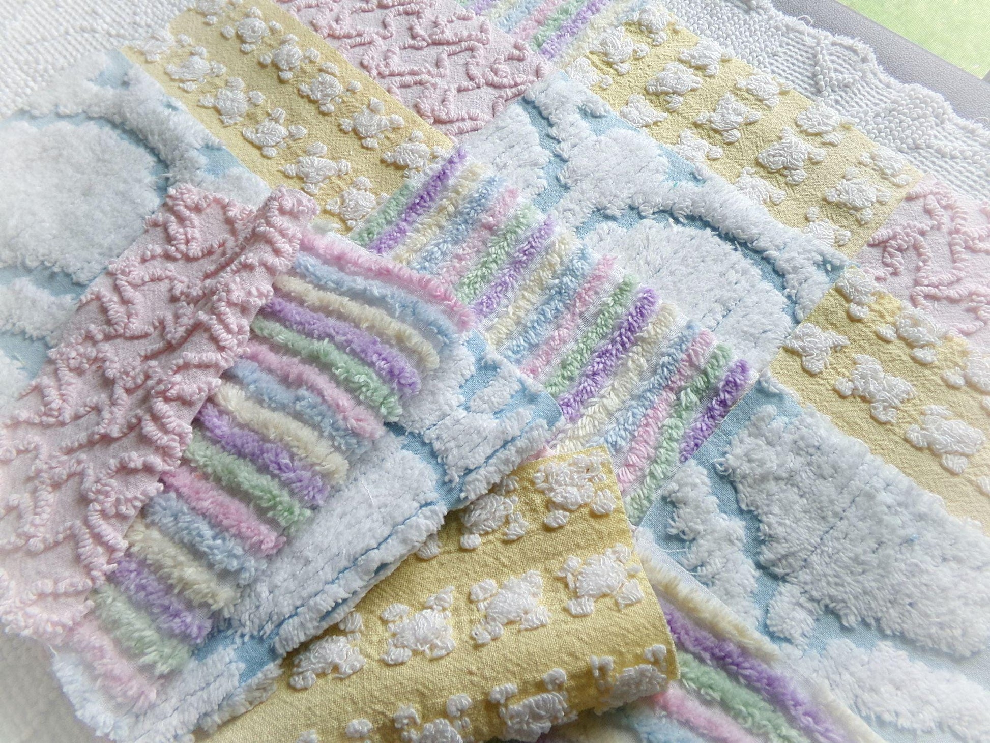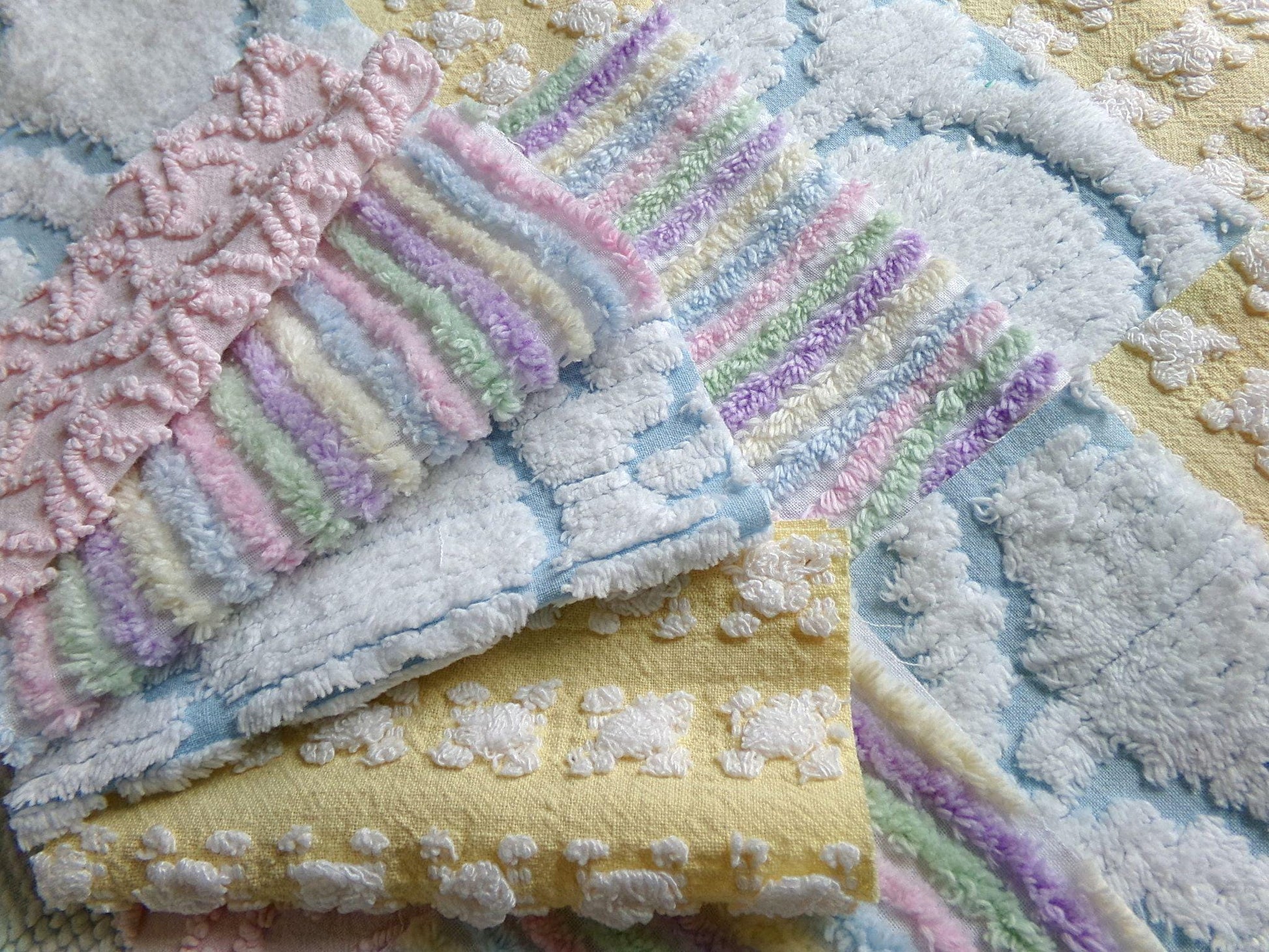 What will you create with this set of vintage chenille fabric squares? I chose the colors to emphasize dreamy, gentle colors of a rainbow in soft pinks, pastel rainbow, cool white & sunny yellow. ✨You'll receive 4 of each pattern: white on yellow rosebud, abstract white clouds on blue, pastel rainbow stripe, pink squiggle