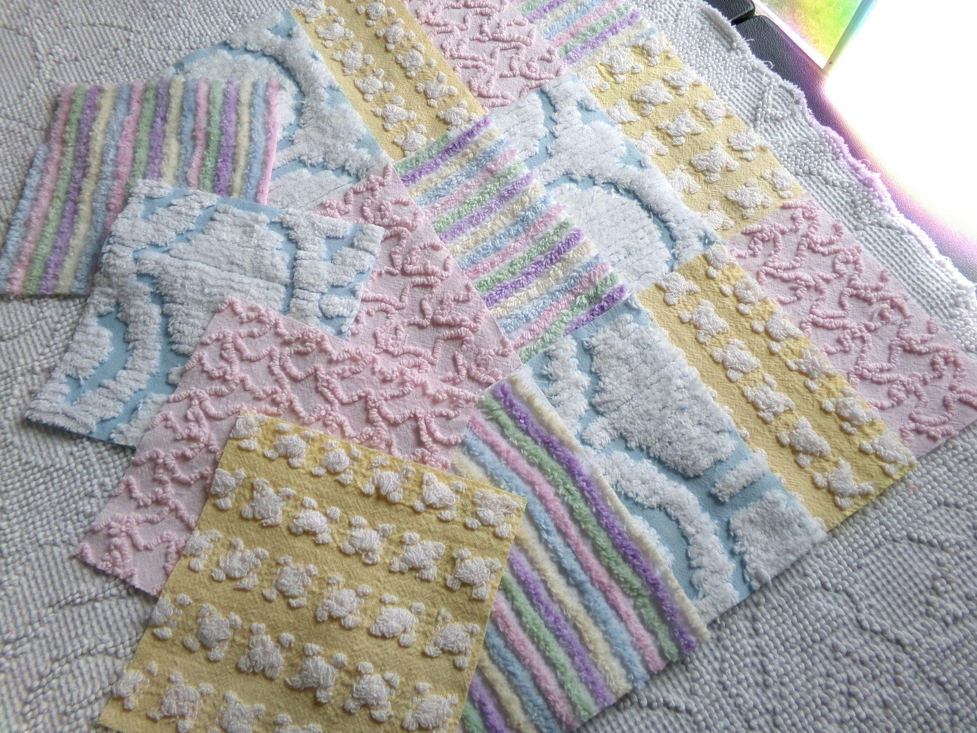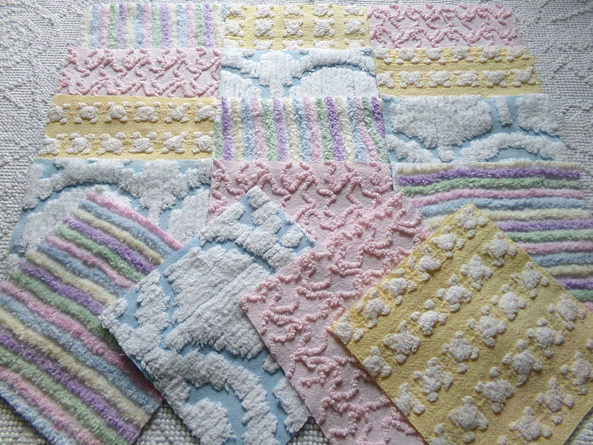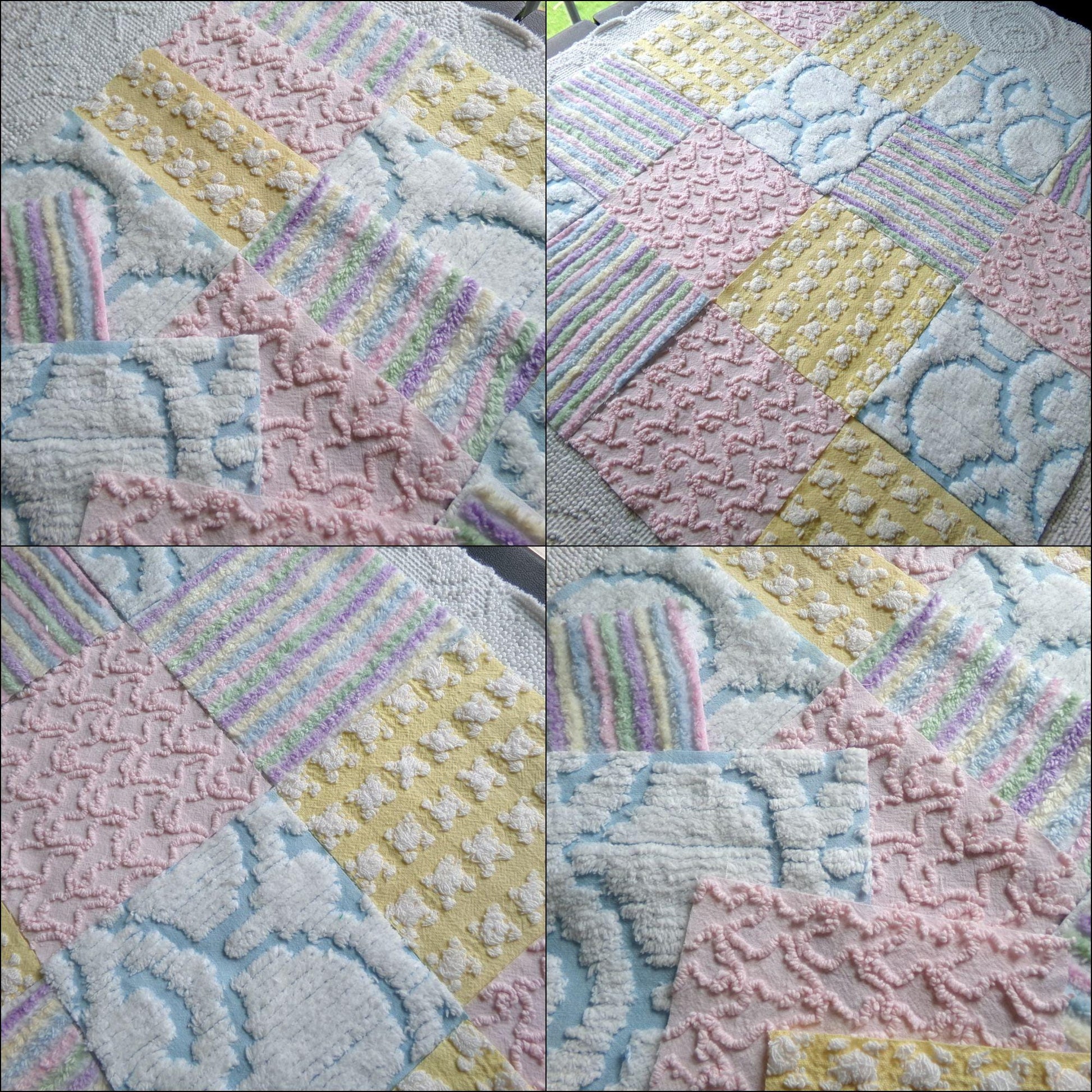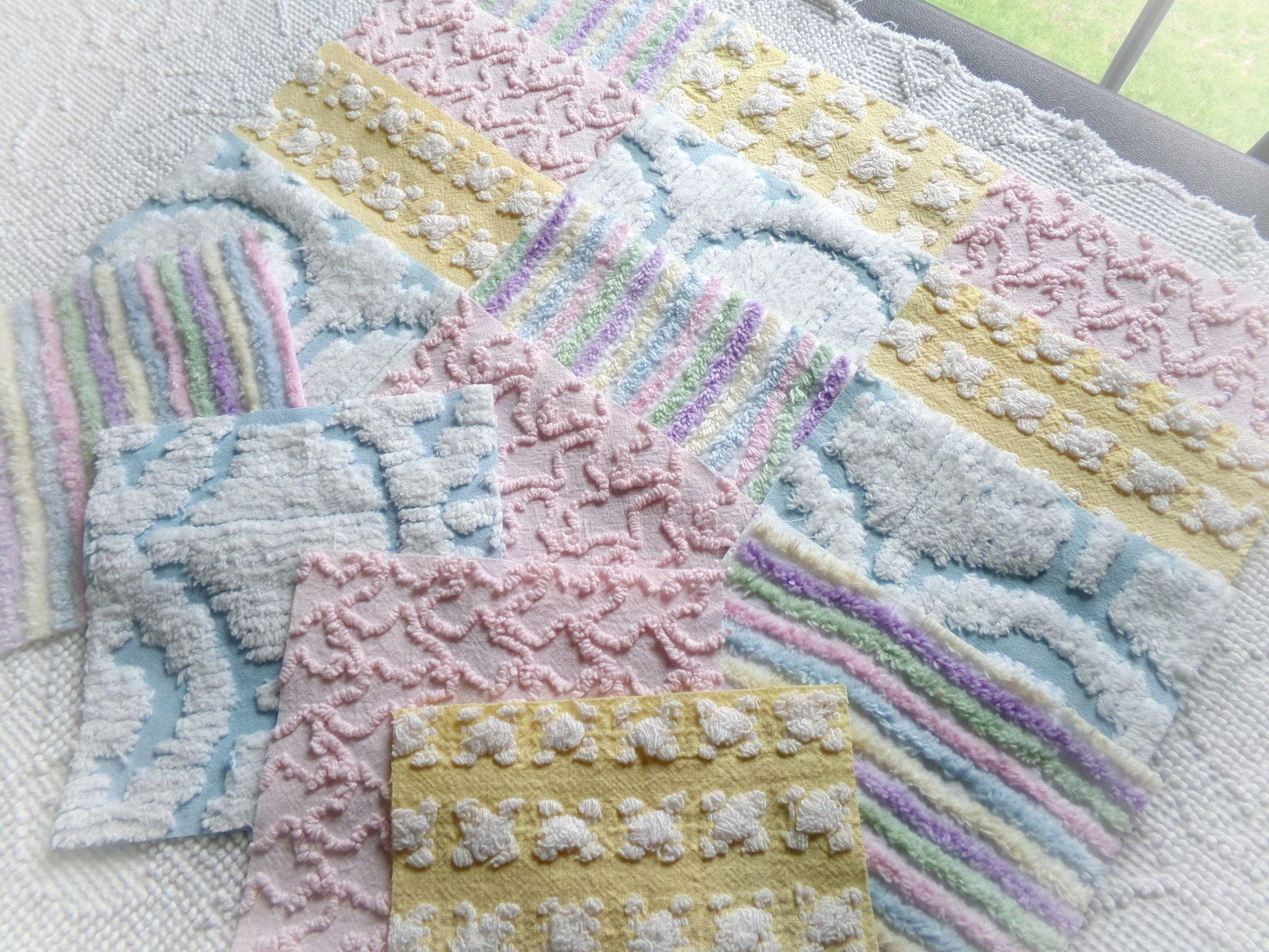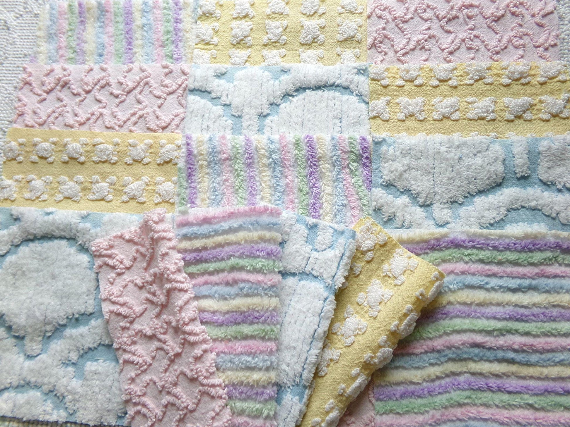 What will you create with this set of vintage chenille fabric squares? I chose the colors to emphasize dreamy, gentle colors of a rainbow in soft pinks, pastel rainbow, cool white & sunny yellow. ✨You'll receive 4 of each pattern: white on yellow rosebud, abstract white clouds on blue, pastel rainbow stripe, pink squiggle