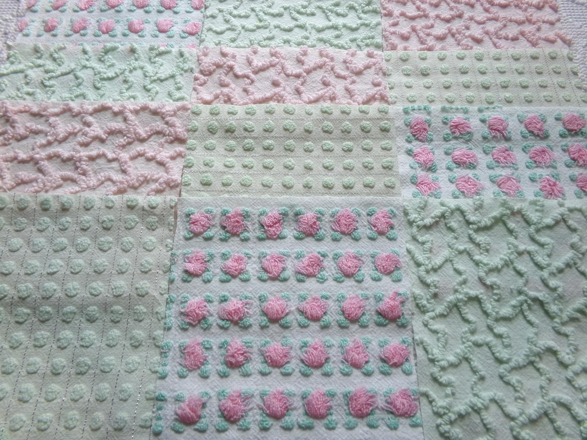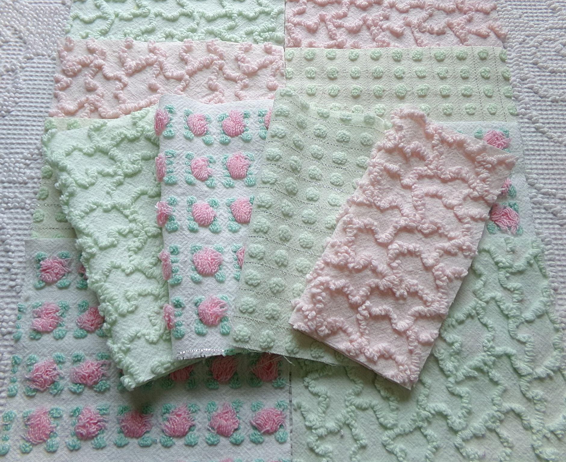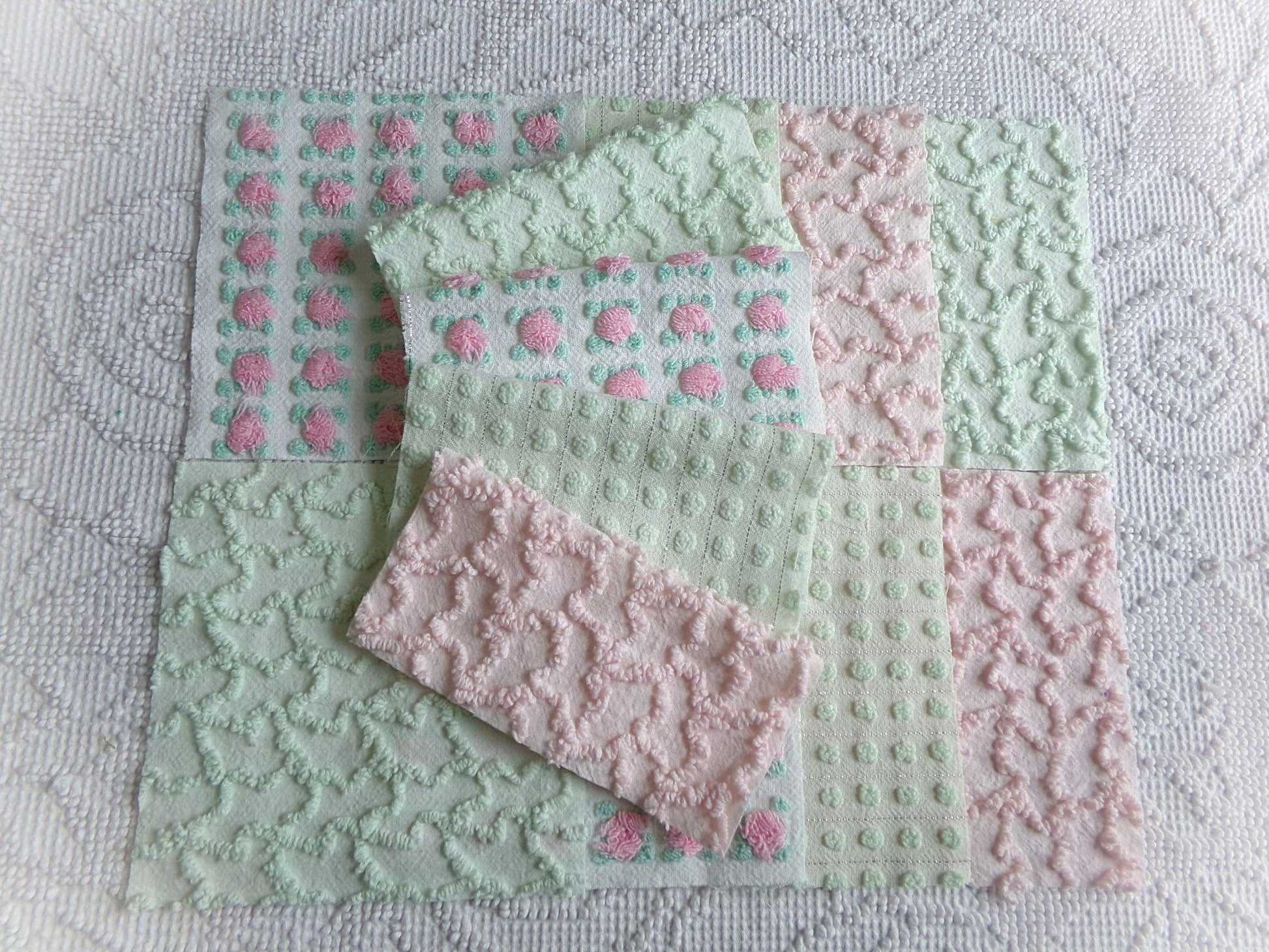 What a beautiful selection of 12 chenille 6" fabric squares I have for you, sure to inspire or enhance your creative project...I've chosen an assortment of our most popular patterns and favorite colors. This set contains 3 of each pattern: prettiest pink and mint green squiggles, little green dots with sparkly silver lurex, and beloved pink rosebuds.Multiple sets available. Pattern placement may vary. Use in quilt inlays, patchwork pillows, doll blankets, upcycle clothing designs & fiber arts of all kinds :)