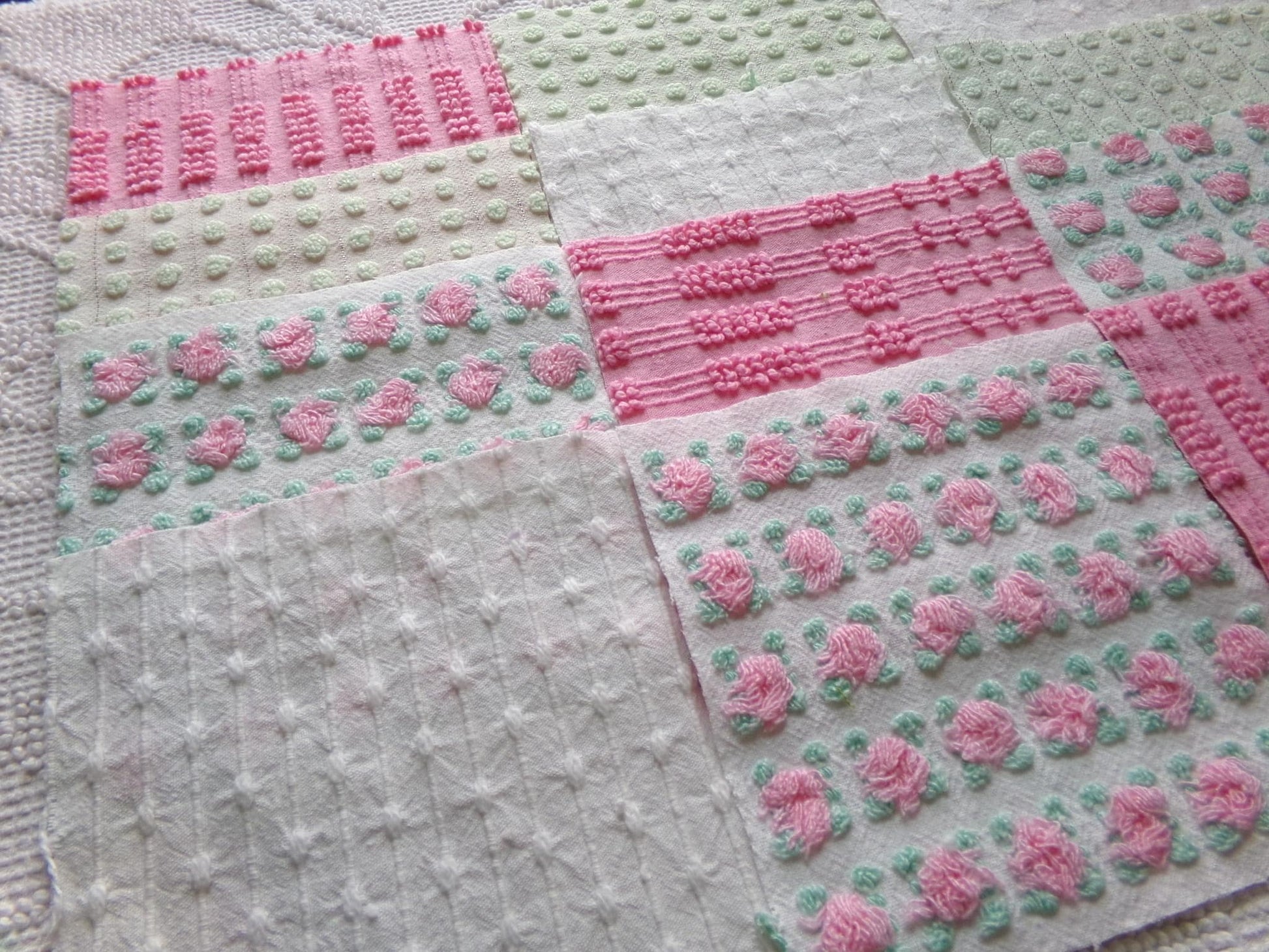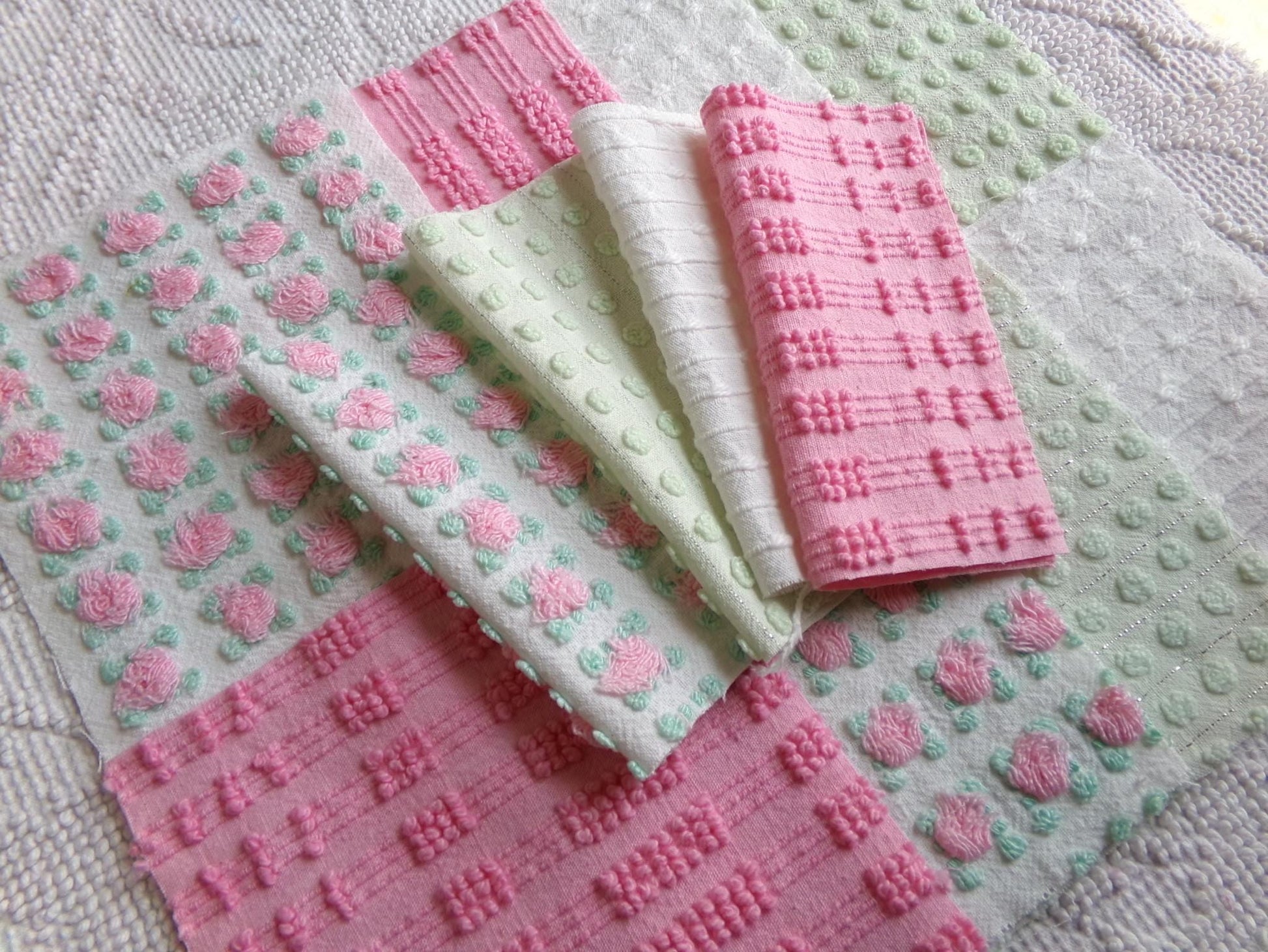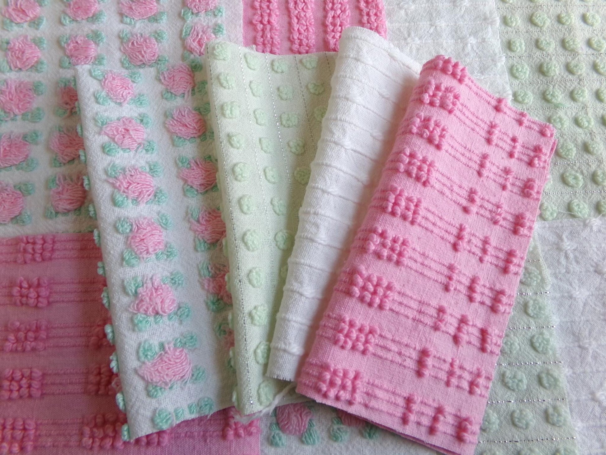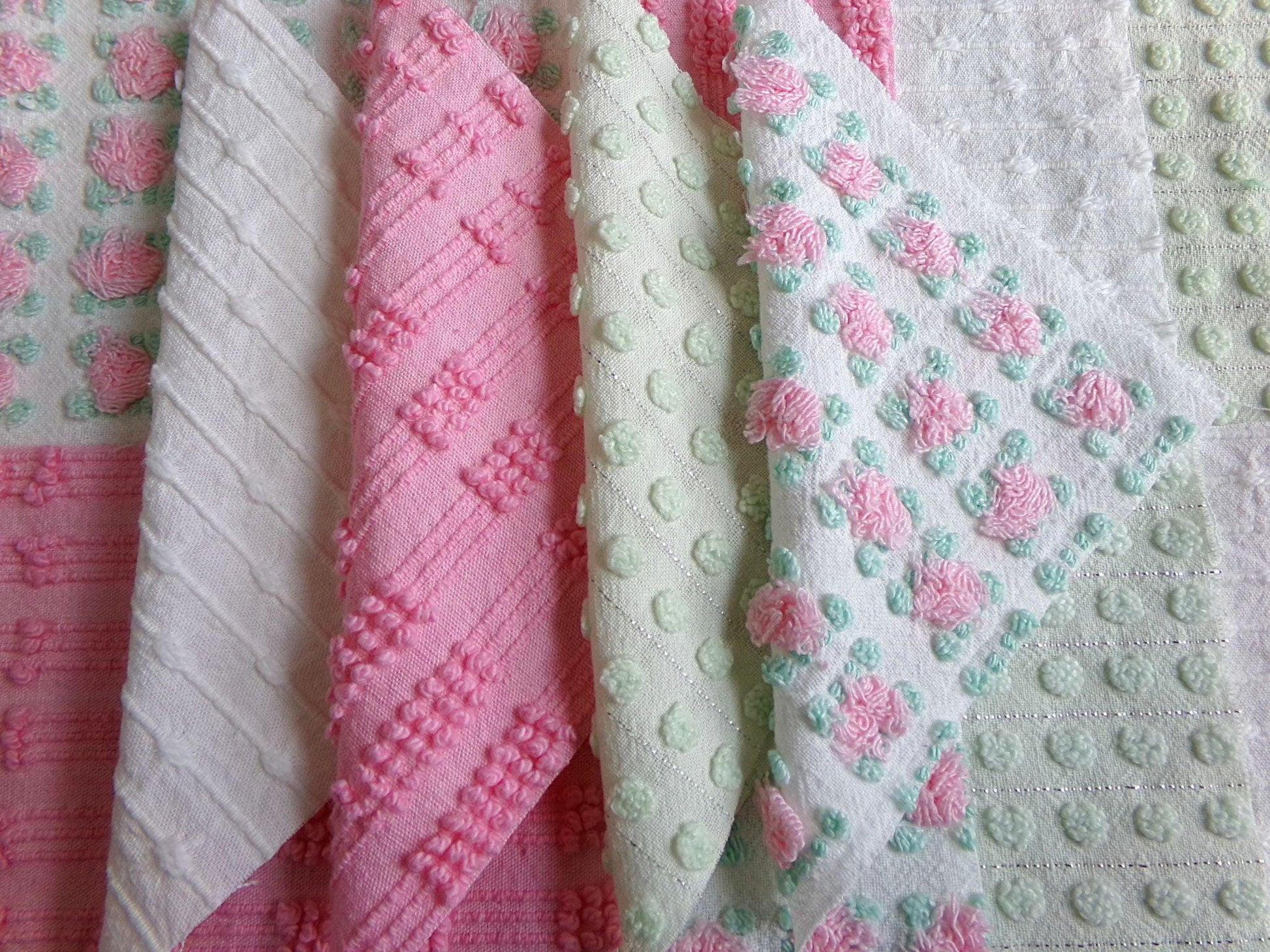 Whimsy pink rosebuds, white woven pearl raindrops, light green shimmer pops & rose pearl dots...oh, how pretty is this selection of 12 vintage chenille 6" fabric squares. This premium set offers some of our most popular patterns and colors in vintage chenille.3 of each pattern: white lightweight woven raindrops, green pops with sparkly silver lurex, rose pearl drop dots, and beloved pink rosebuds.