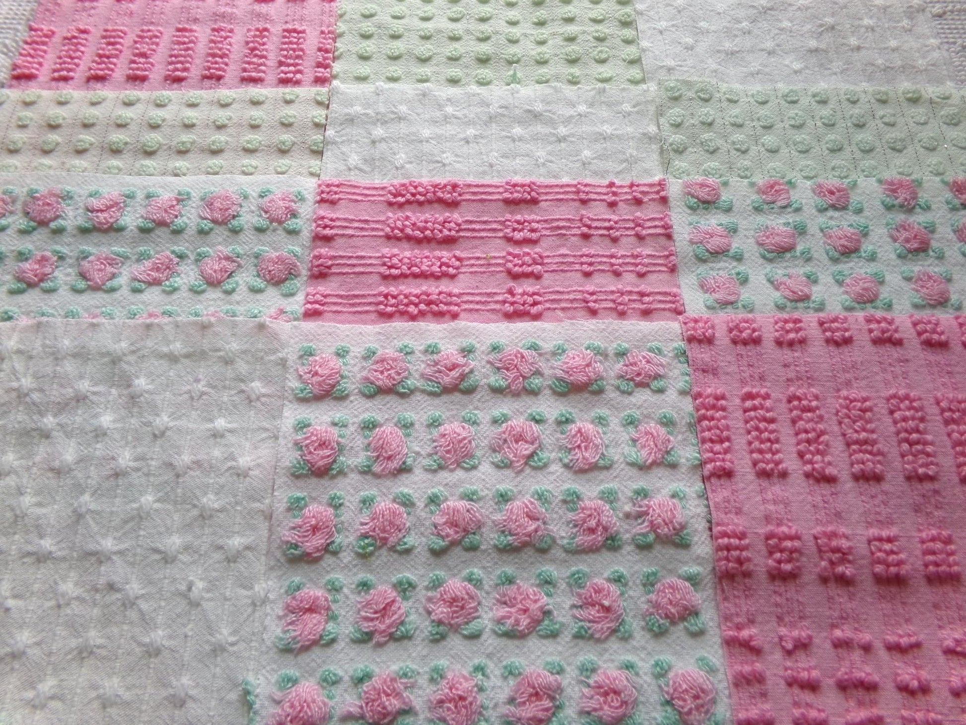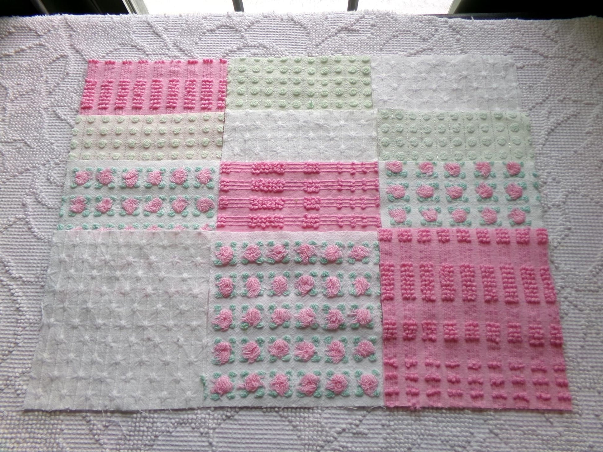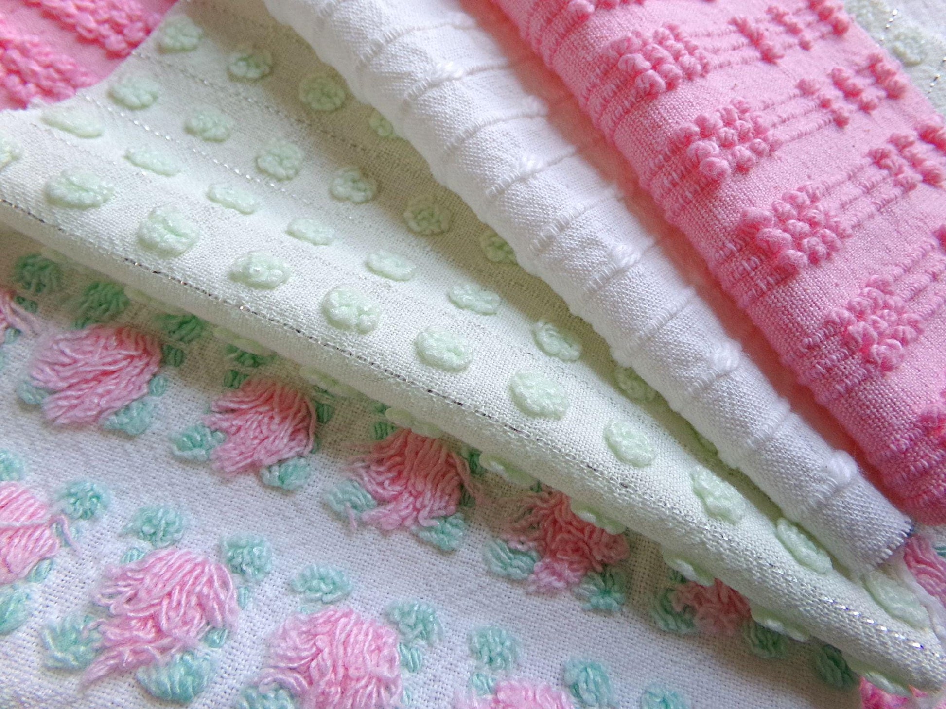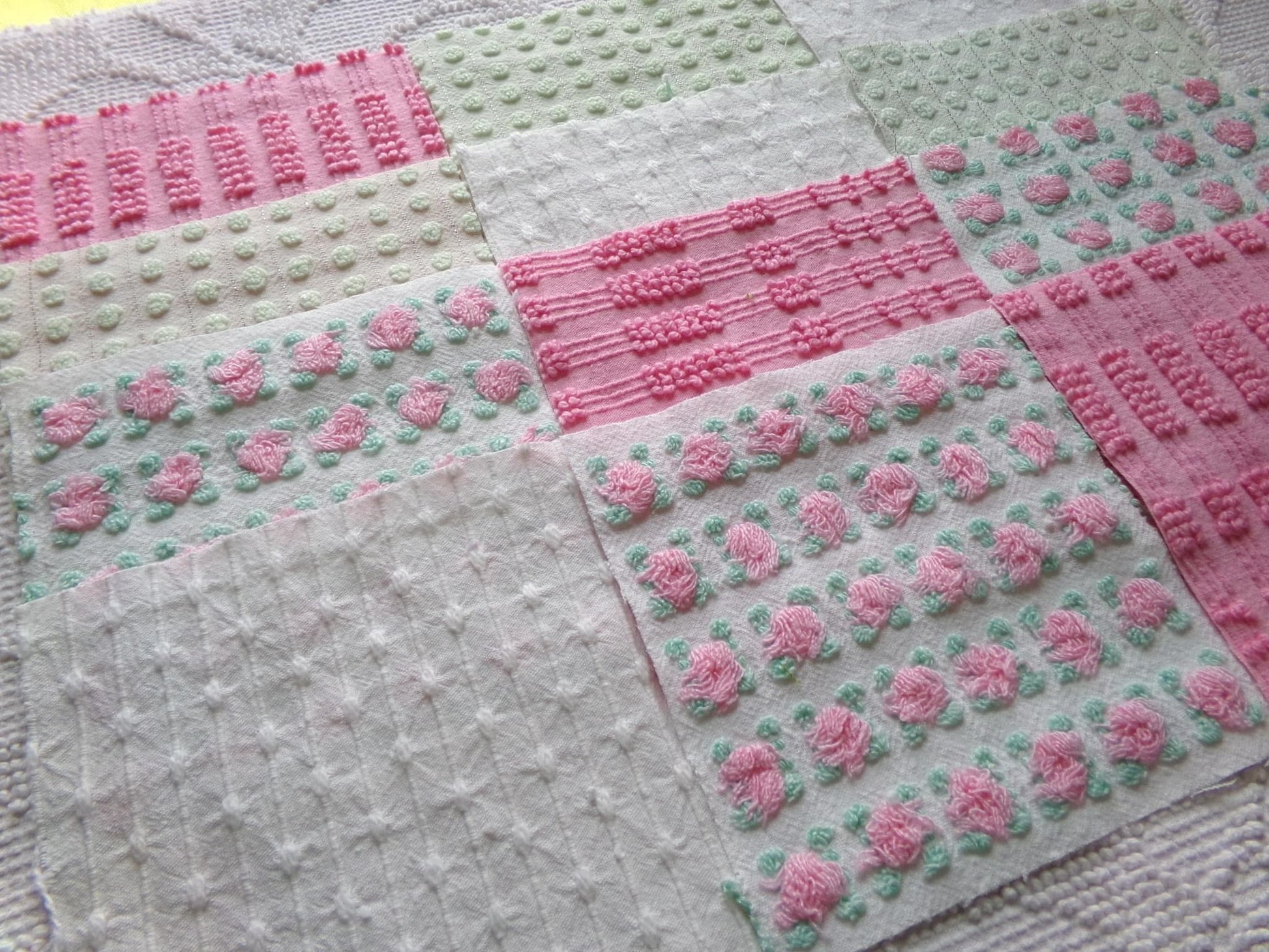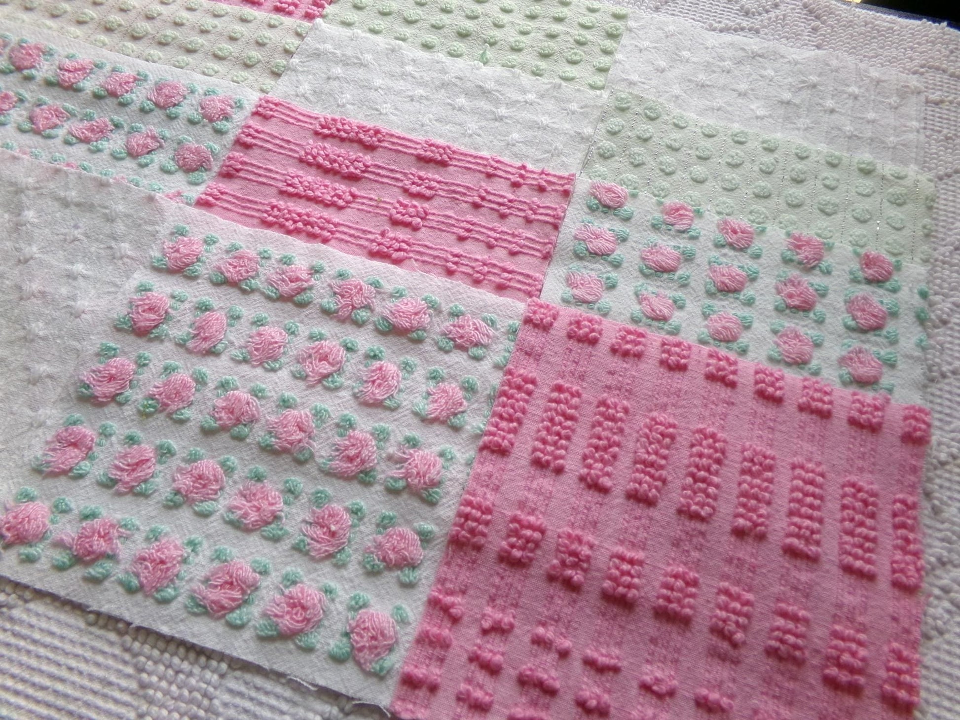 Whimsy pink rosebuds, white woven pearl raindrops, light green shimmer pops & rose pearl dots...oh, how pretty is this selection of 12 vintage chenille 6" fabric squares. This premium set offers some of our most popular patterns and colors in vintage chenille.3 of each pattern: white lightweight woven raindrops, green pops with sparkly silver lurex, rose pearl drop dots, and beloved pink rosebuds.