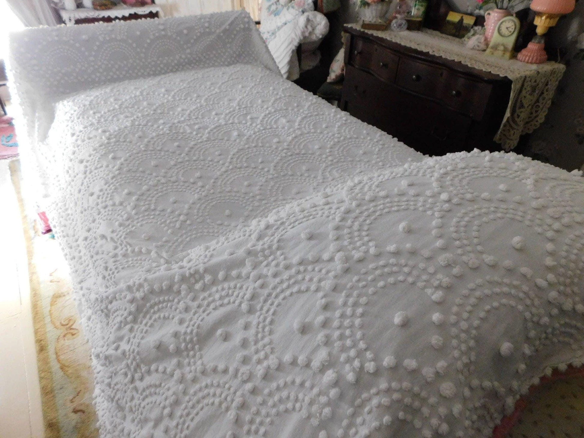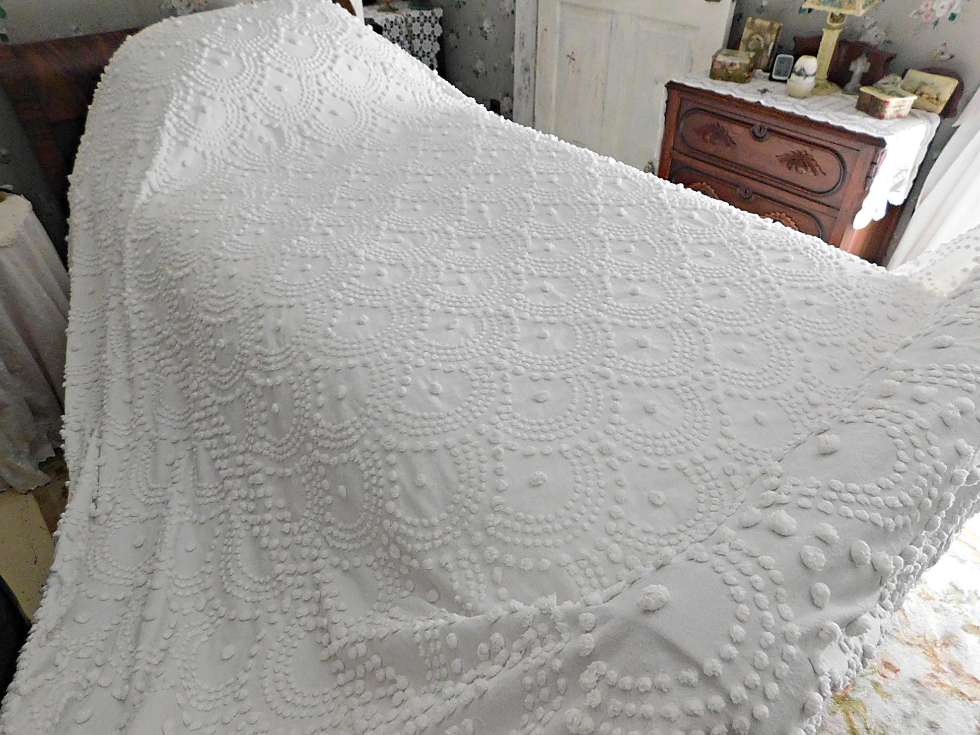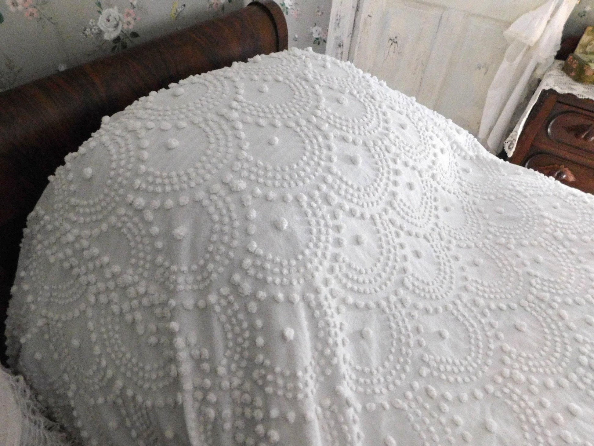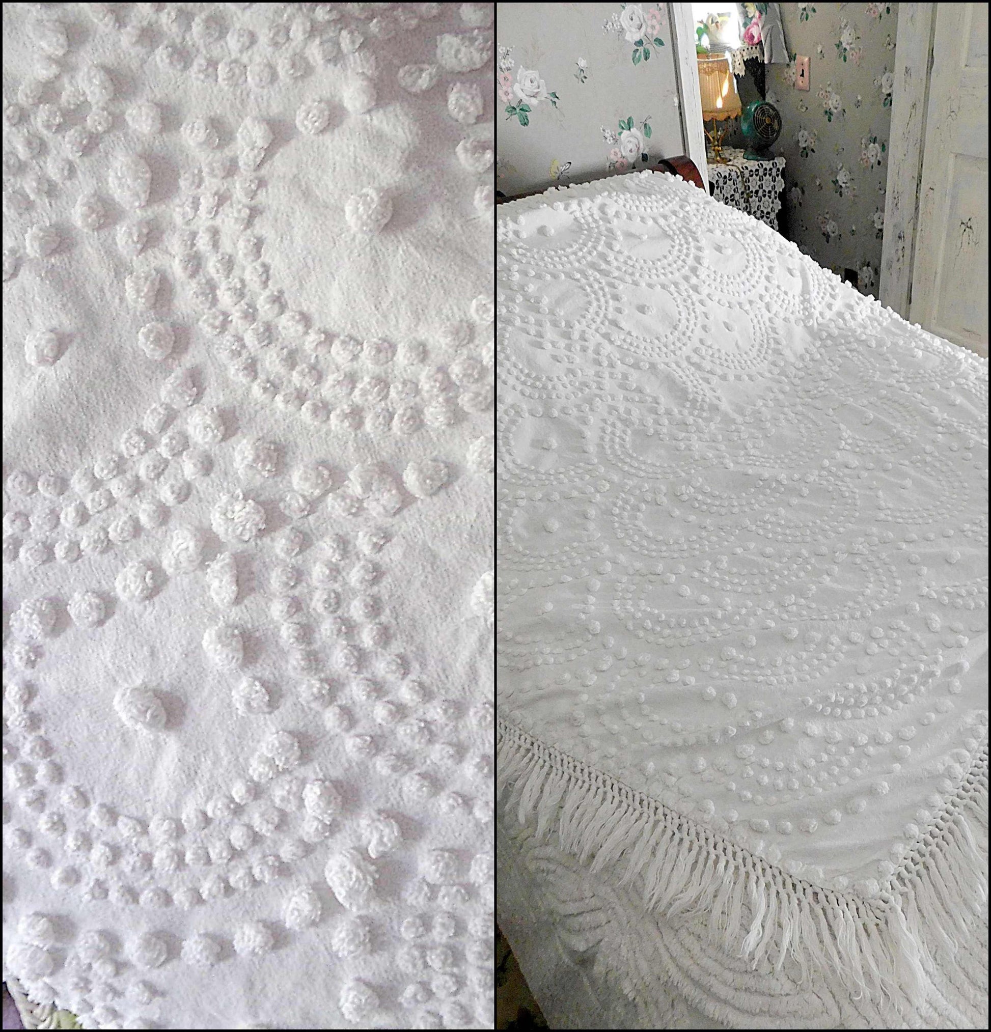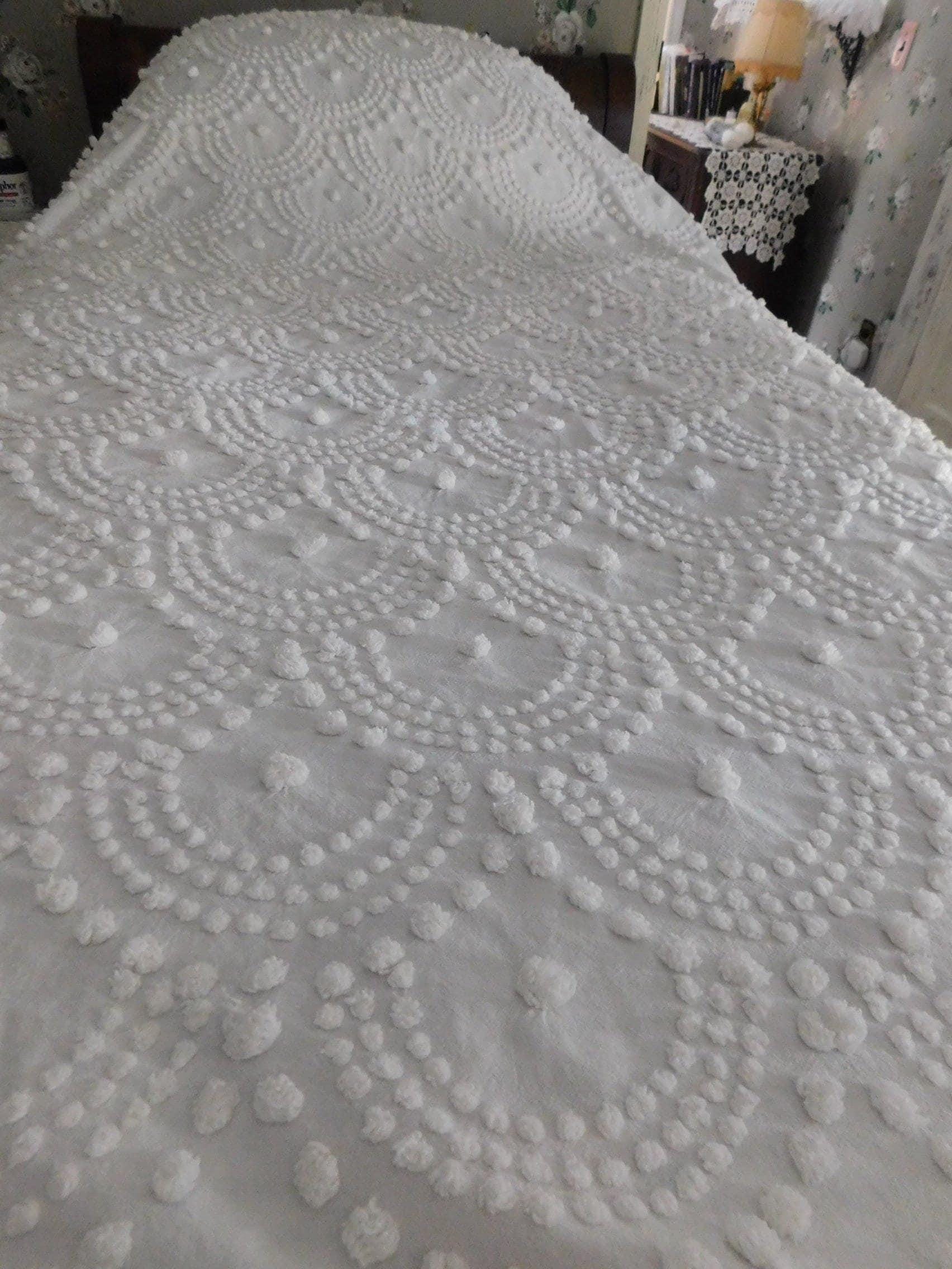 {FULL SIZE} Envision this timelessly elegant vintage chenille bedspread bringing it's farmhouse style country charm into your special space...white handtufted shell scallop pops form a stunning waterfall cascade pattern. Contrast pattern around the drop sides resembles a rising sun design..100% antique cotton, with accent fringe along the drop sides. Square corners. In very good condition especially given the age, dating from the 1930s. Just a few small mends that I noticed close to the headboard/top area.::FULL size (approx 92"W x 101"L) shown on standard twin bed