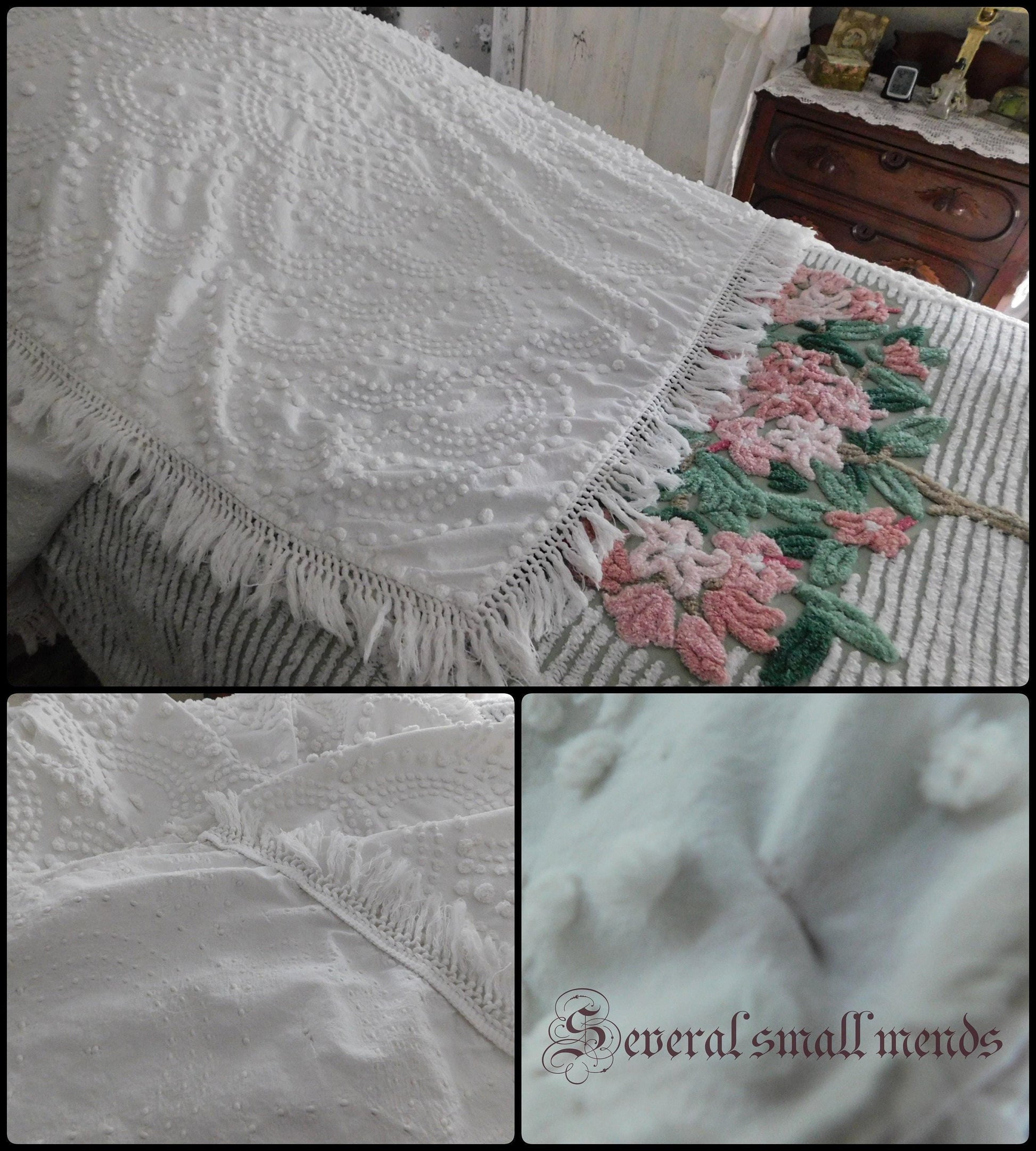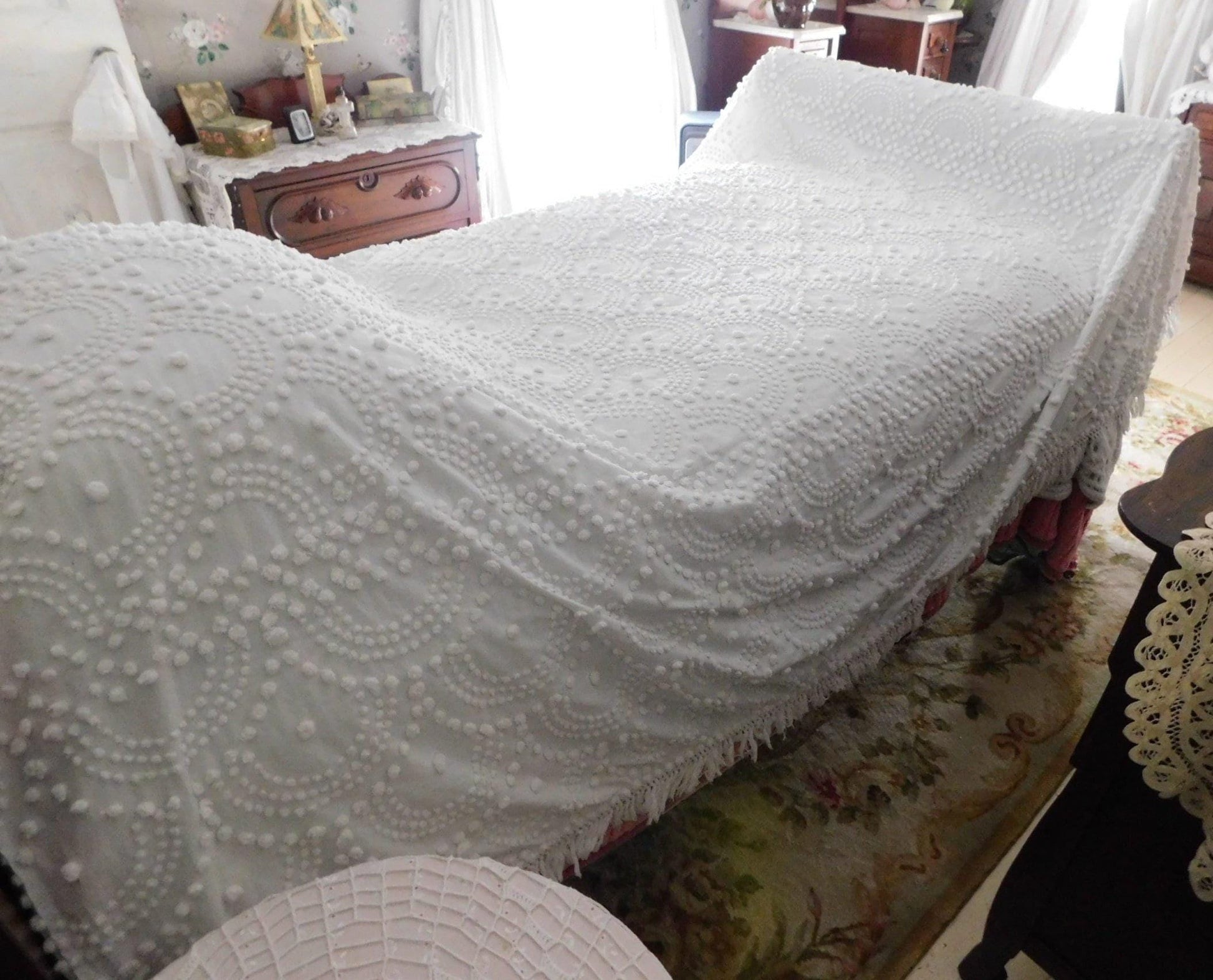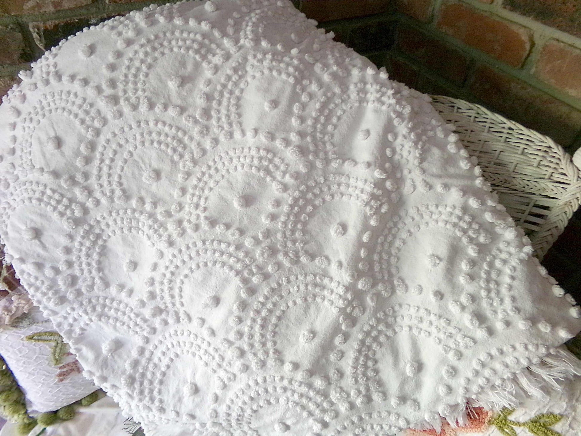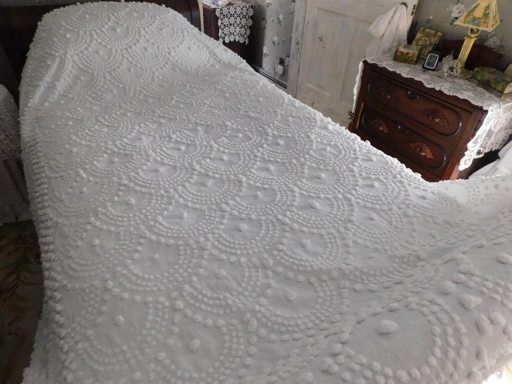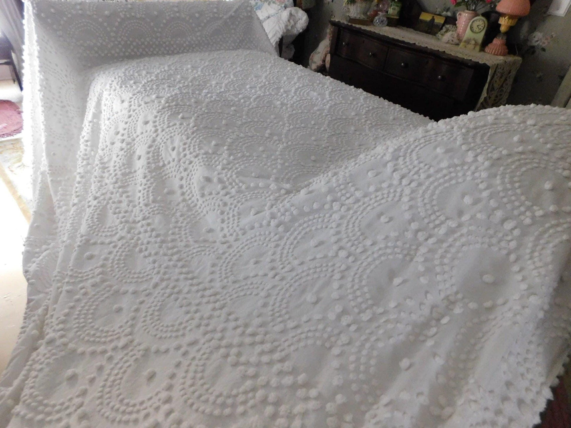 {FULL SIZE} Envision this timelessly elegant vintage chenille bedspread bringing it's farmhouse style country charm into your special space...white handtufted shell scallop pops form a stunning waterfall cascade pattern. Contrast pattern around the drop sides resembles a rising sun design..100% antique cotton, with accent fringe along the drop sides. Square corners. In very good condition especially given the age, dating from the 1930s. Just a few small mends that I noticed close to the headboard/top area.::FULL size (approx 92"W x 101"L) shown on standard twin bed