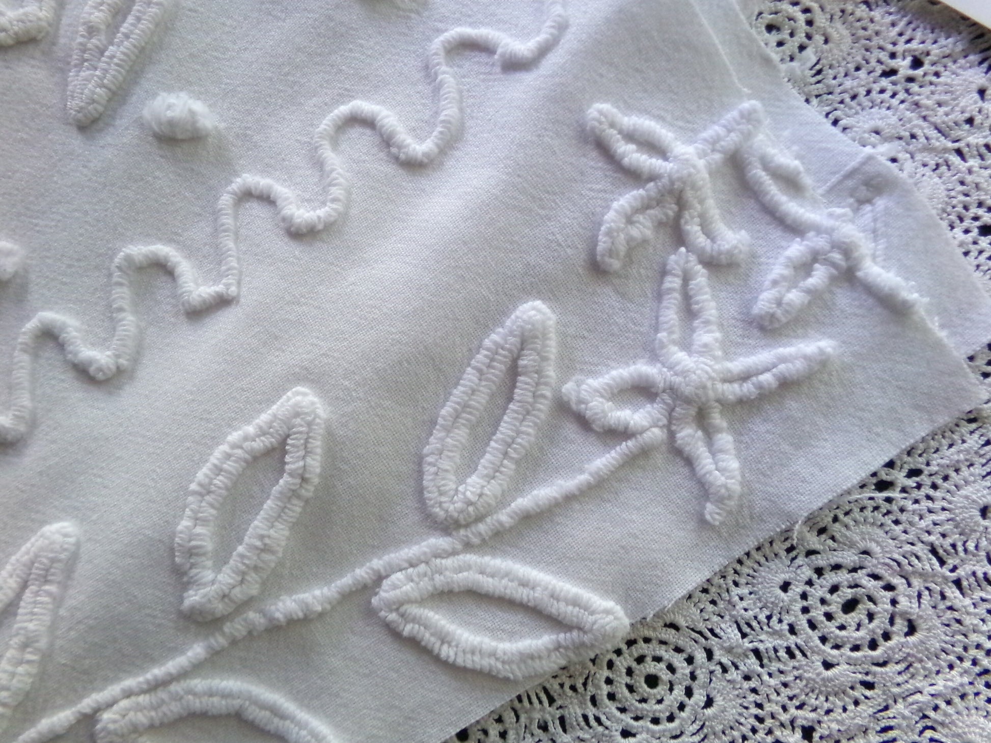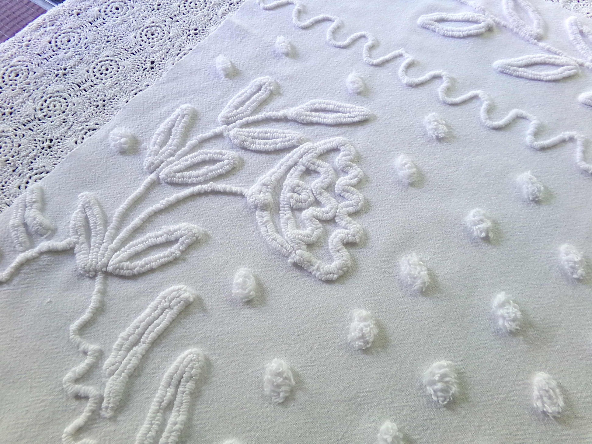 Delicate white vintage chenille fabric with lily floral needletufting, accented by dainty dots. This piece adds a beautifully elegant, timeless farmhouse style appeal to any project.Approx 20" x 23" inches. Few tiny pinholes; 100% cotton groundcloth; circa 1950s eraw h a t - t o - k n o w
