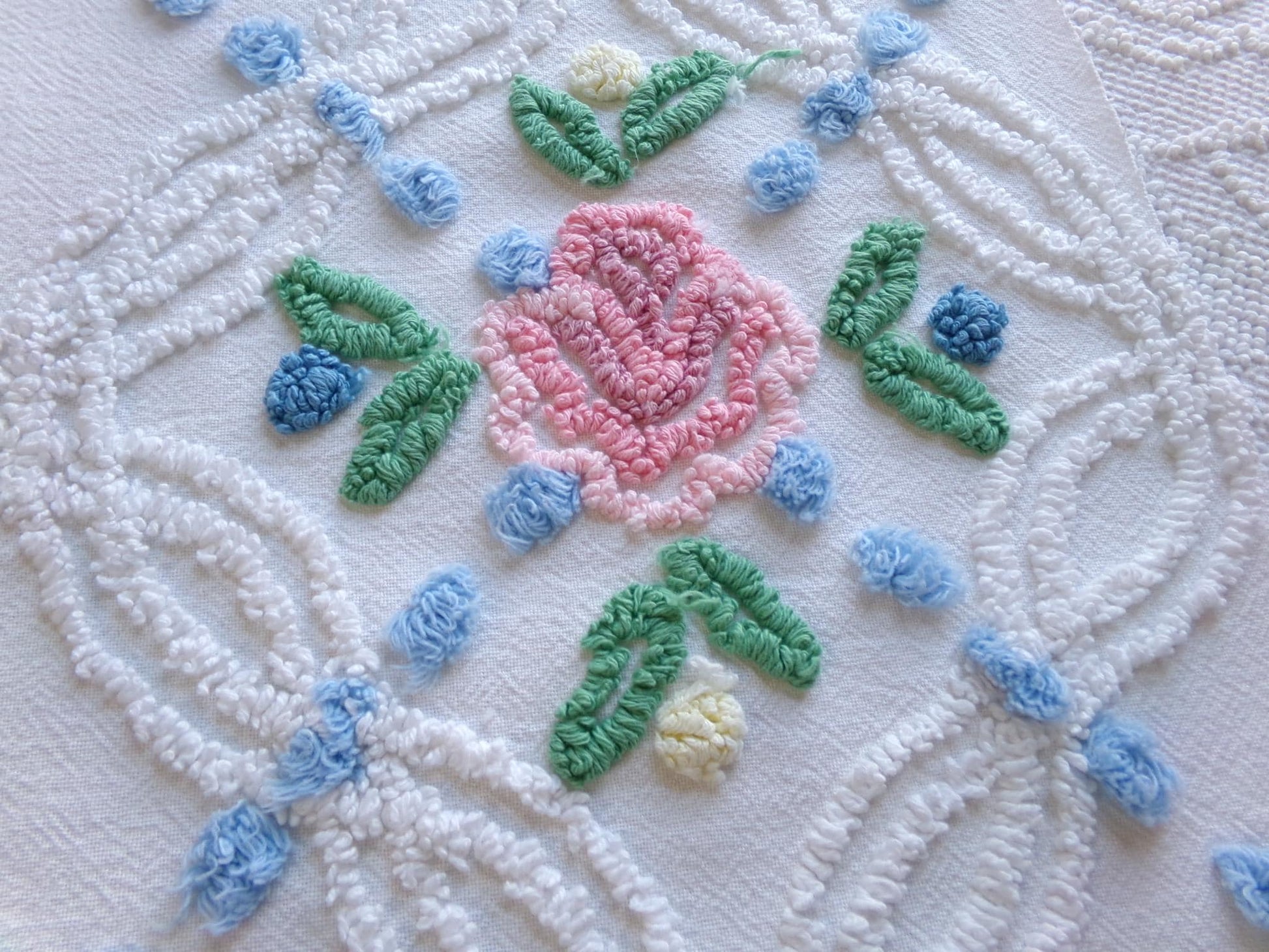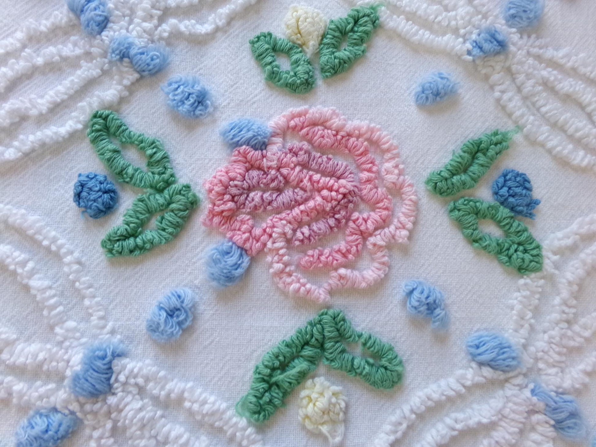 Love cottage chic? This pretty chenille fabric is ready to inspire or enhance your next project. It features two needletuft floral motifs against a snowy white bkgd with coordinating blue puff pops. A great fabric choice for DIY pillows & quilts.100% cotton. Design by Cabin Crafts. Measures about 20" x 27" inches. Common to the fabric, you'll see some tuft pulls.