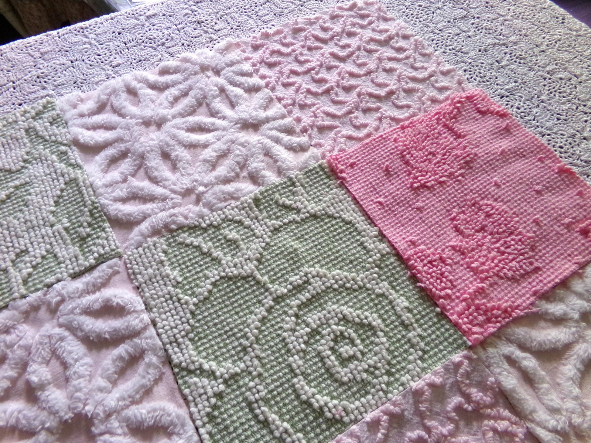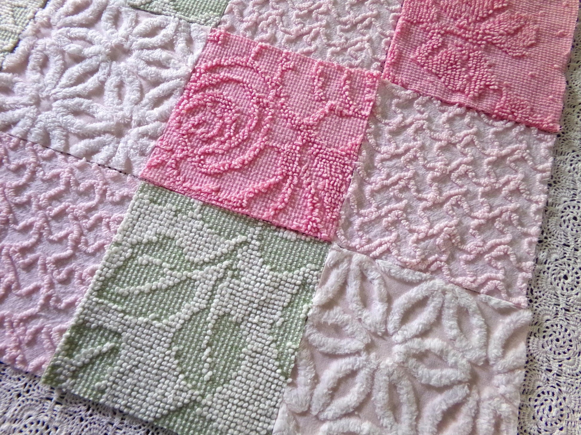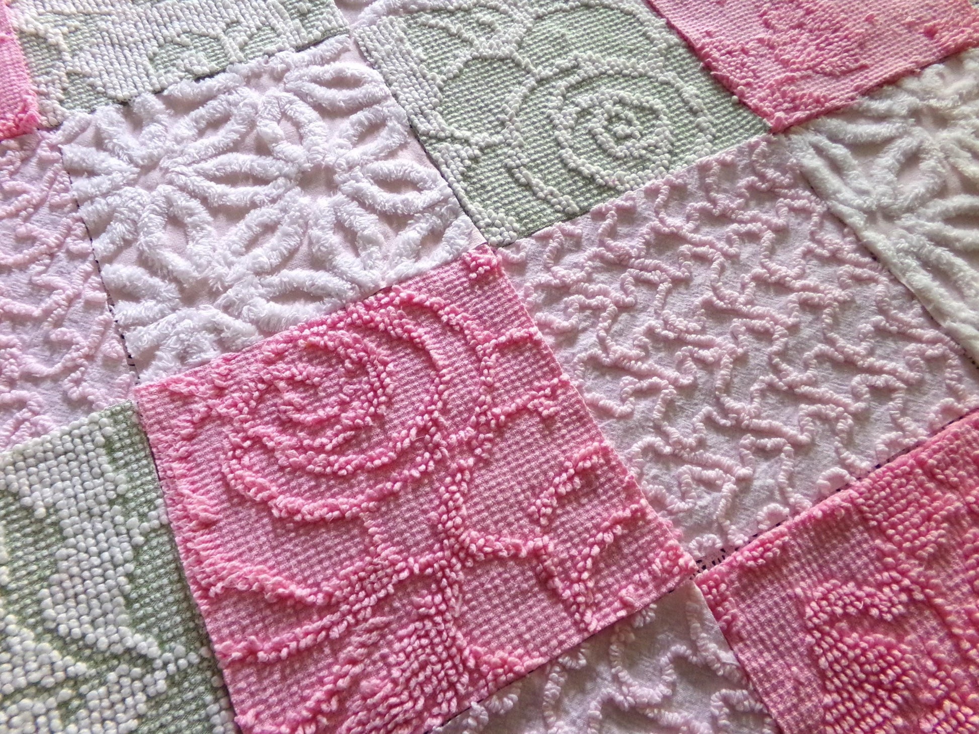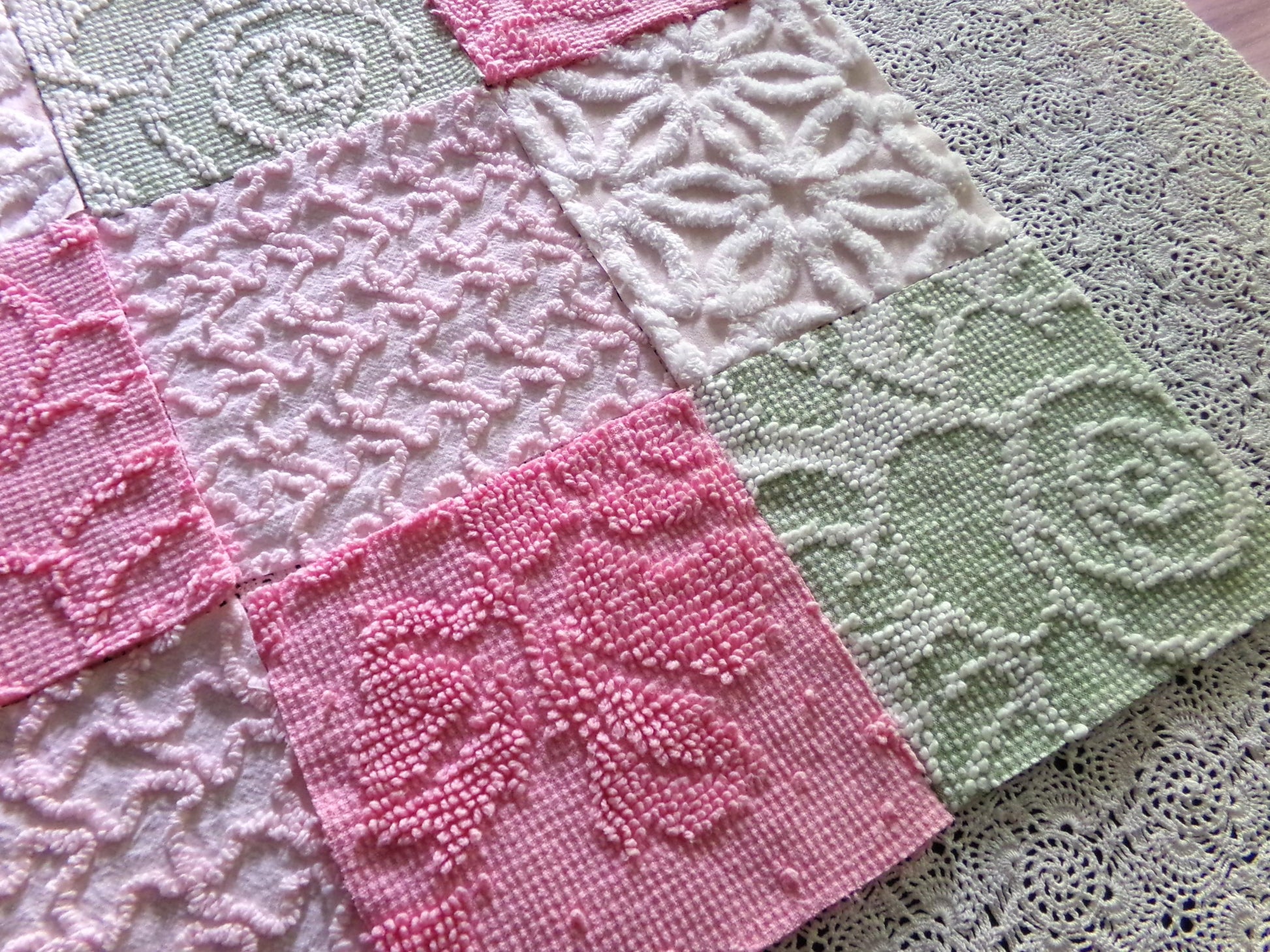 "Flower Lady" ... a beautiful assorted premium mix of vintage chenille fabric squares in multiples of 4 each:Hofmann pink & white daisy, sage & white hobnail, rose petal pink hobnail, pink squiggles.