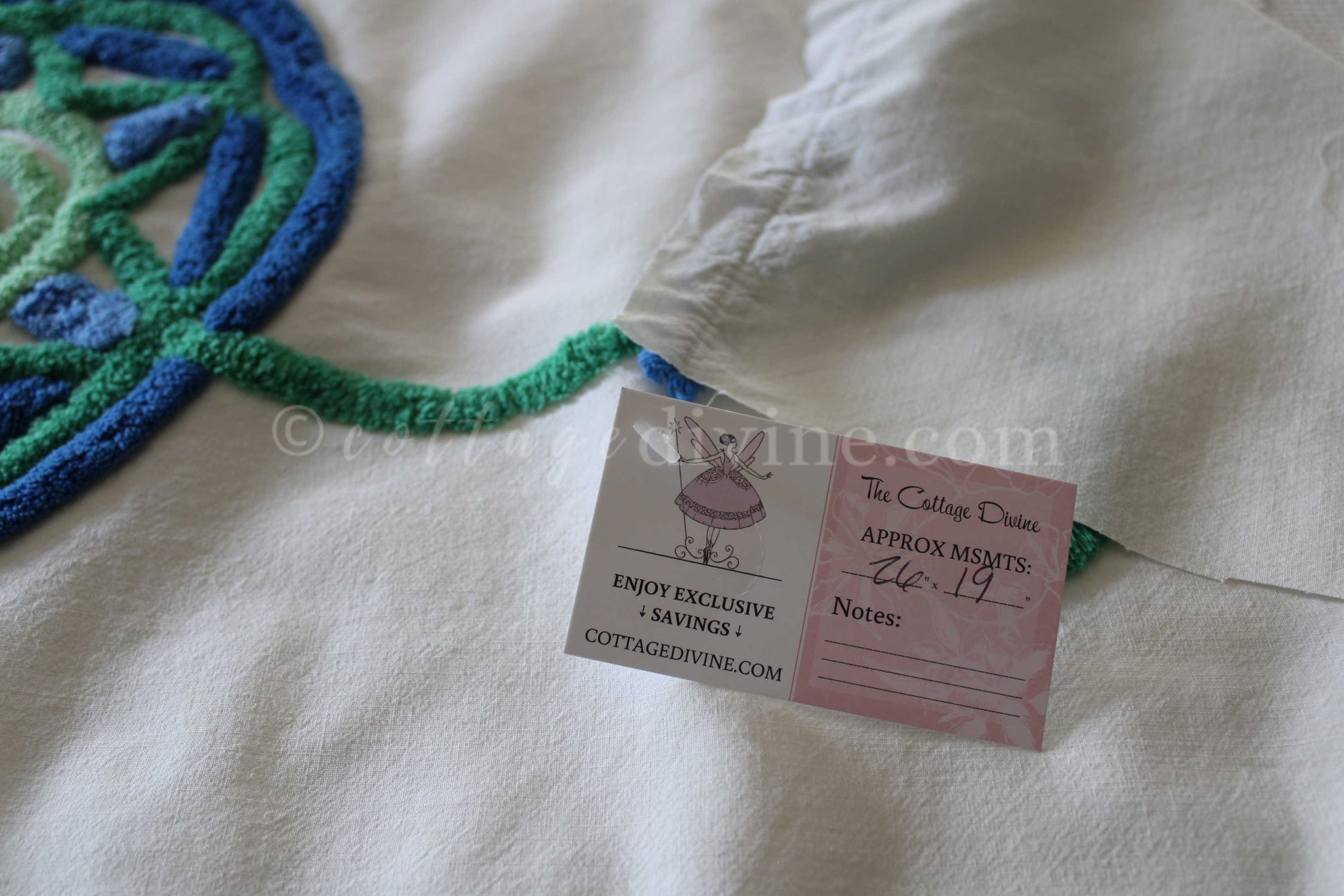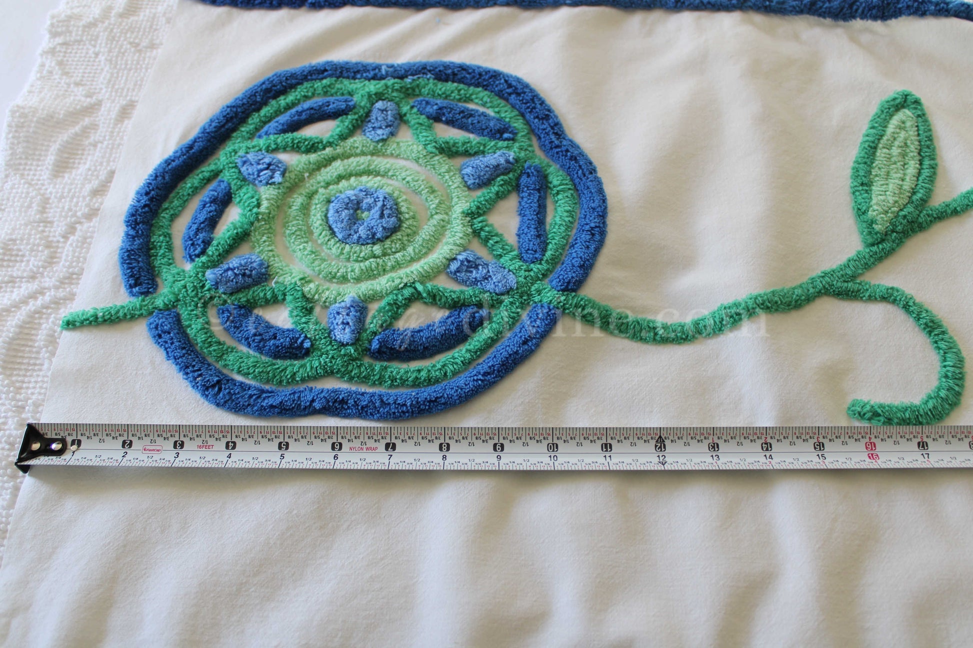 Looking for a very unusual piece of standout chenille with some serious flower power retro vibes? This vintage chenille piece may be just what you need to make your design come alive. Handmade in the late 1930s to early 1940s. Back then, they sold DIY kits that you could use to make your own chenille, and that's how someone made this - in a pattern you'll almost never see.Measures approx 19" x 26" inches. 100% lightweight cotton. Still vibrant, lively colors. Few shabby attributes such as a minor pinholew h a t - t o - k n o w