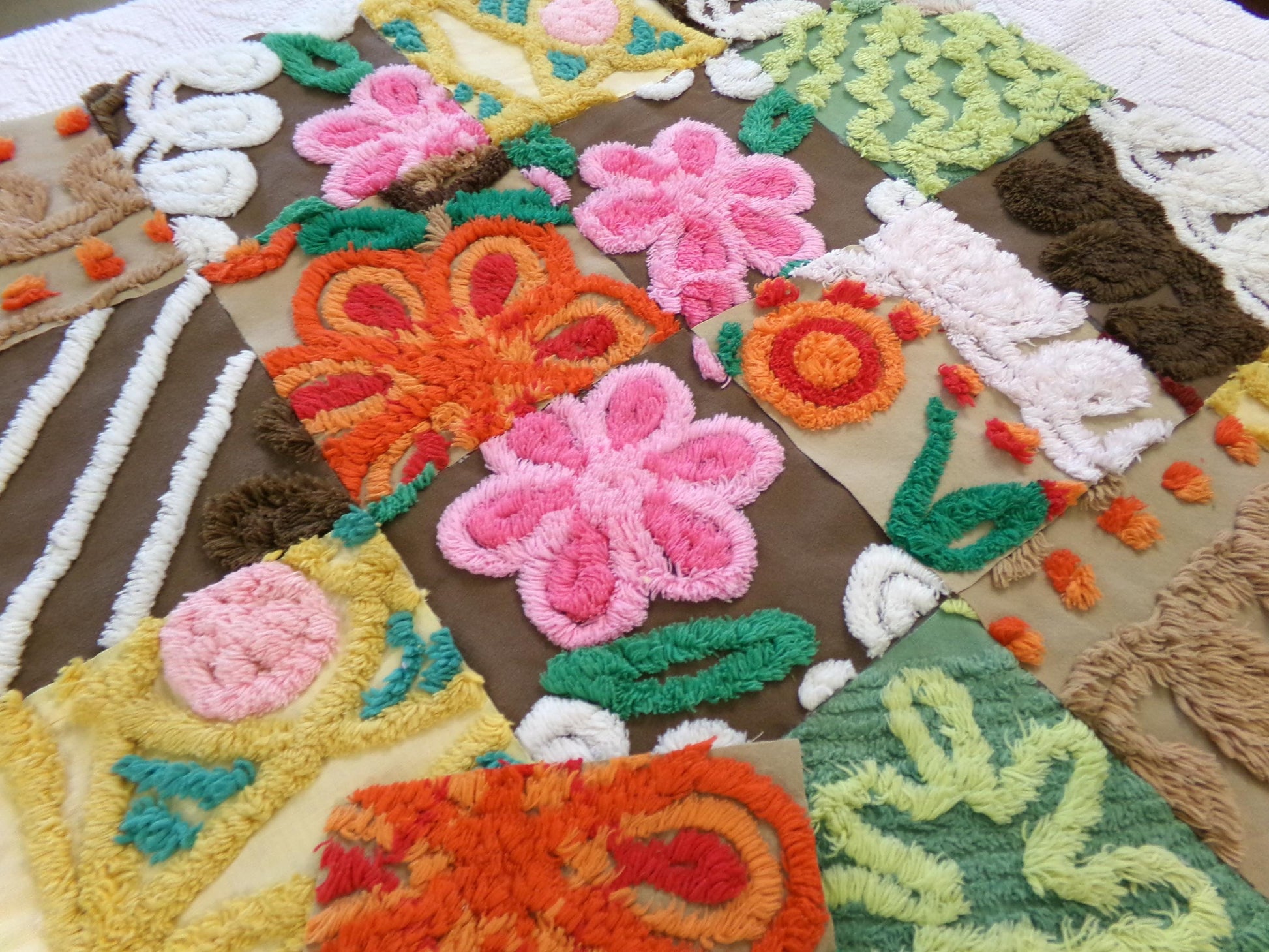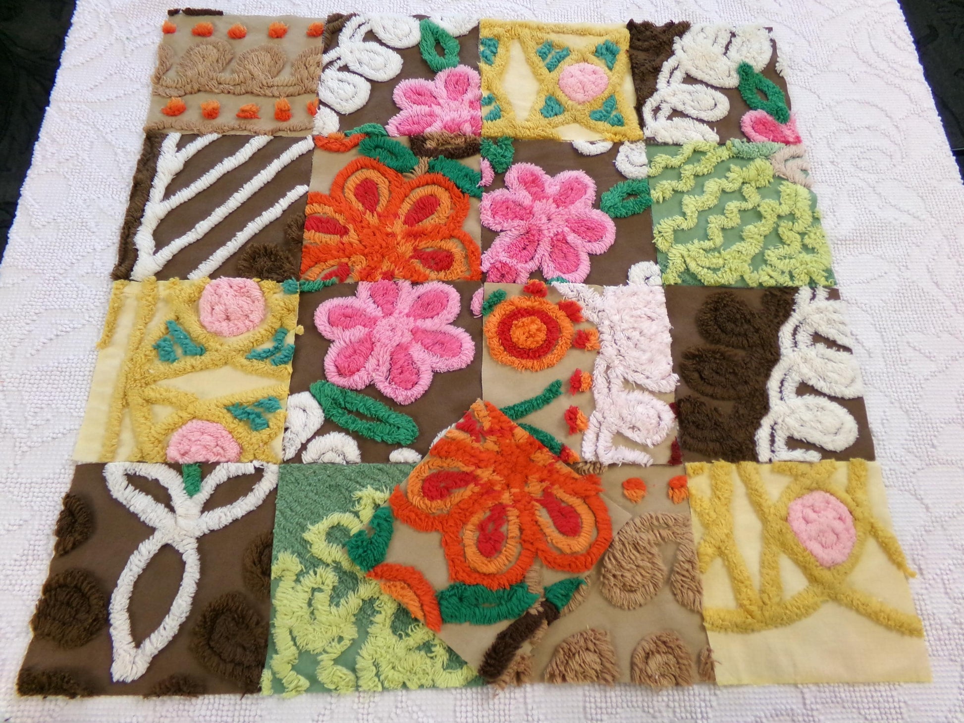 "Flower Power" ... a fun set of 16 chenille fabric squares emphasizing colorful shades of chocolatey brown, autumnal orange, woodland green with pops of pink, gold & white. I've also included a cute extra little orange flower piece for appliques, etc.I've chosen intentionally distressed fabrics for this OOAK selection, so you may notice some missing tufts, tiny paint flecks, or other distressing which lends an authentic vintage look (see final img). I am not able to duplicate this set - it's the only one I have available.