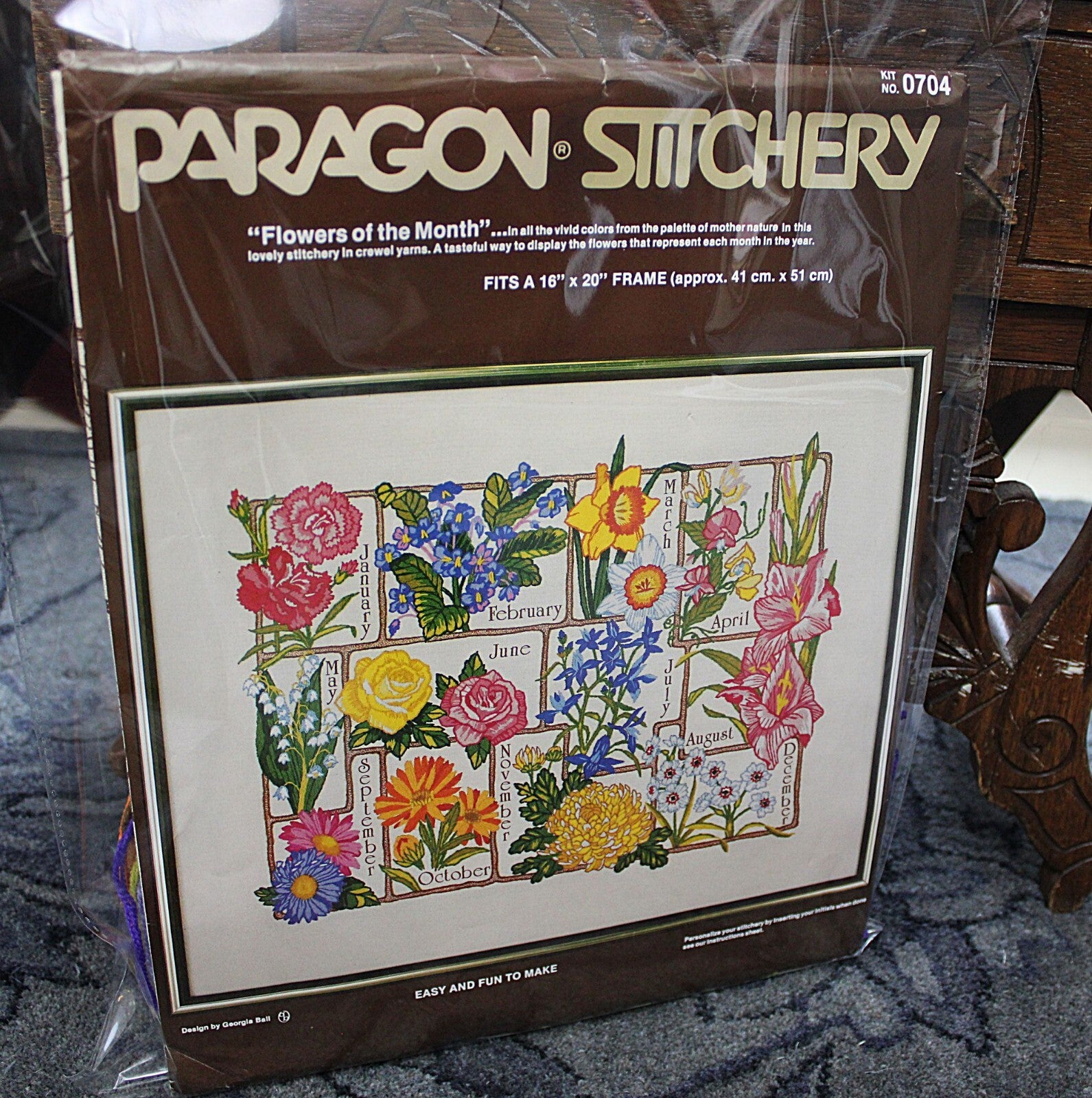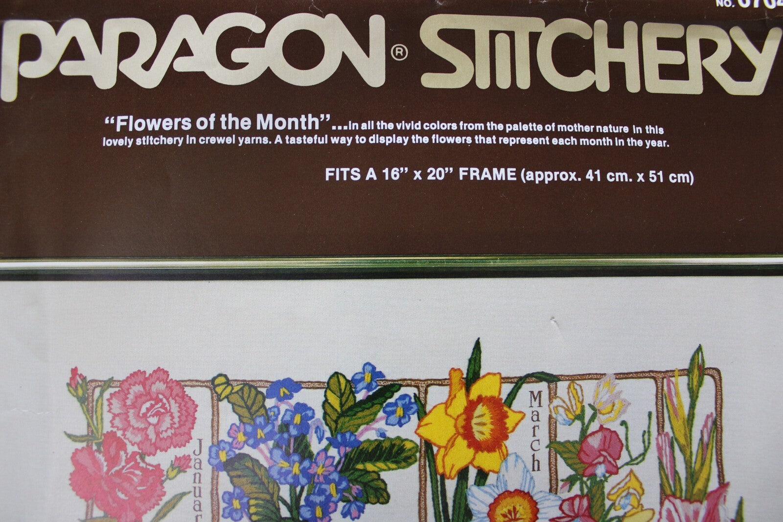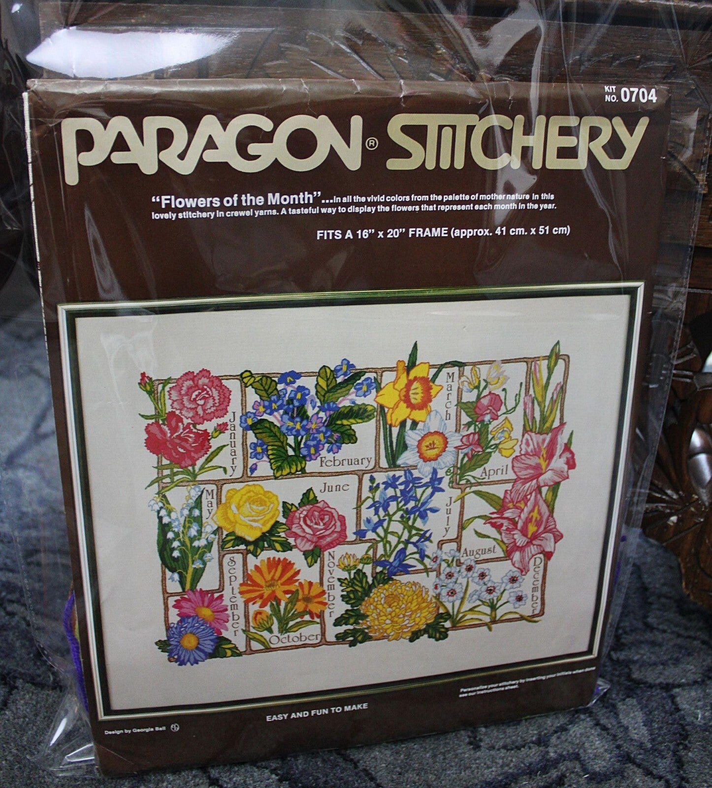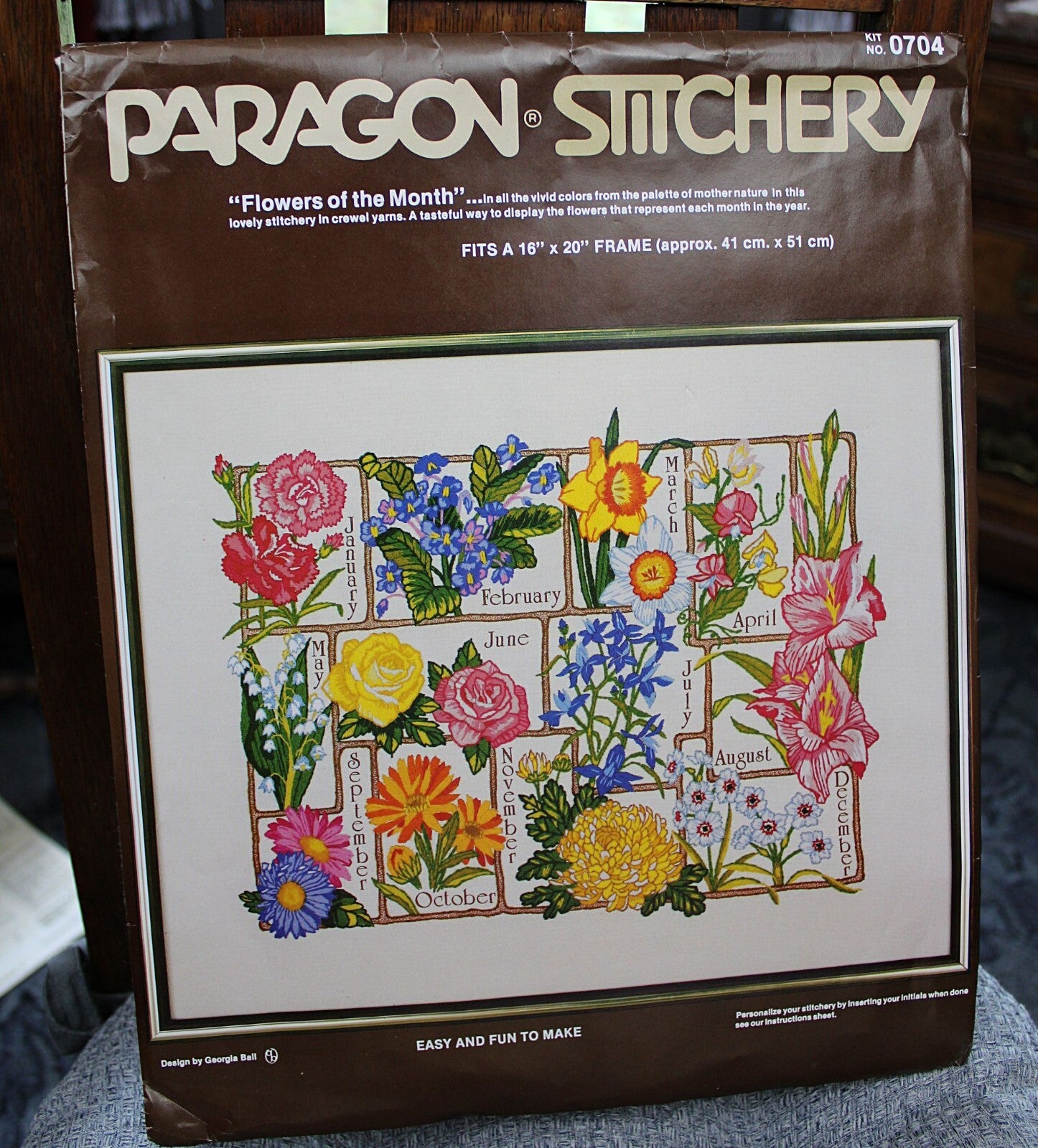 "Flowers of the Month" ... "in all the vivid colors from the palette of Mother Nature in this lovely stitchery in crewel yarns. A tasteful way to display the flowers that represent each month of the year." (per pkg)-Paragon Kit #0704. Design by Georgia Ball.