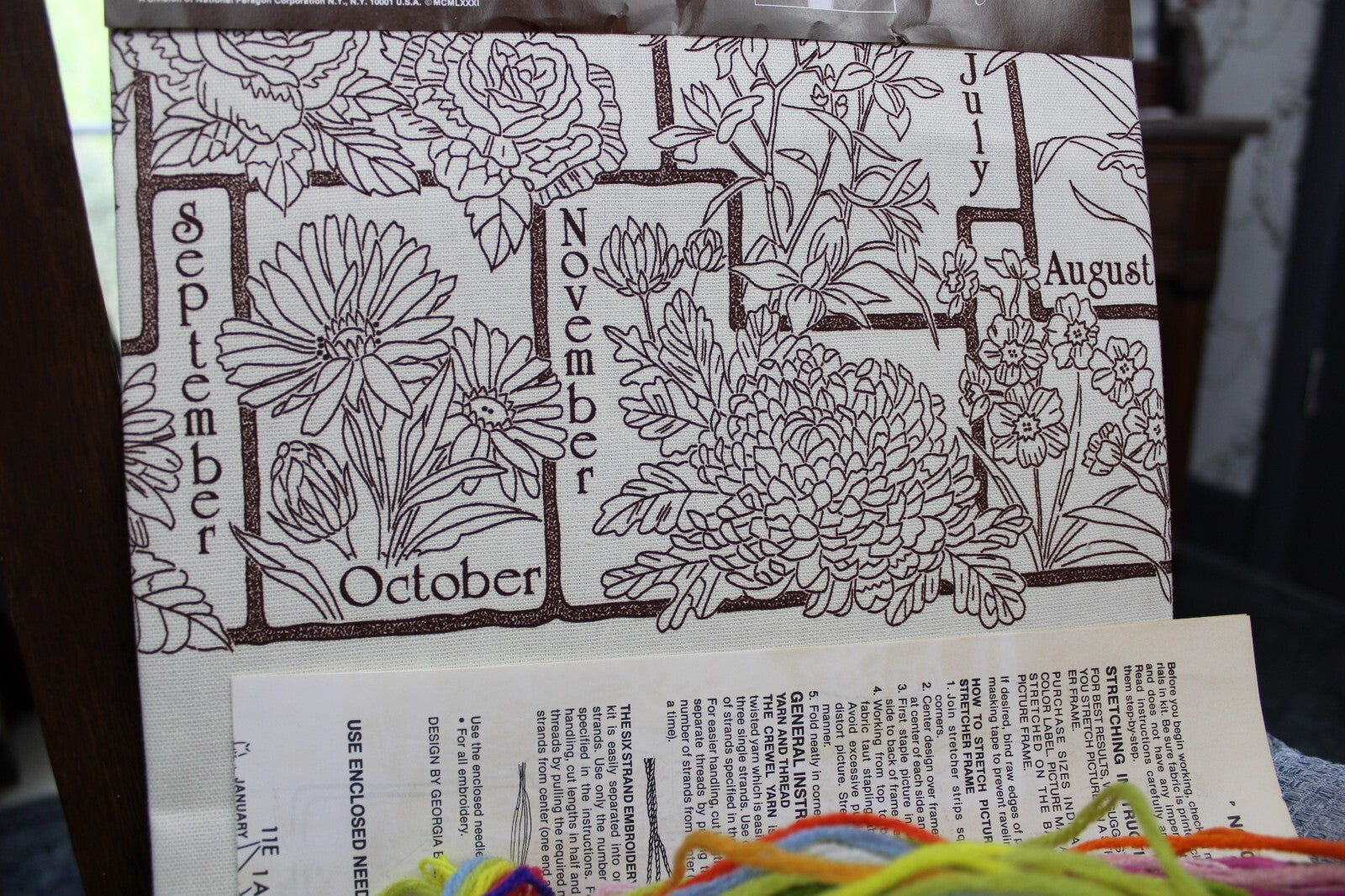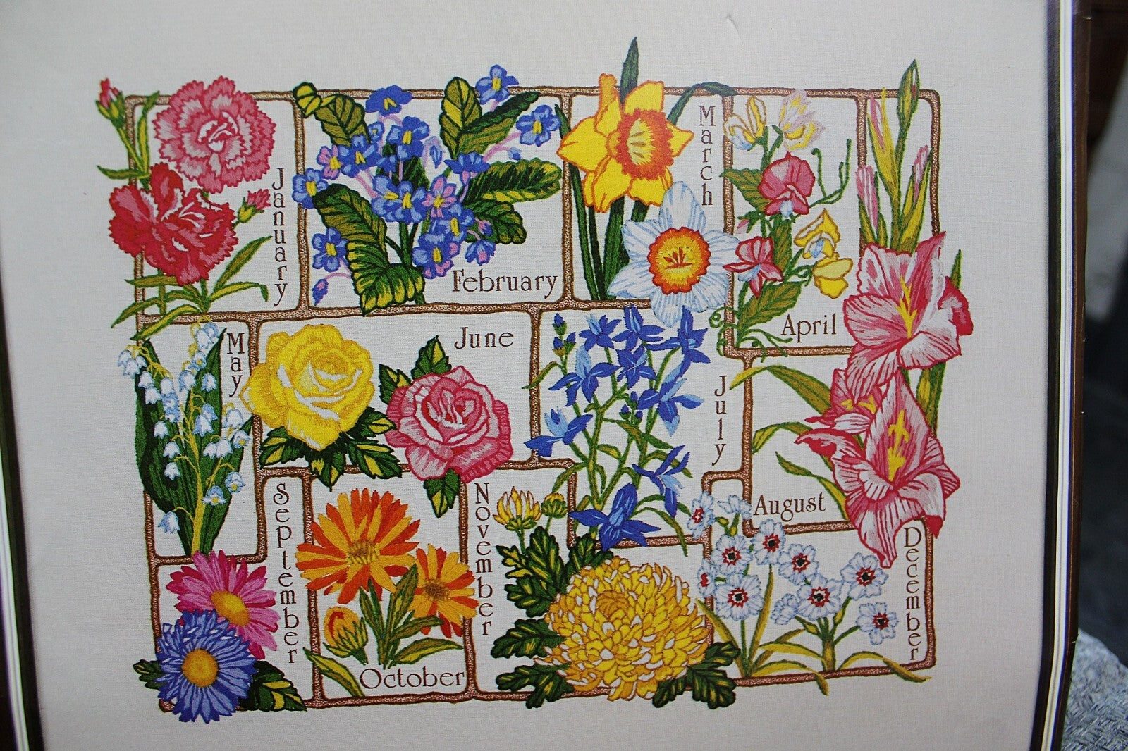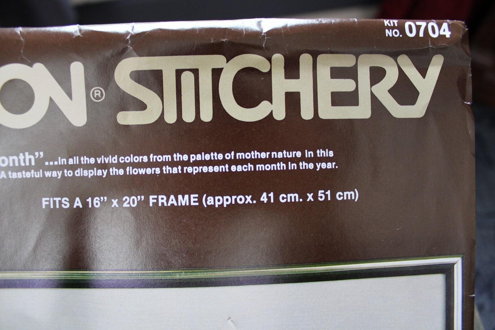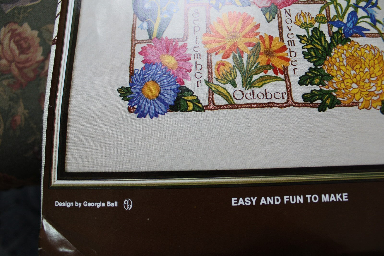 "Flowers of the Month" ... "in all the vivid colors from the palette of Mother Nature in this lovely stitchery in crewel yarns. A tasteful way to display the flowers that represent each month of the year." (per pkg)-Paragon Kit #0704. Design by Georgia Ball.