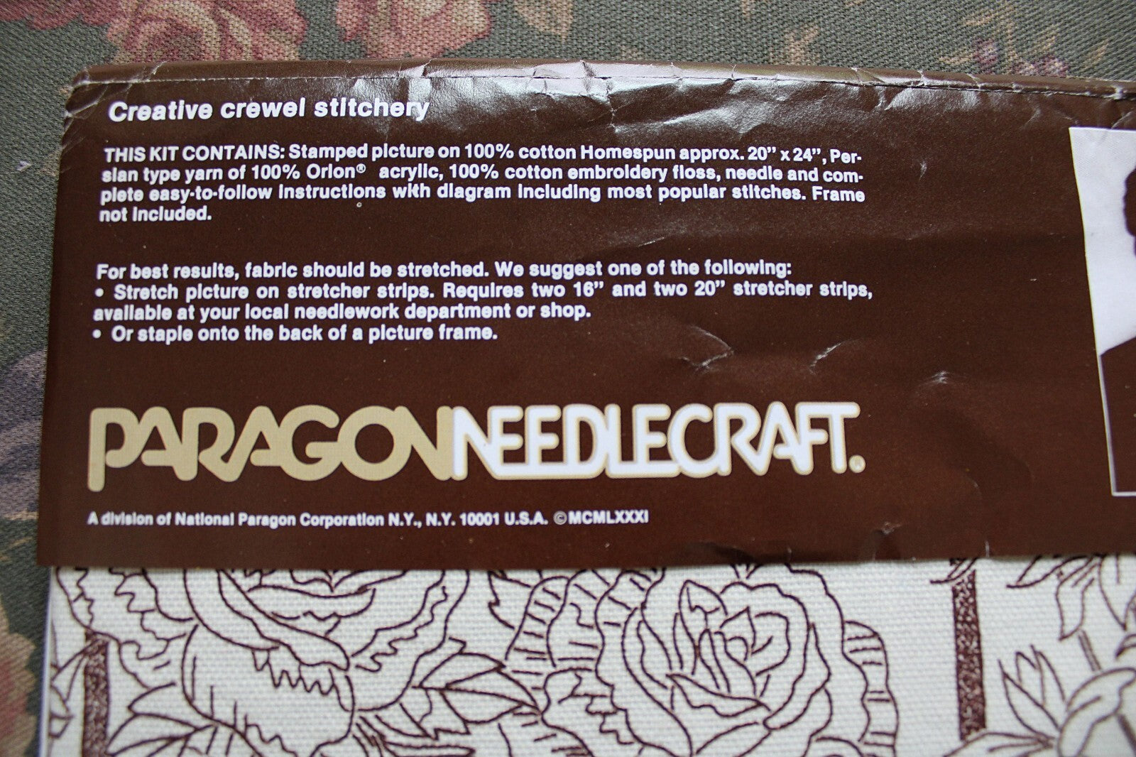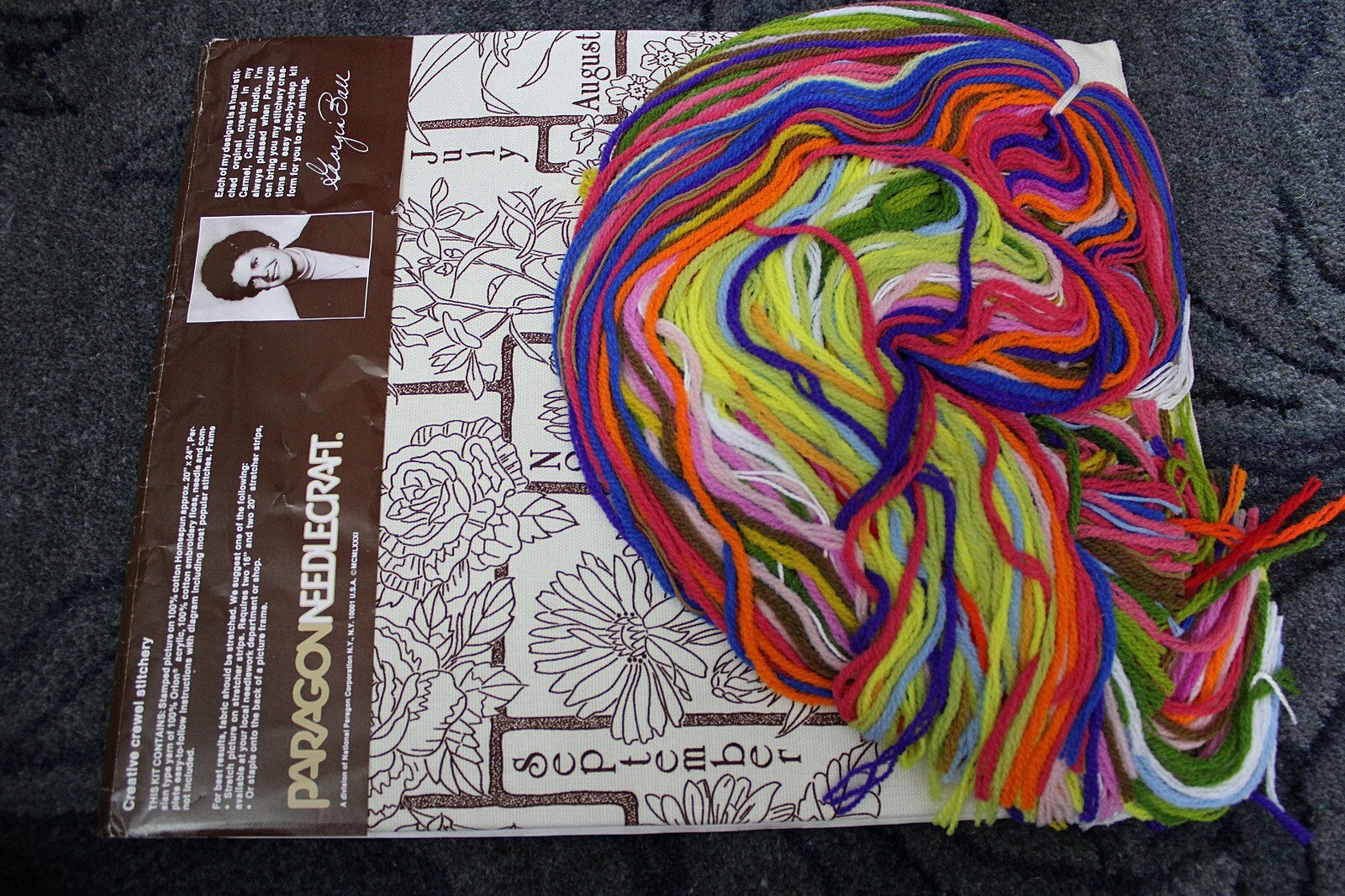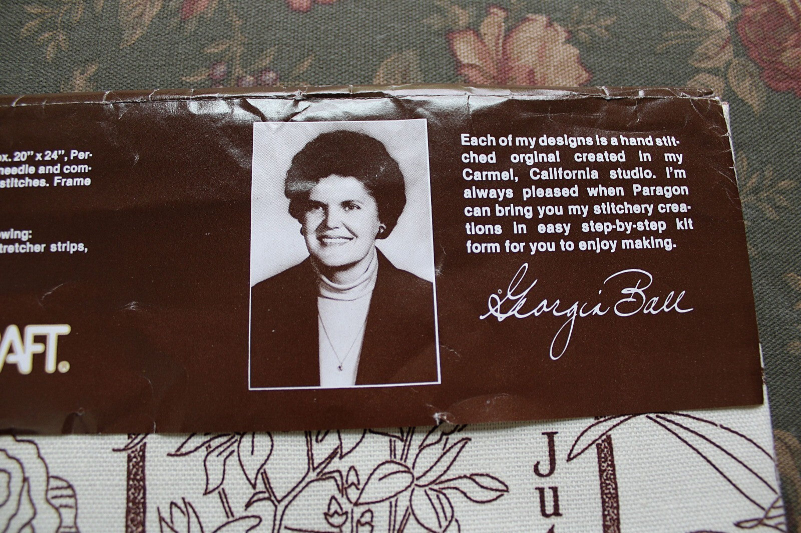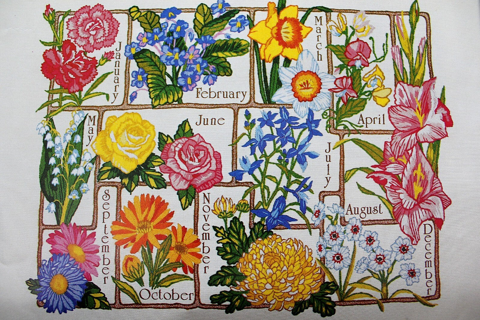 "Flowers of the Month" ... "in all the vivid colors from the palette of Mother Nature in this lovely stitchery in crewel yarns. A tasteful way to display the flowers that represent each month of the year." (per pkg)-Paragon Kit #0704. Design by Georgia Ball.
