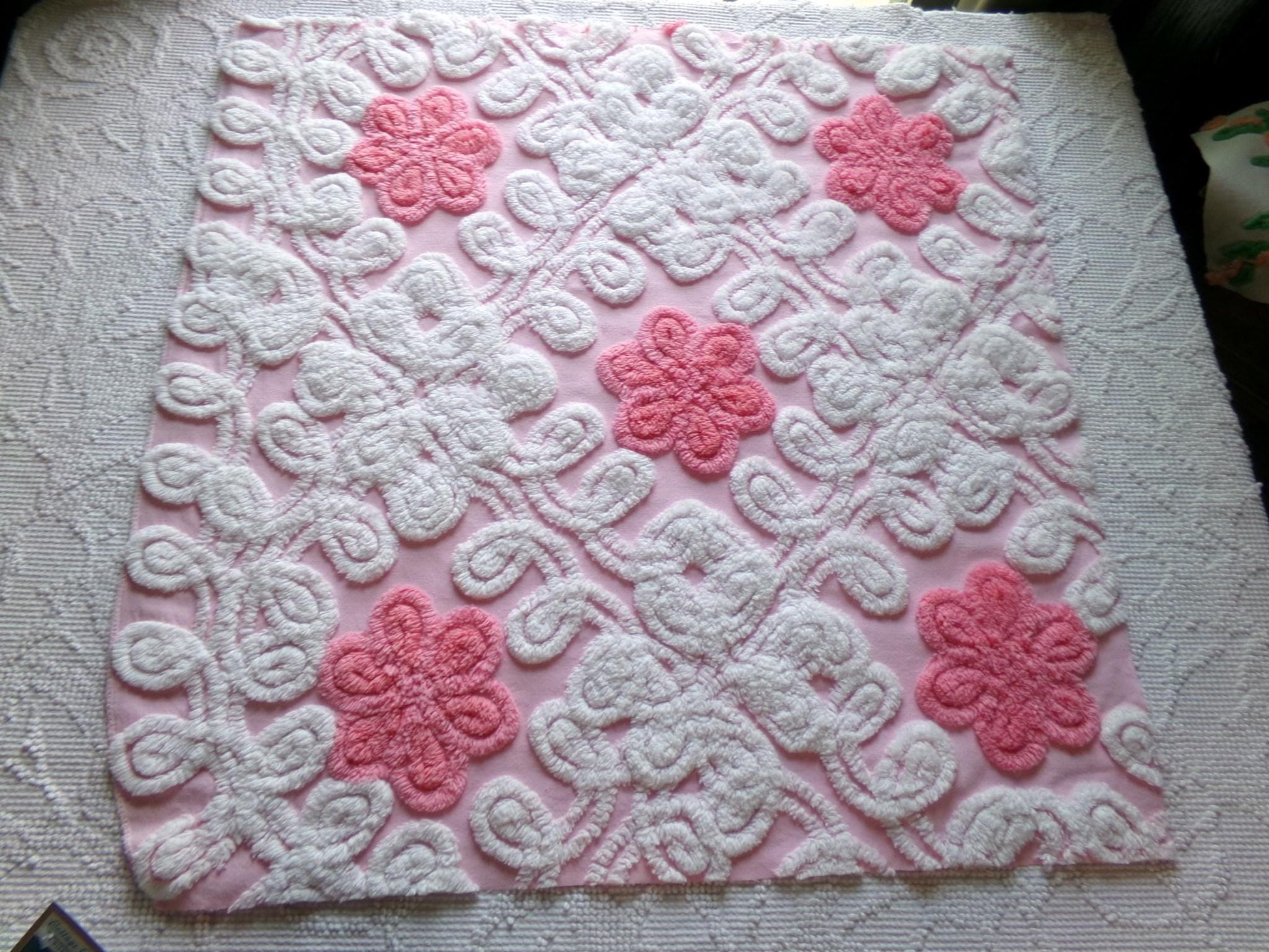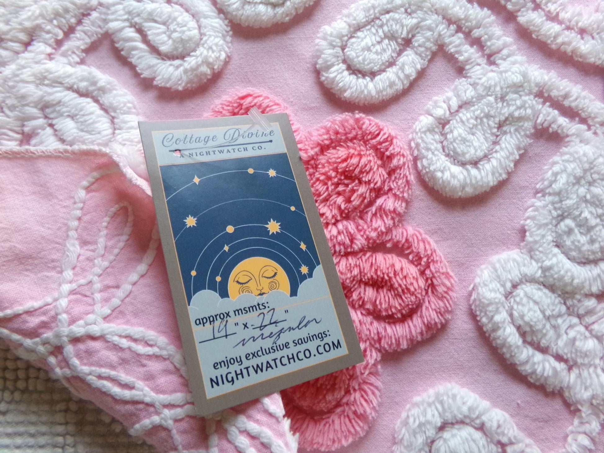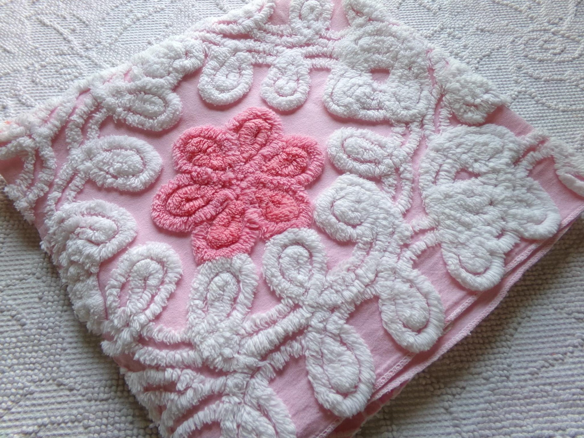 What will you create with this beautiful piece of fluffy floral chenille fabric? Only you know...but one thing is certain...it will be so pretty & feminine. This is a lovely piece of vintage chenille in plush pink floral design surrounded by swirls of thickly tufted curlicues. Set on a soft pink bkgd.Approx 19" x 22" inch pc, a bit irregular with a slightly rounded corner (final img). 100% cotton. Sourced from an original mid 1950s chenille bedspread. You may spot light tuft loss or pulls/pinholes.