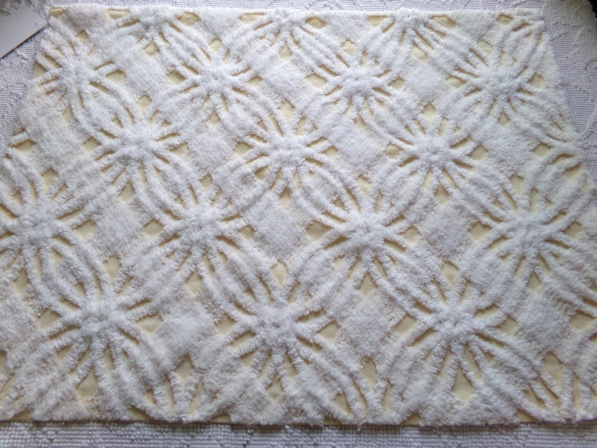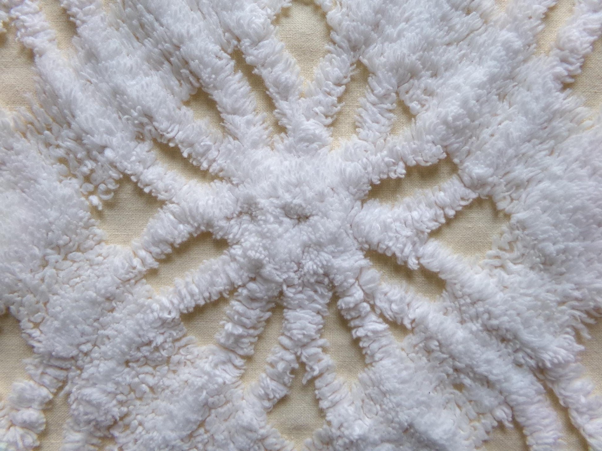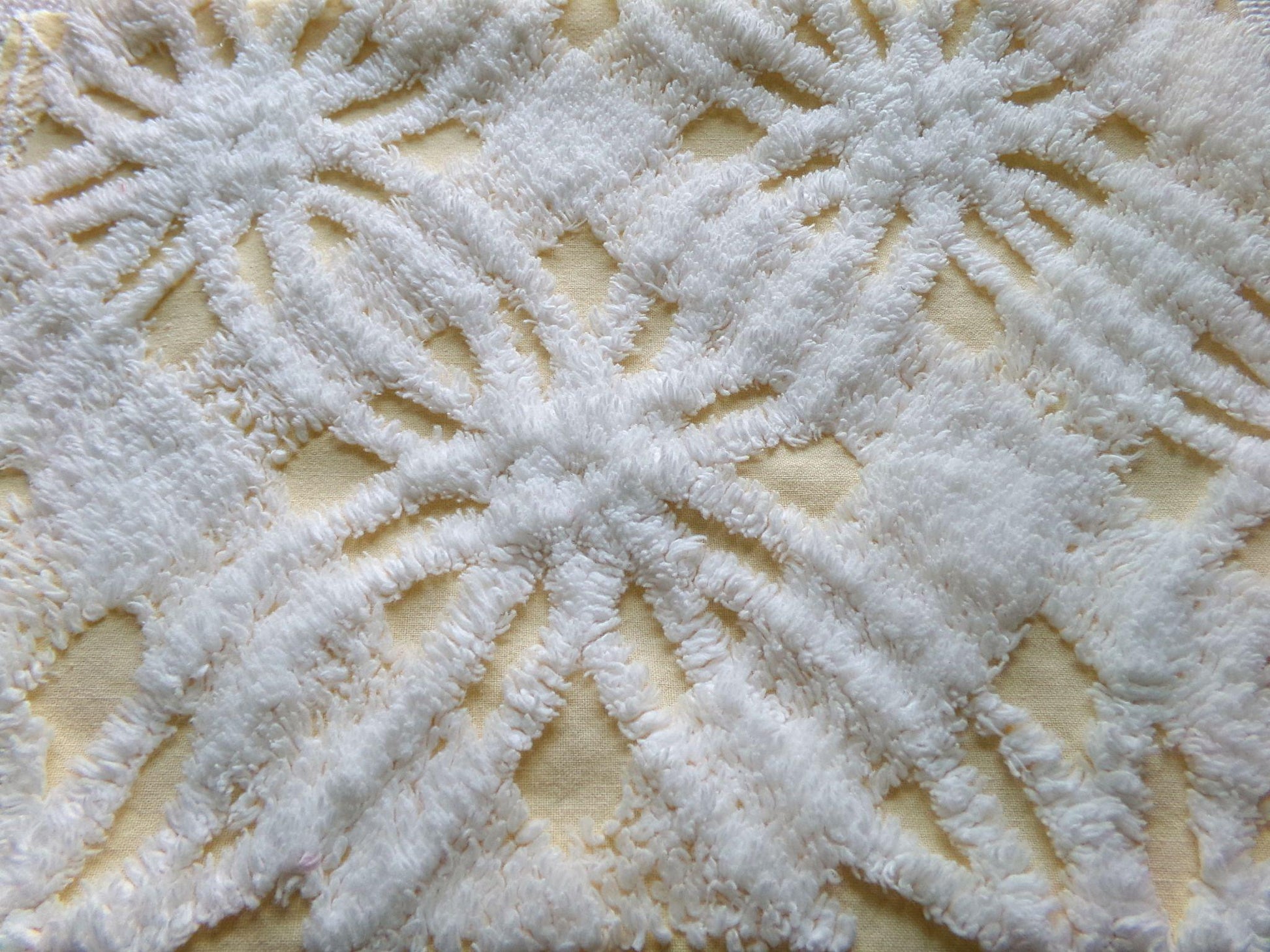 Isn't this the sweetest vintage chenille fabric? I have this design in many colors, but this gentle buttercup yellow is just so pretty. The thick white geometric tufting coordinates so well with the soft yellow bkgd. This is a popular pattern for handmade quilts, especially when paired with florals.Approx 18" x 25" inch pc. 100% cotton. Sourced from an original late 1950s chenille bedspread. You may spot light tuft loss/pinholes.