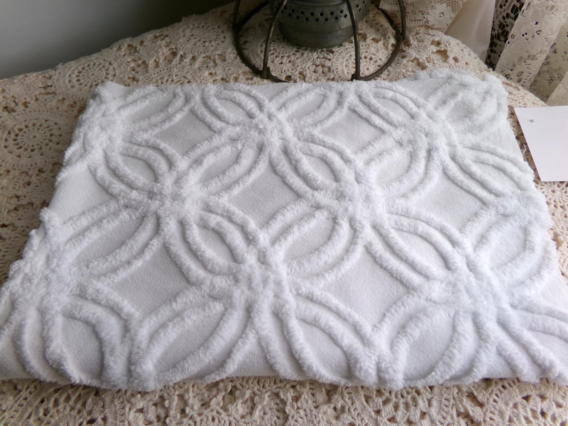 I love how you can incorporate this great chenille fabric into a range of designs, from vintage to modern. It's a versatile piece that presents a simple, repeating pattern of white wedding rings, making it ideal in anything from handmade chenille quilts to small pillows & more.100% strong cotton. Piece measures about 16" x 24" inches. Common to this design, you may notice a few pinholes to the fabric.