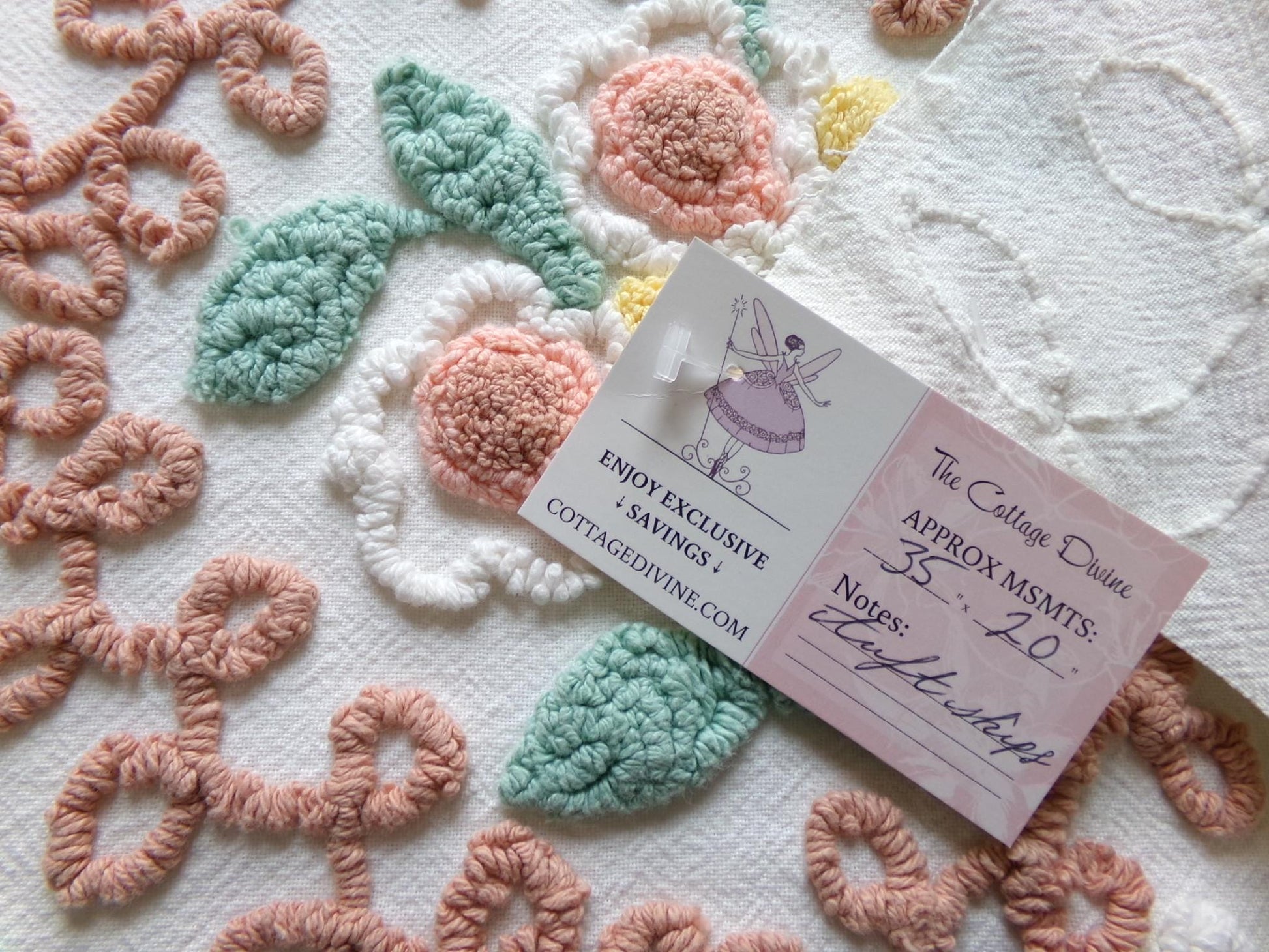 How might you upcycle this beautiful piece of vintage chenille fabric? It is sew pretty, with prominent sculpted rose florals set in a wider pattern of cream color botanical leaves. Love the natural, earthy colors which are emphasized by the pleasing bkgd shade of antique creme.Approx piece msmts: 35" x 20" inches. Great quality heavier weight cotton. Shabby attributes include some tuft skips.