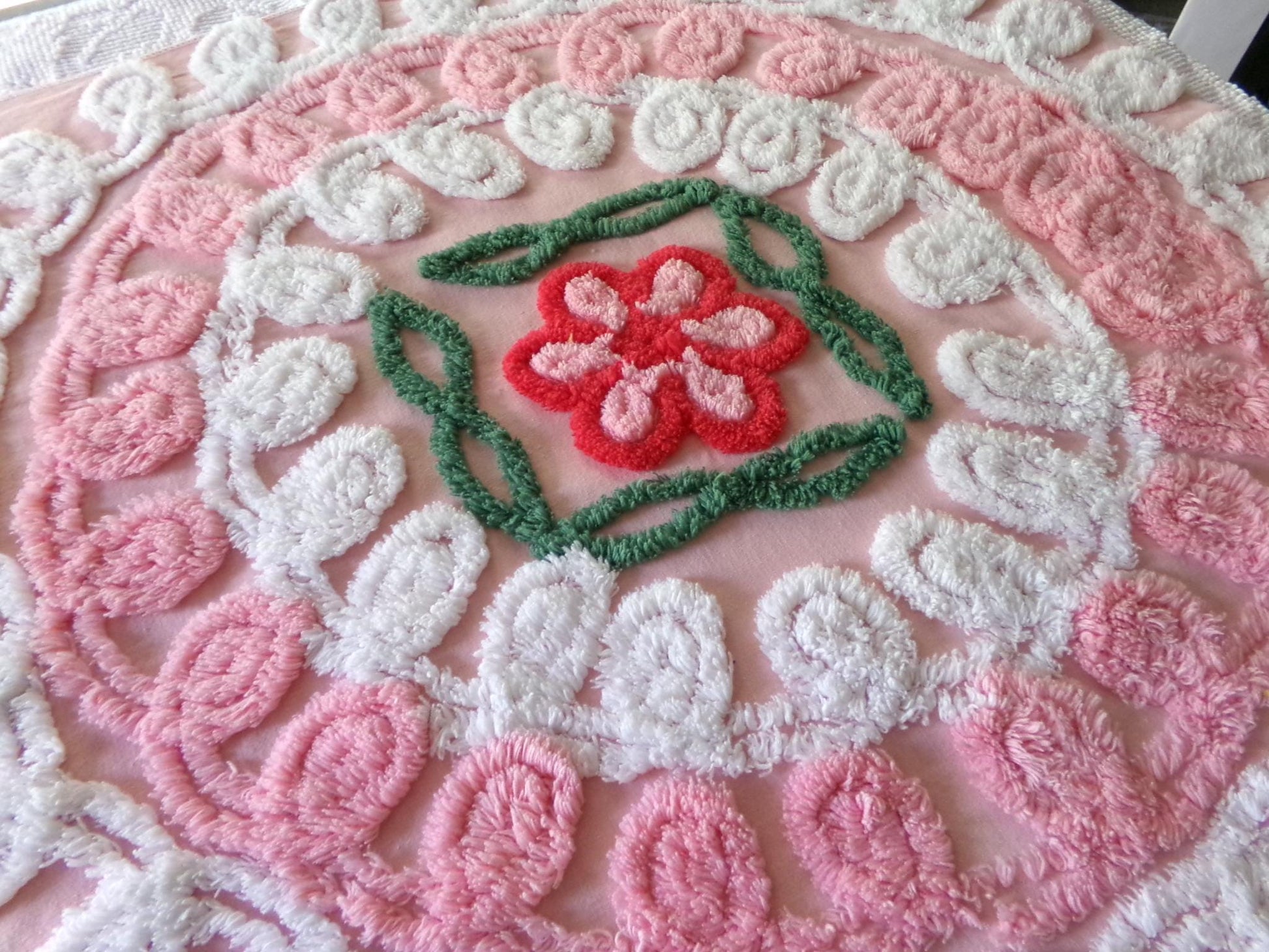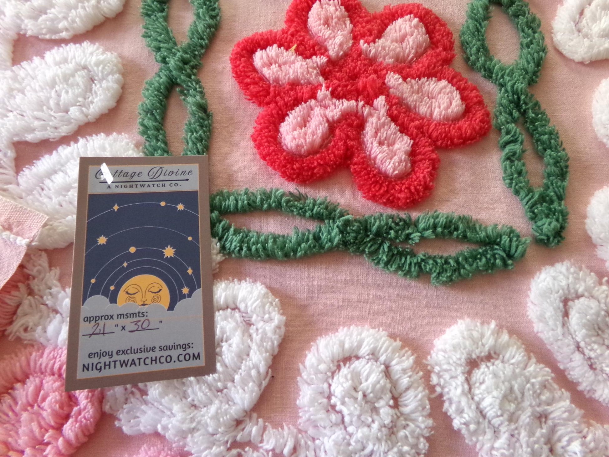 Isn't this chenille fabric so pretty? If you love shabby pinks, I think you'll create something beautiful with it. This was sourced from a 1950s vintage chenille bedspread in what has become known as a wedding cake or frosted cake design, The colors on this fabric piece are so lovely, in soft pink, white, and a little rose flower in a green leaf square.100% soft cotton. Piece measures about 21" x 30" inches. Common to this design, there are some pinholes & minor skipped tufts (see final img).