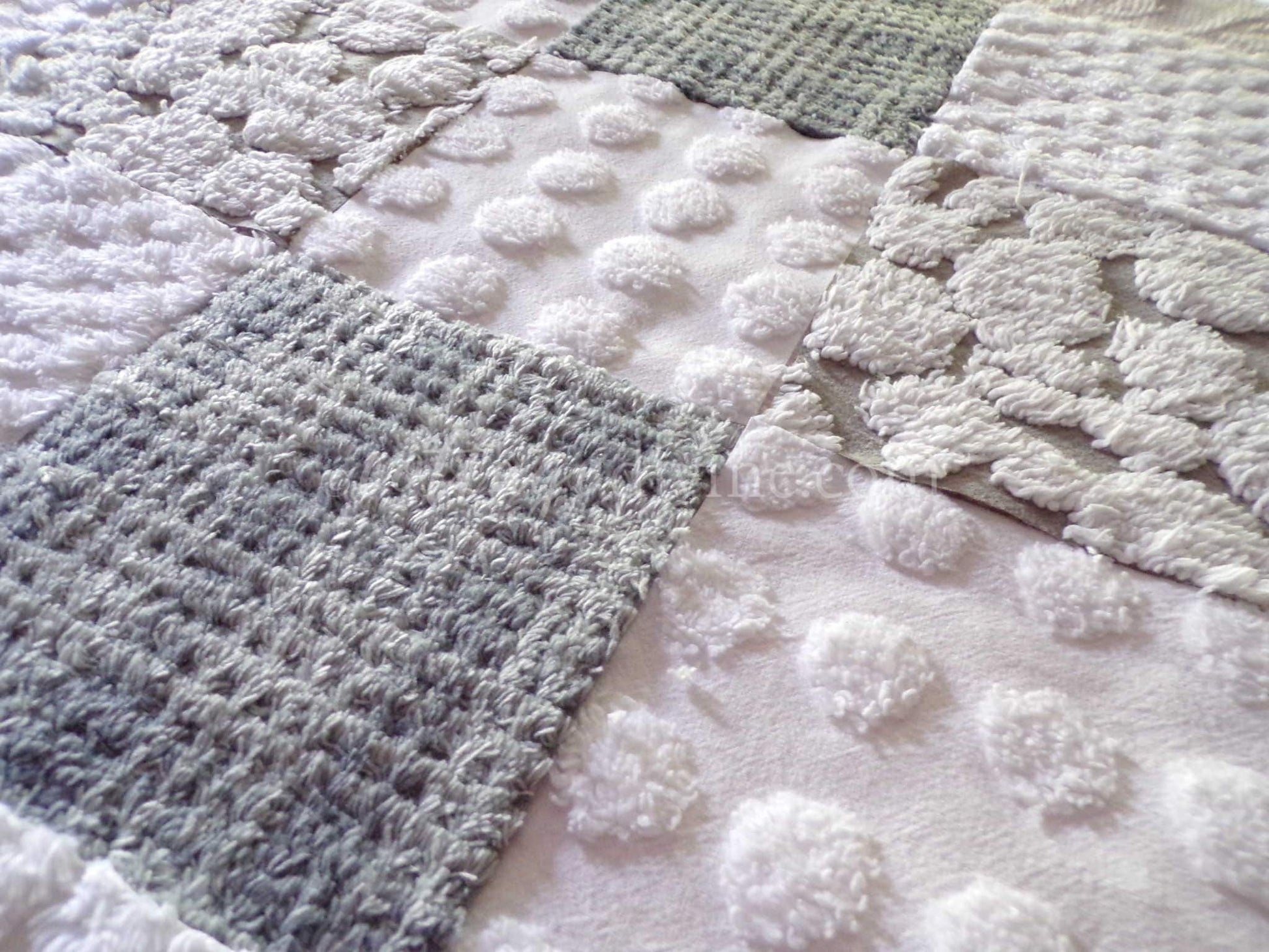 A chic, modern, gender neutral selection of tufted, texturized chenille fabric squares...you'll receive a total of 16 separate, rotary cut quilt squares measuring 6" x 6" inches each.Includes 4 each of: grey & white clouds, moody grey plaid, white lattice & white coin pop