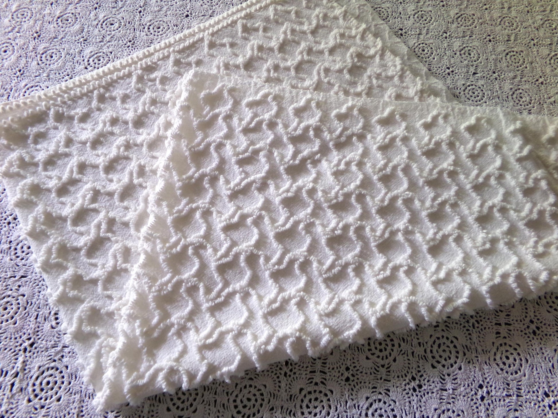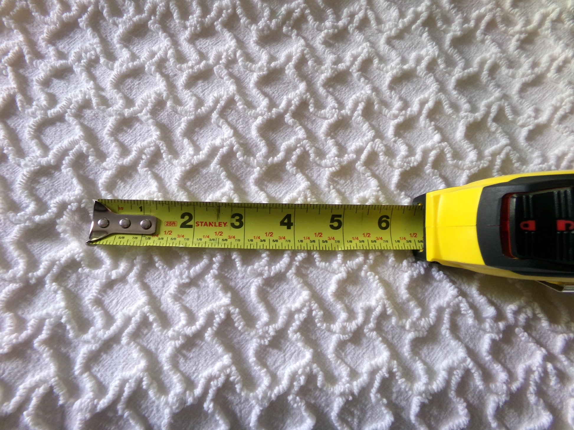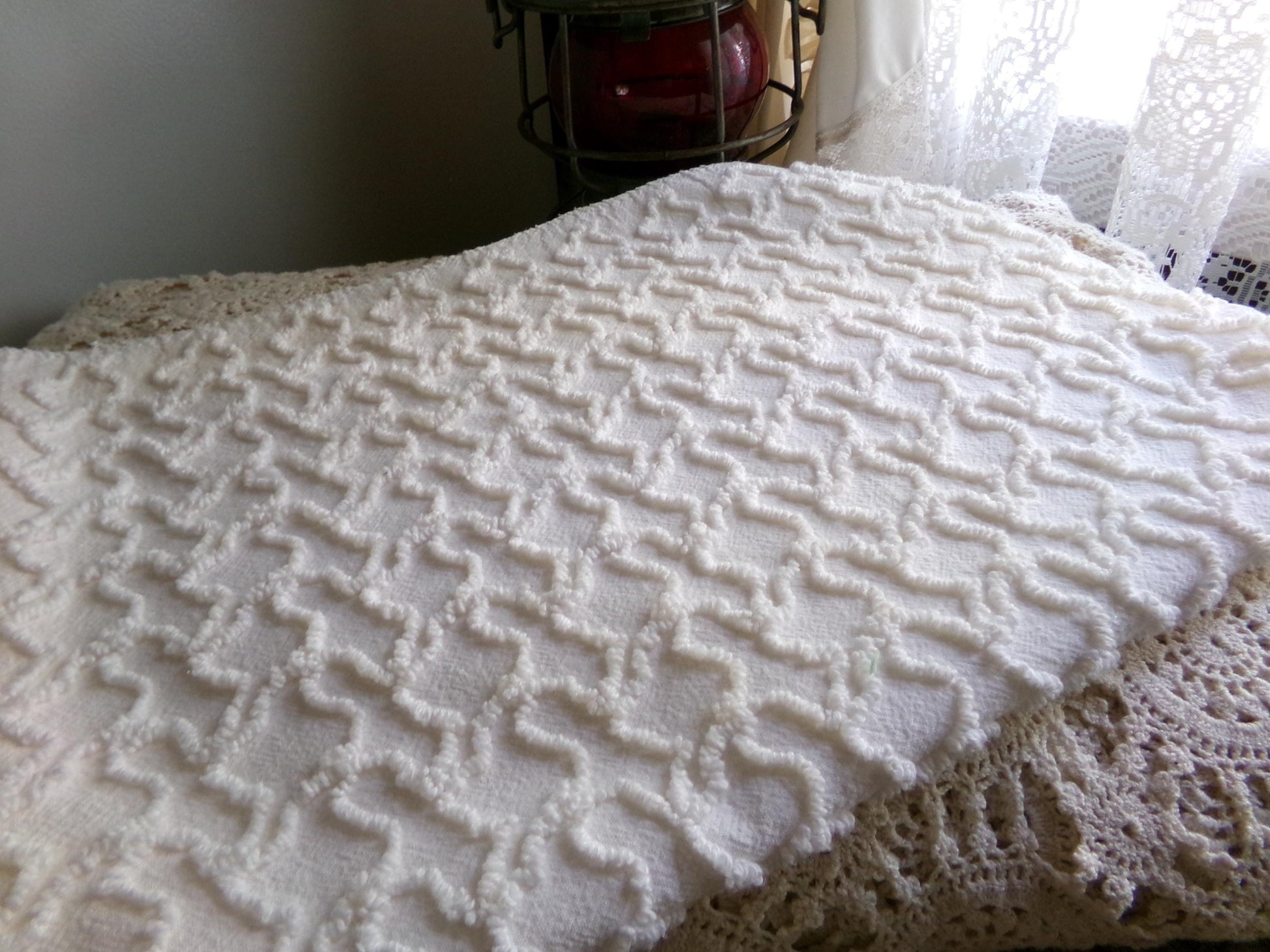 Need a neutral fabric piece with some nice textural interest? This vintage chenille material features a popular squiggly squiggles needle tufted pattern, in a soft, pleasing off white or very light cream tone (it is not bright white).100% lightweight cotton. Measures approx 20" x 25" inches.