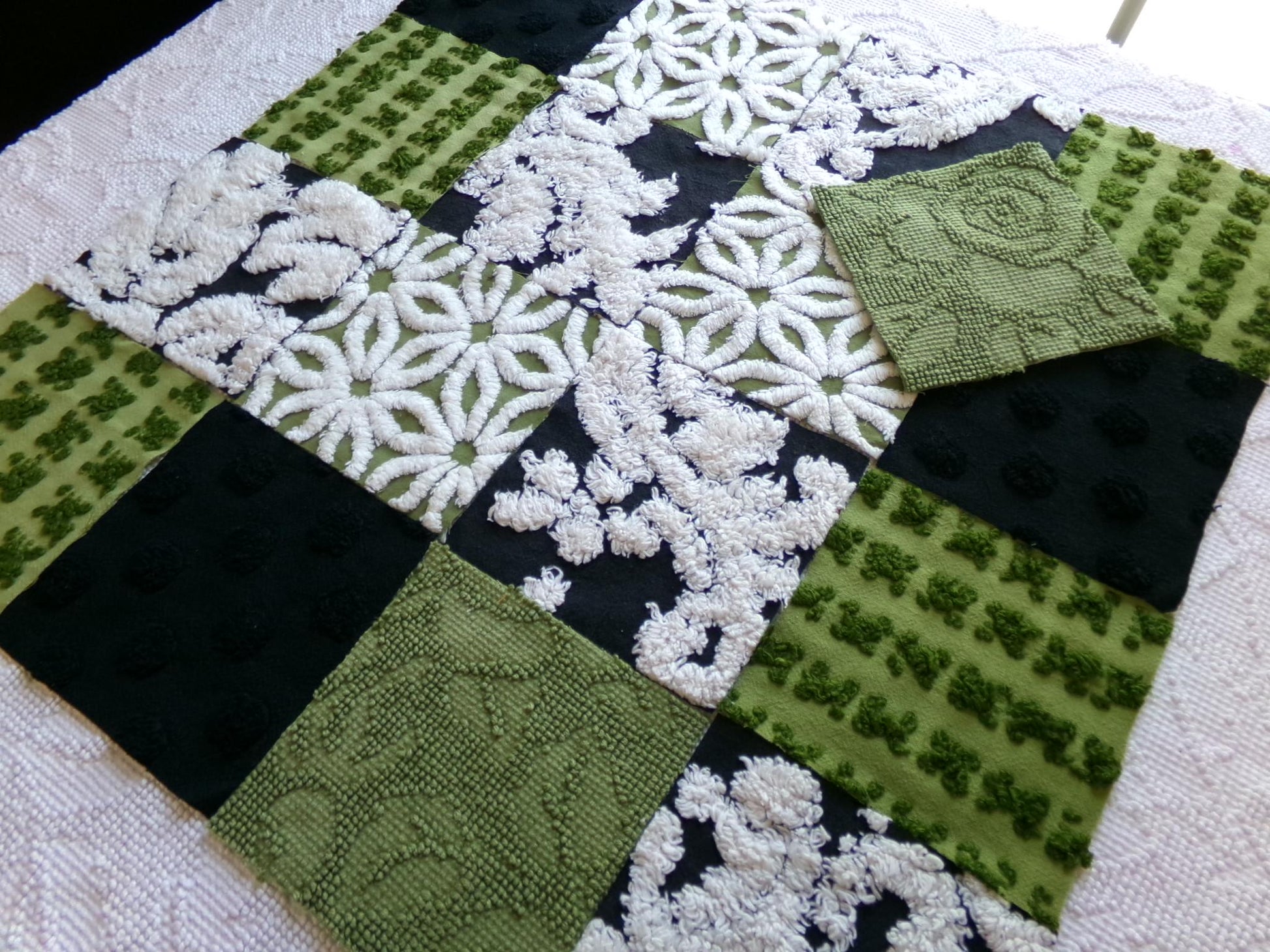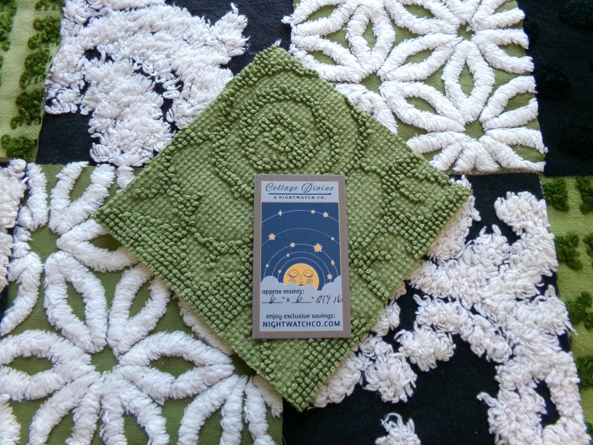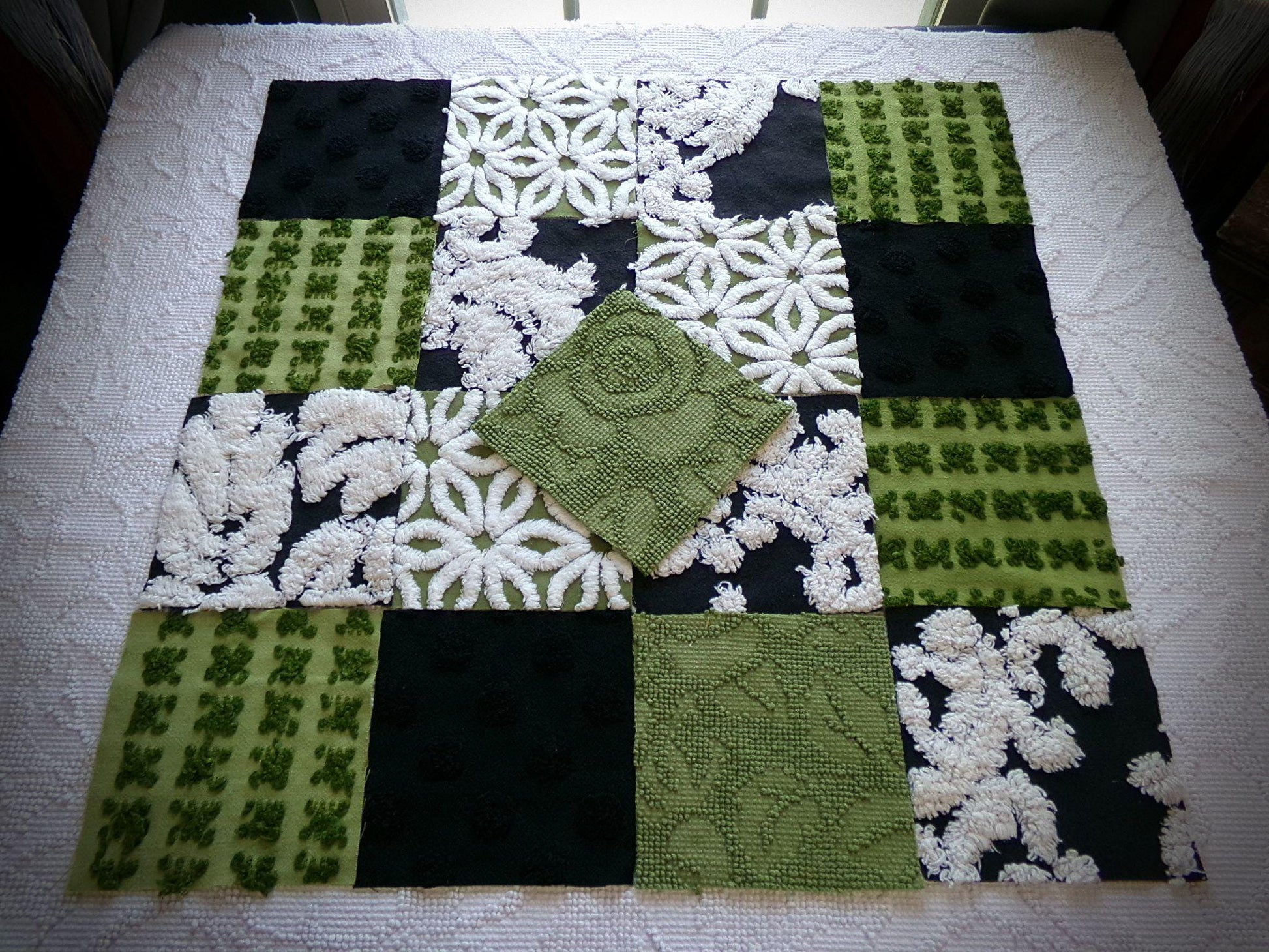 see our full inventory, cottagedivine.comA little green goblin might just peek out from beneath the tufts of chenille to say hello ;) If you love retro boho style, I think you'll love this wild set of 17 chenille fabric squares in rare colors...onyx black and olive green that come alive with the contrast white tufting.
