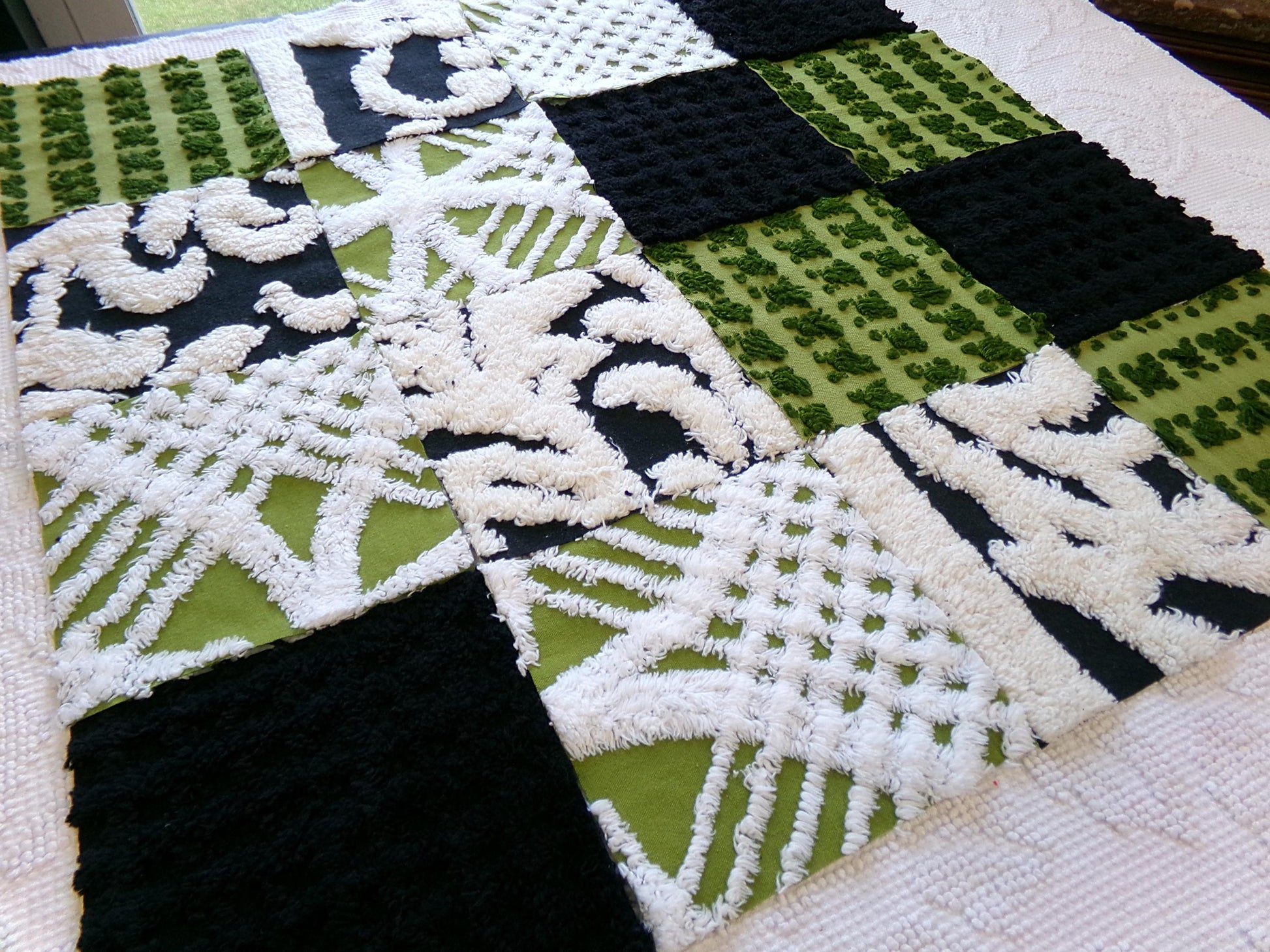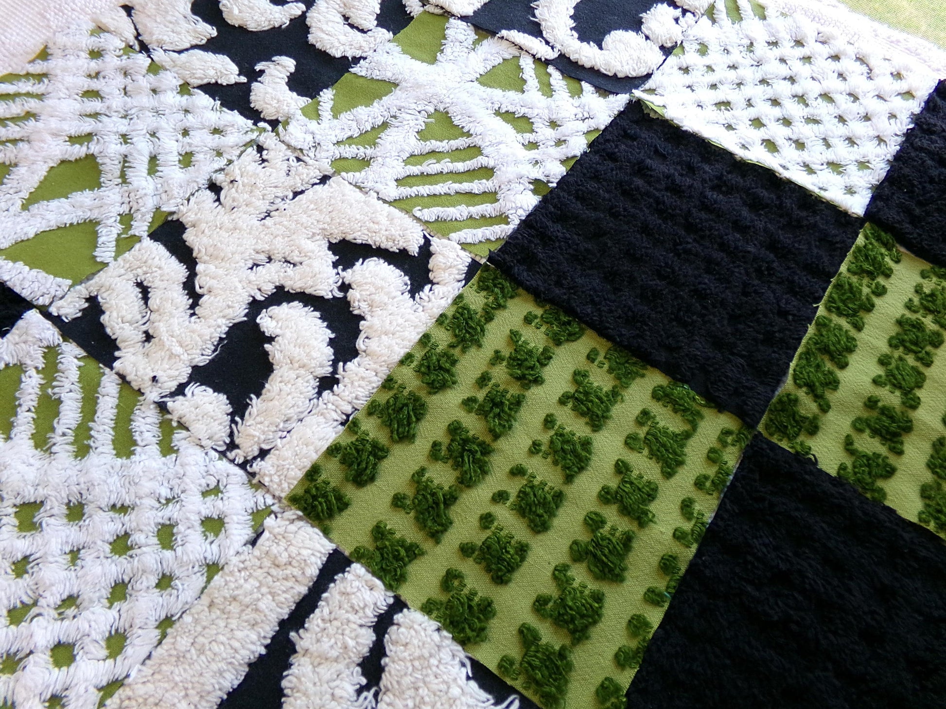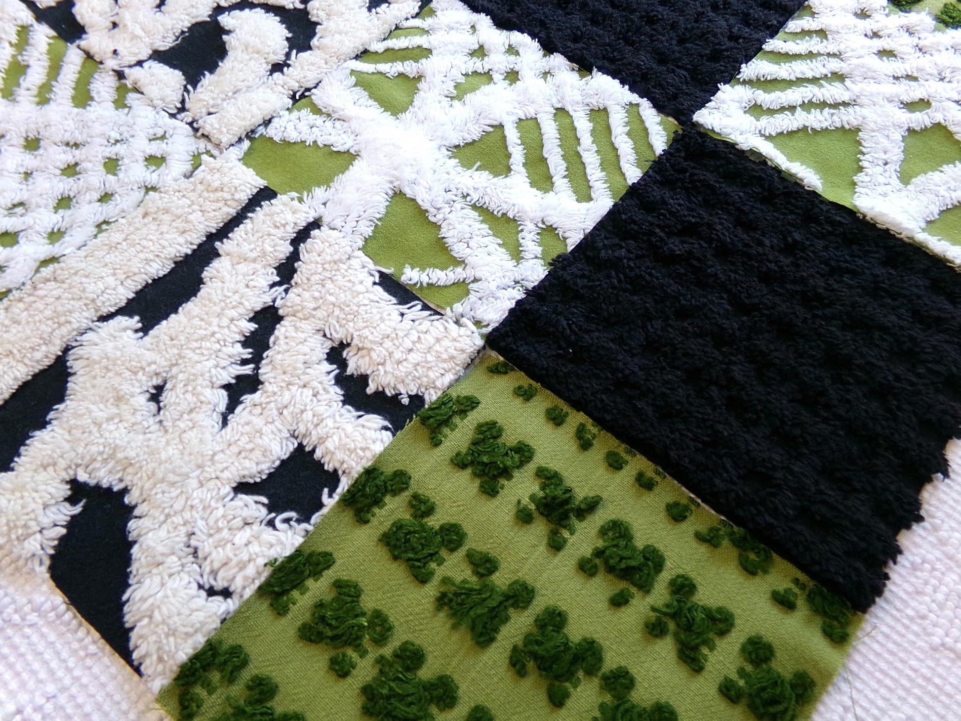see more, cottagedivine.comLooking for some of the most unique colors & textures in vintage chenille? This unusual set of chenille fabric squares features a standout mix of goblin greens and moody blacks.