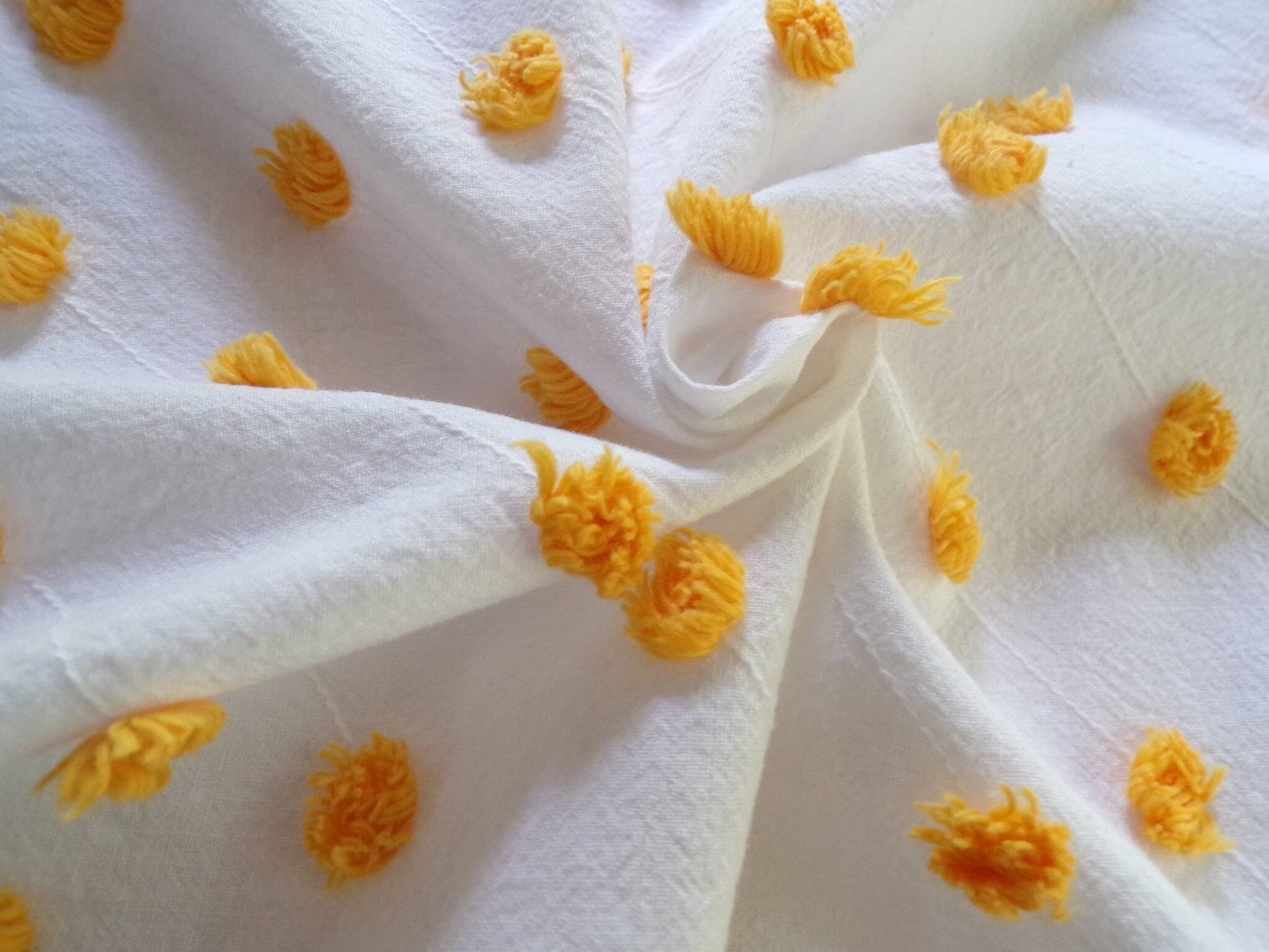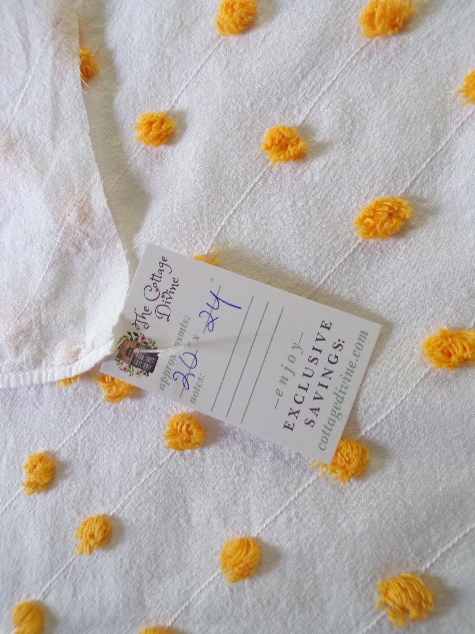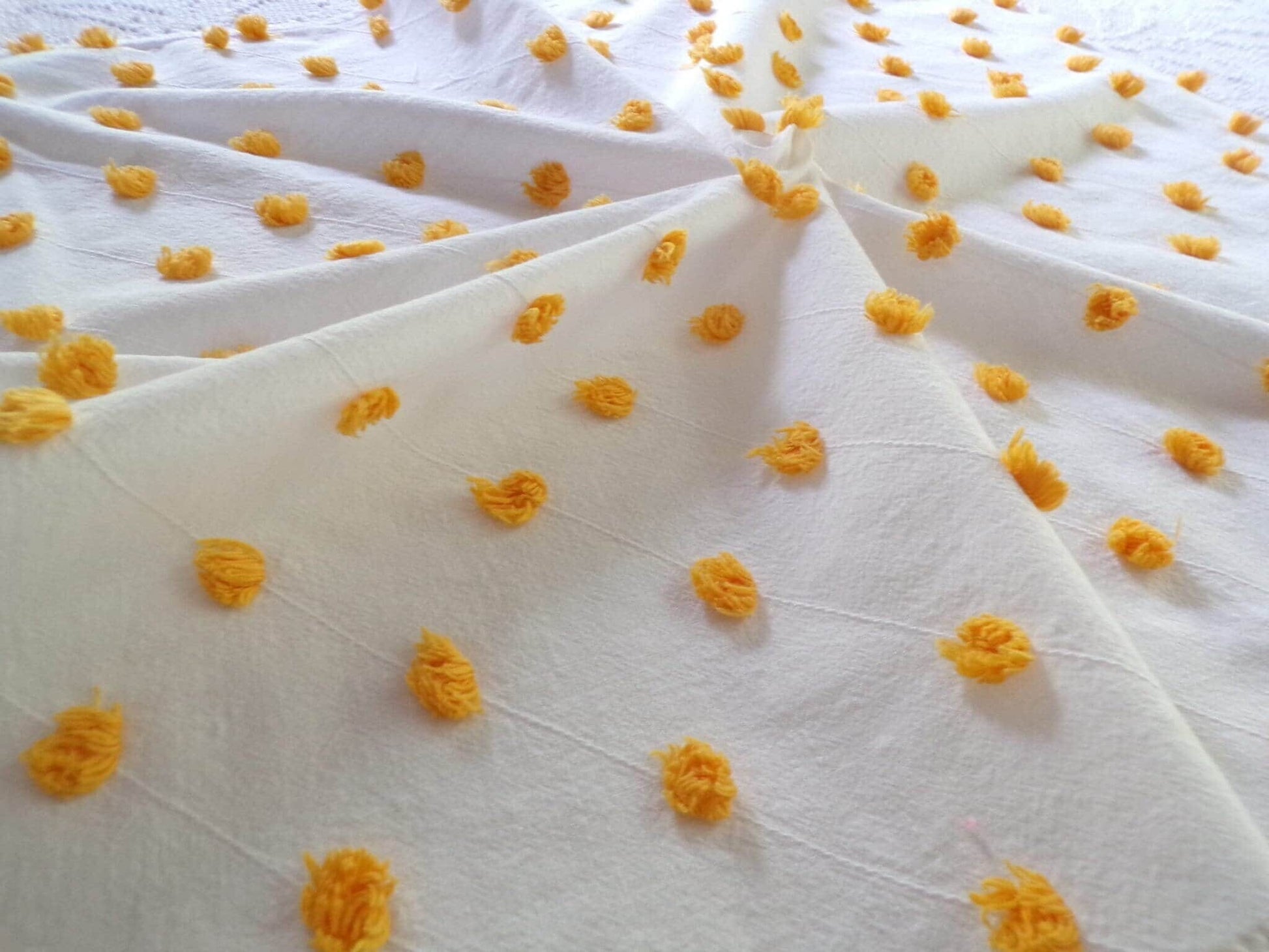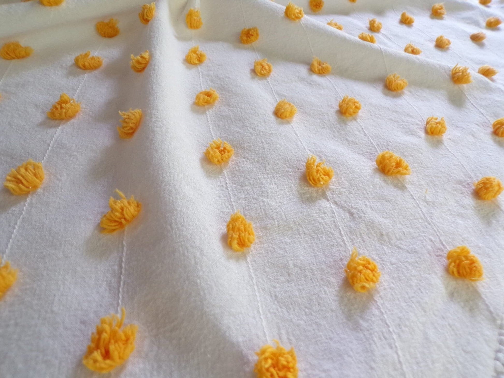 If you love unique fabric, you'll appreciate this fabulous piece of vintage chenille. Measuring 24" x 20" inches approx, it features widely spaced little puff pops in a striking harvest gold-meets-pumpkin autumnal colortone. Take note of the interesting fabric - each pop is connected via a thin, fine line.This is true, original antique chenille that has been handtufted, so it is very lightweight old cotton. Missing one pop as seen final img.