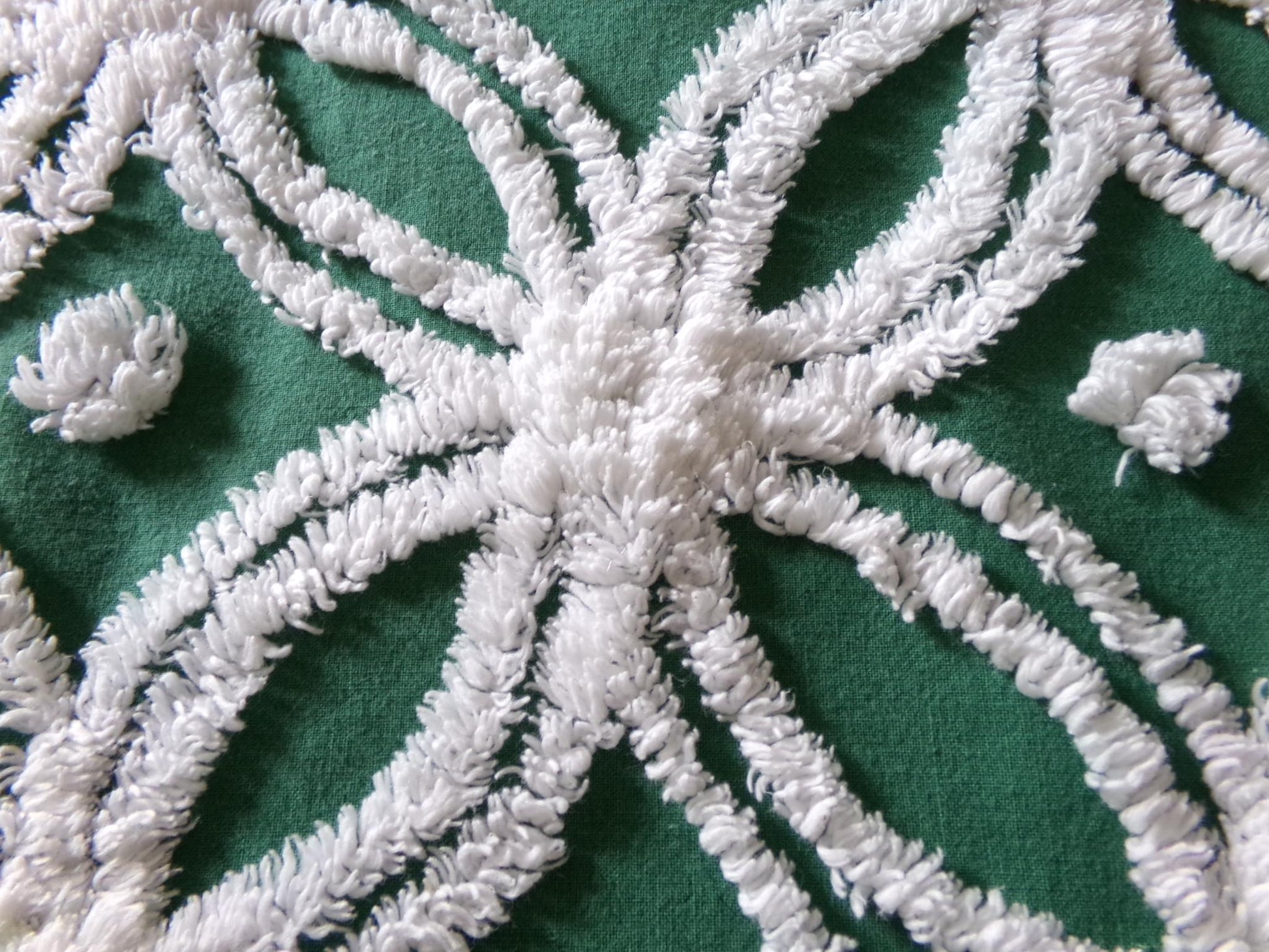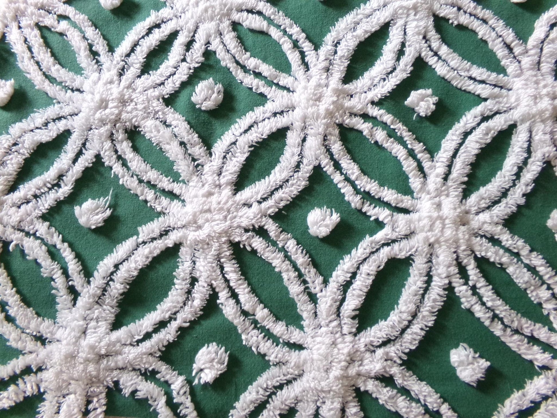 So, this might be one of the most gorgeous chenille fabrics we have. Maybe it's the rich evergreen color and the way the white tufting stands out that I love most, or the way the fluffy dots look so cute in the wedding ring design...I think you'll treasure it too. It will surely make a striking presentation in any project you choose to incorporate it into.Approx msmts: 20" x 27" inches. 100% quality cotton. Common to the fabric, you may see a few minor pinholes.