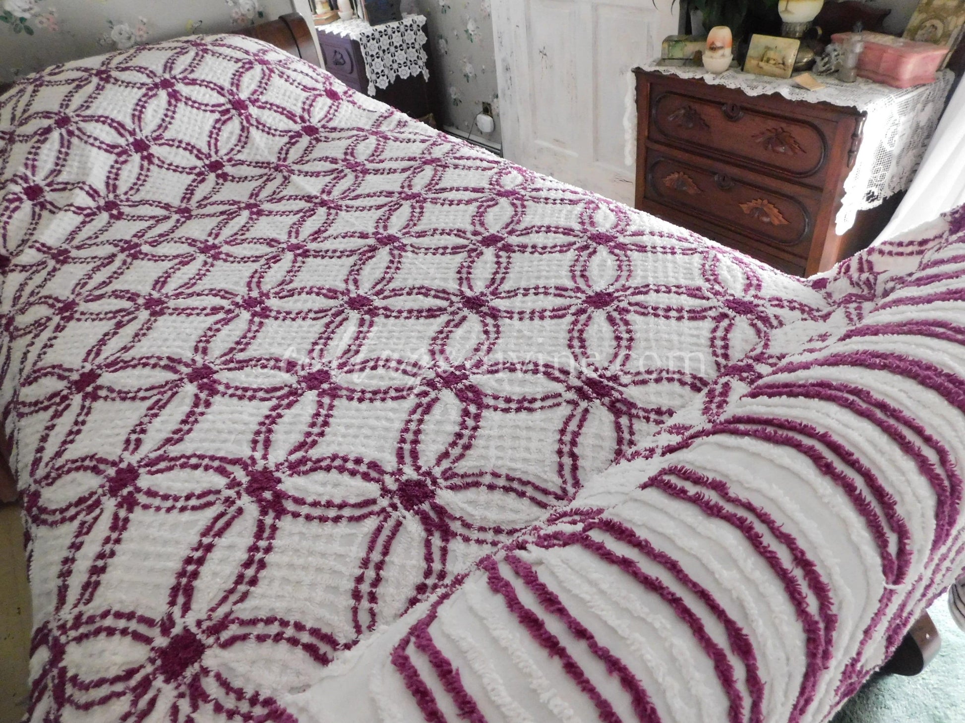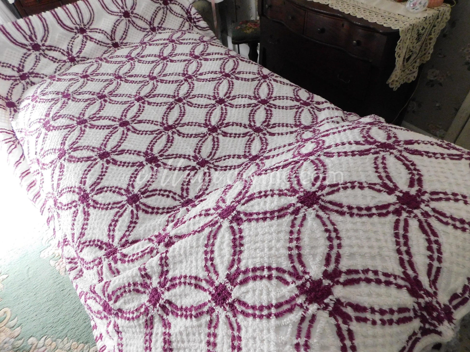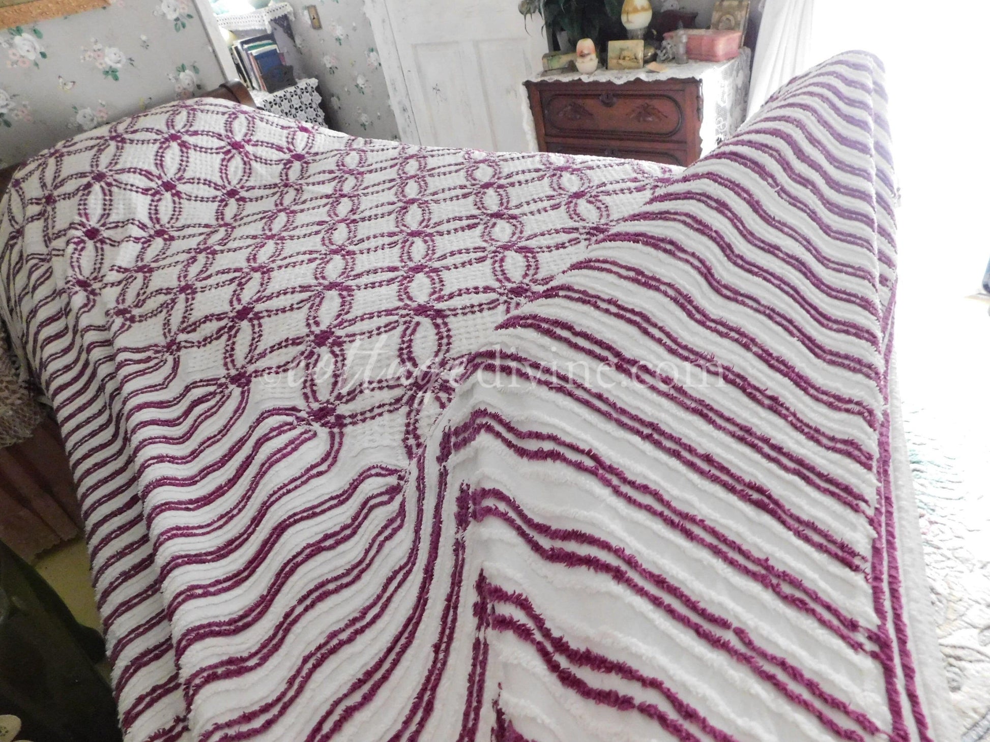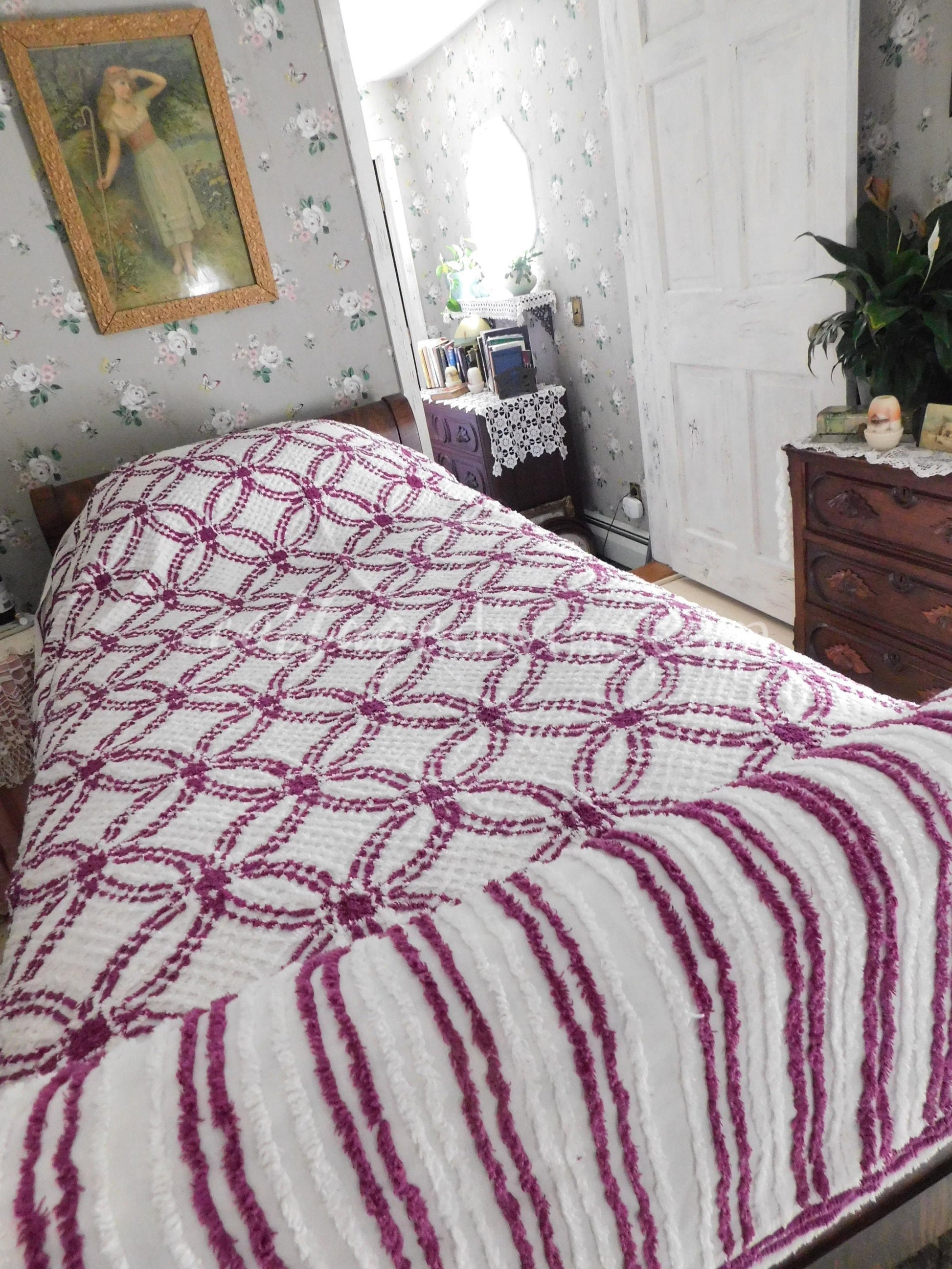 Simply gorgeous full size (approx 88"W x 100"L) vintage chenille bedspread, in a striking colorway of plum mulberry & white. Features a traditional midcentury wedding ring pattern with cathedral accents along the drop sides. 100% mid-weight cotton.::all vintage chenille will show age-related attributes such as small age marks, pinholes, pulled tufts, etc.