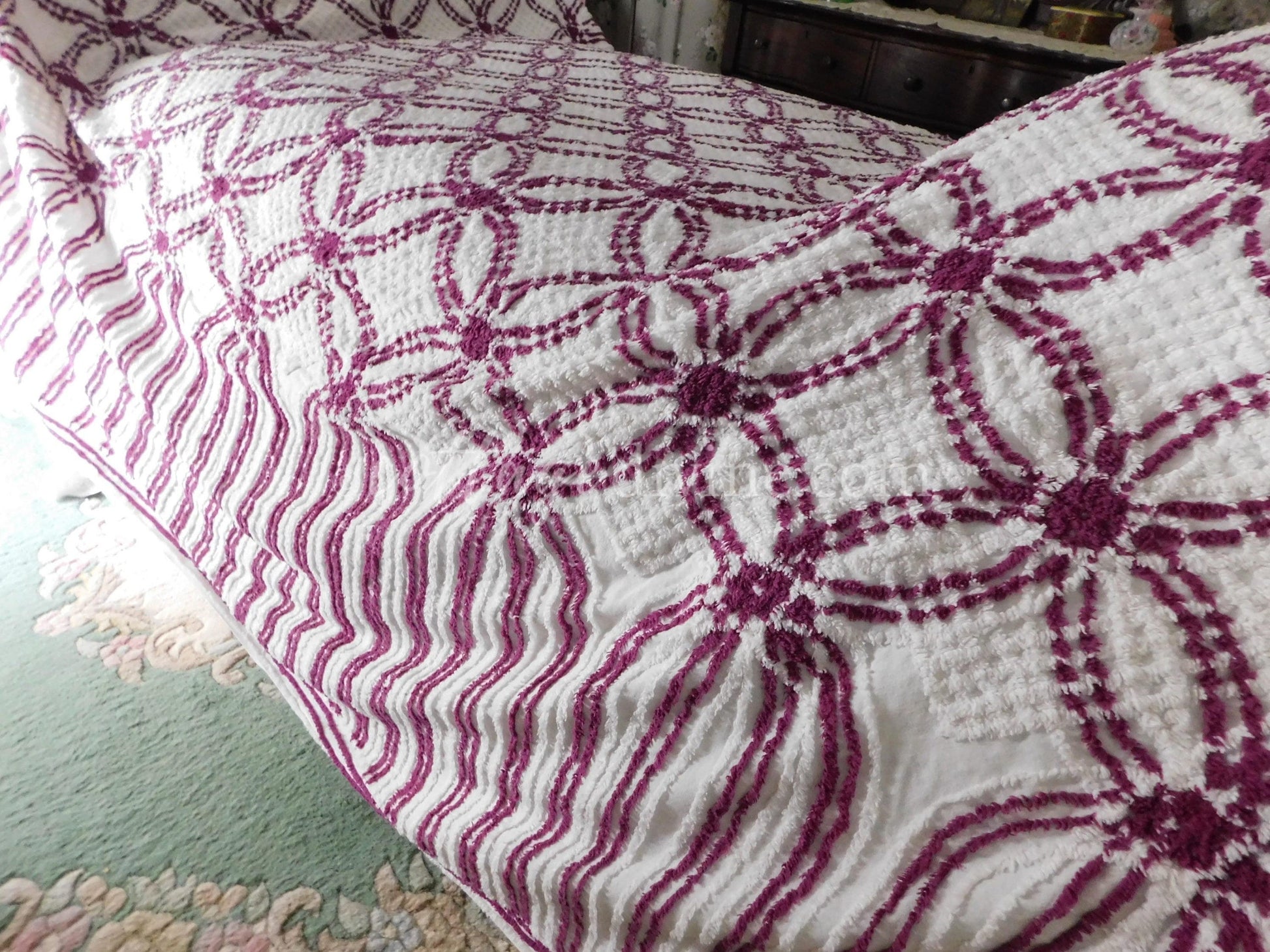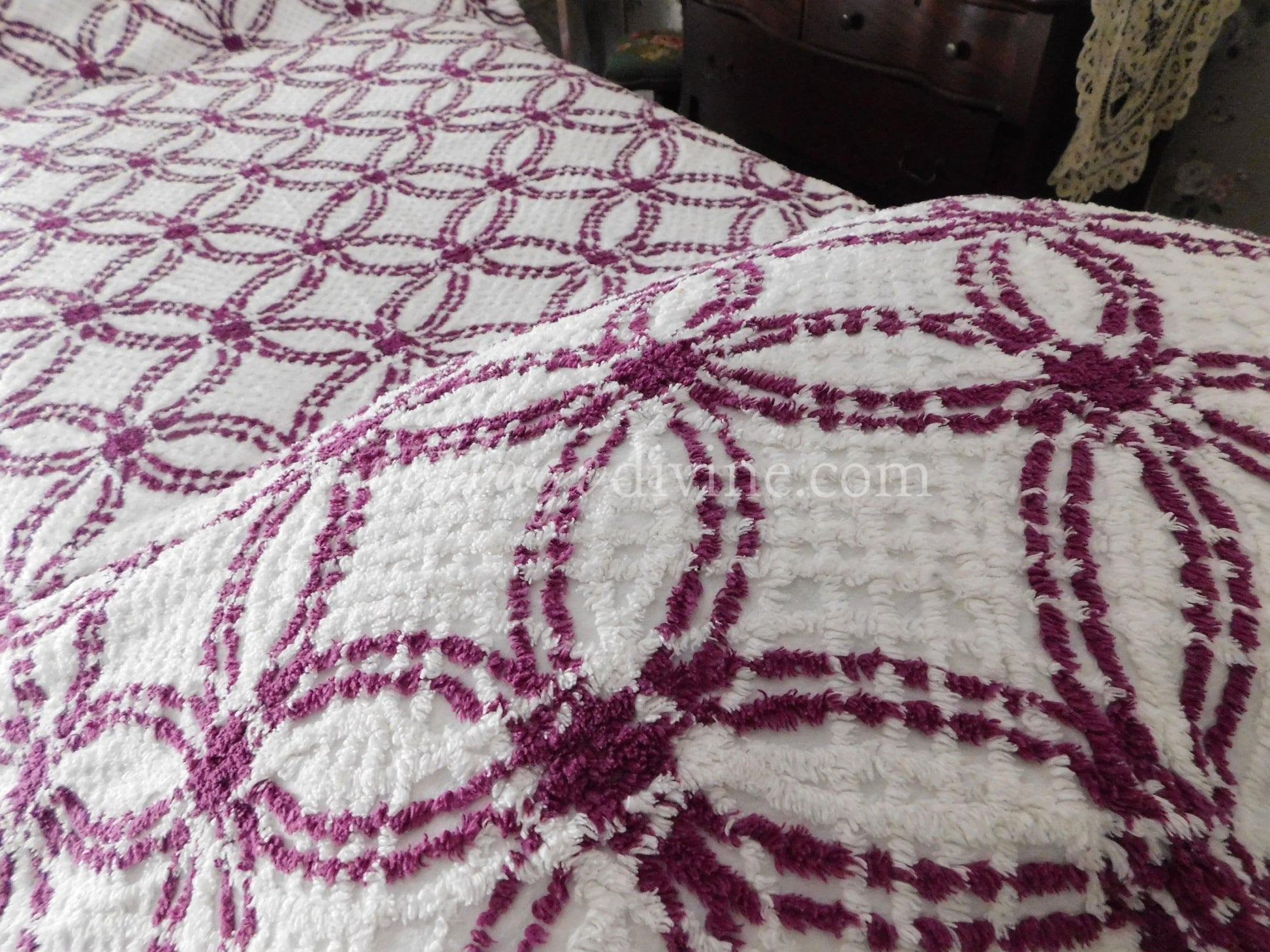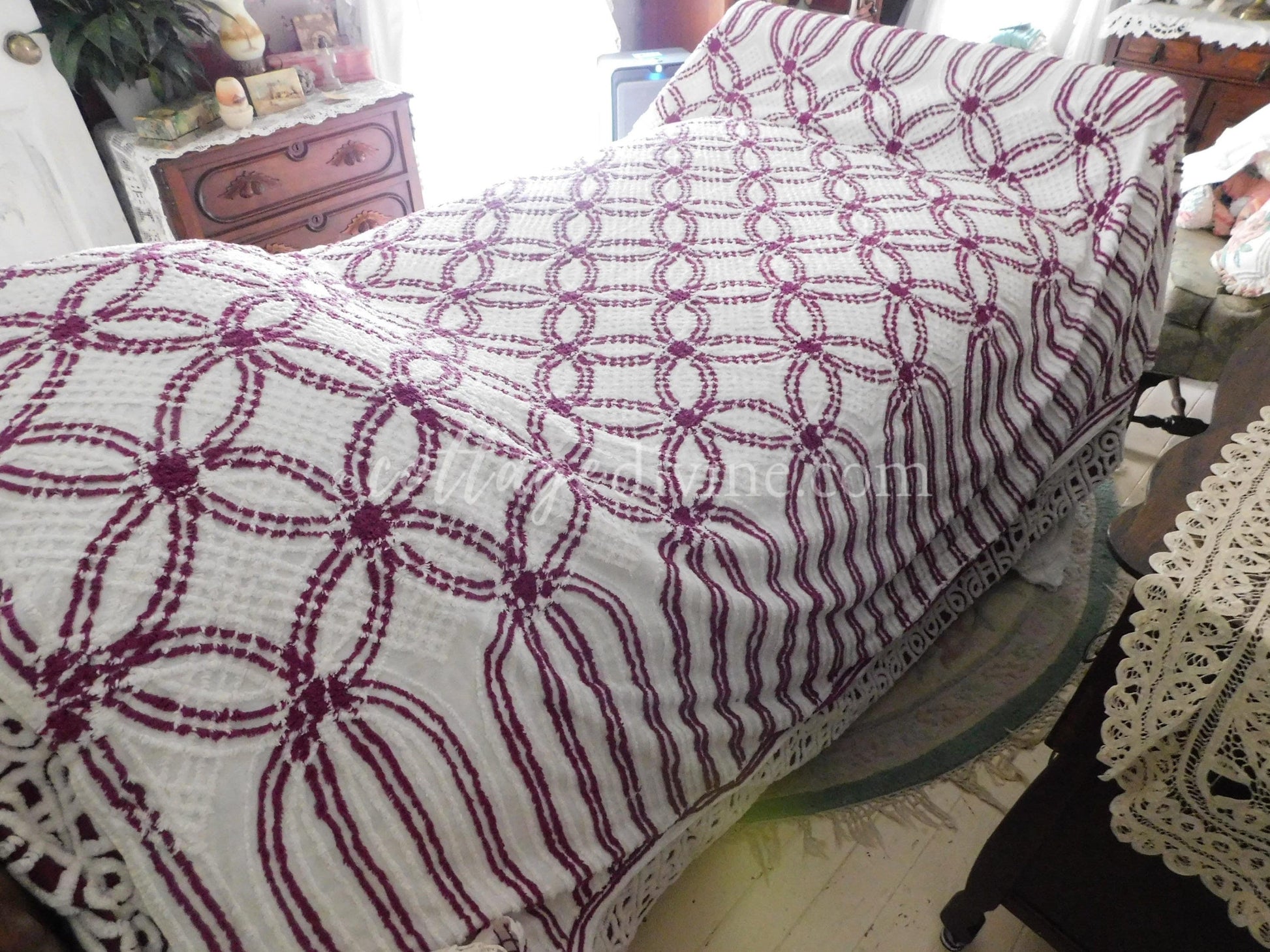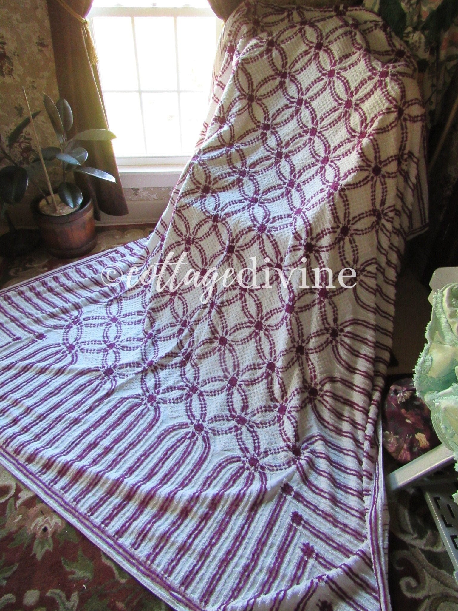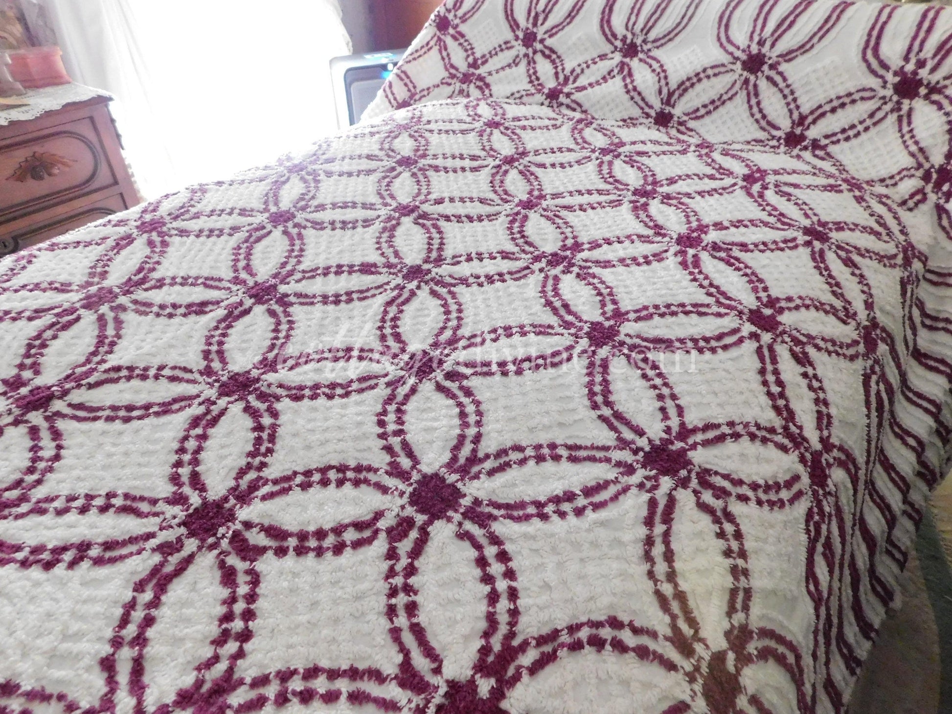 Simply gorgeous full size (approx 88"W x 100"L) vintage chenille bedspread, in a striking colorway of plum mulberry & white. Features a traditional midcentury wedding ring pattern with cathedral accents along the drop sides. 100% mid-weight cotton.::all vintage chenille will show age-related attributes such as small age marks, pinholes, pulled tufts, etc.