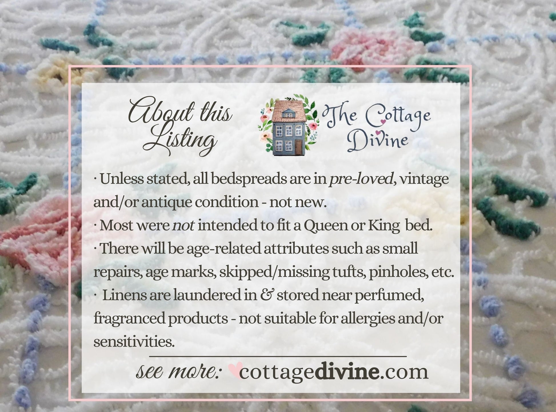 Shabby chic. Cottage style. Farmhouse chic. The Cottage Divine specializes in a blend of all three, emphasizing a curated selection of chenille bedspreads, robes, fabric, quilt squares & moreWhy vintage chenille? Because of its availability in an endless array of colors & textures...its unique ability to adapt to both vintage and modern settings...Wherever it is incorporated, chenille infuses an unmatched warmth & nostalgiaOh, one little mention: once it enchants you, a single piece of chenille will quickly multiply - and you'll never quite have enough......