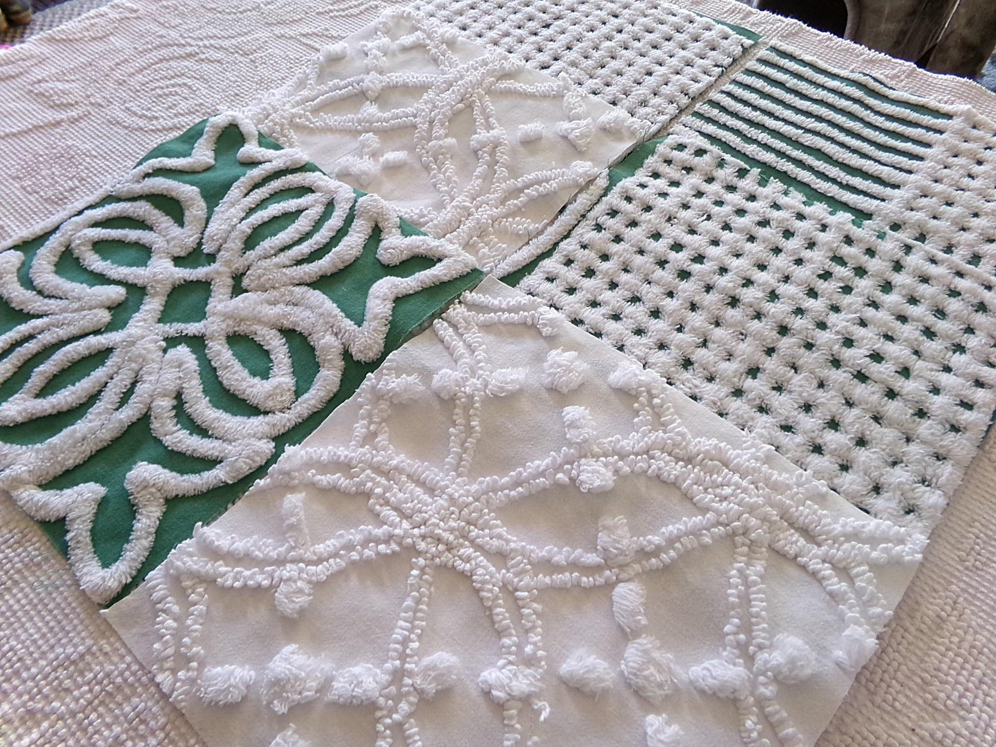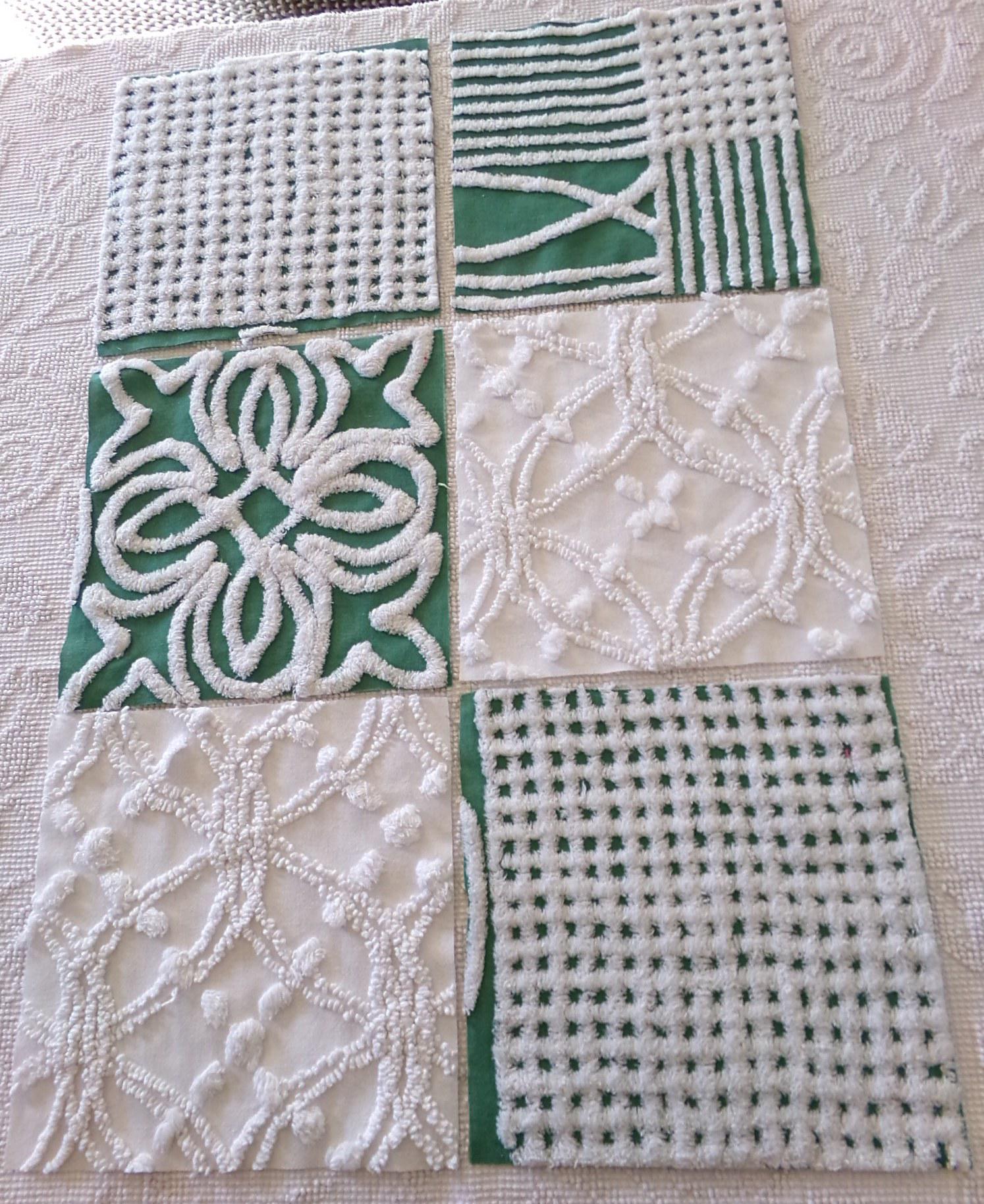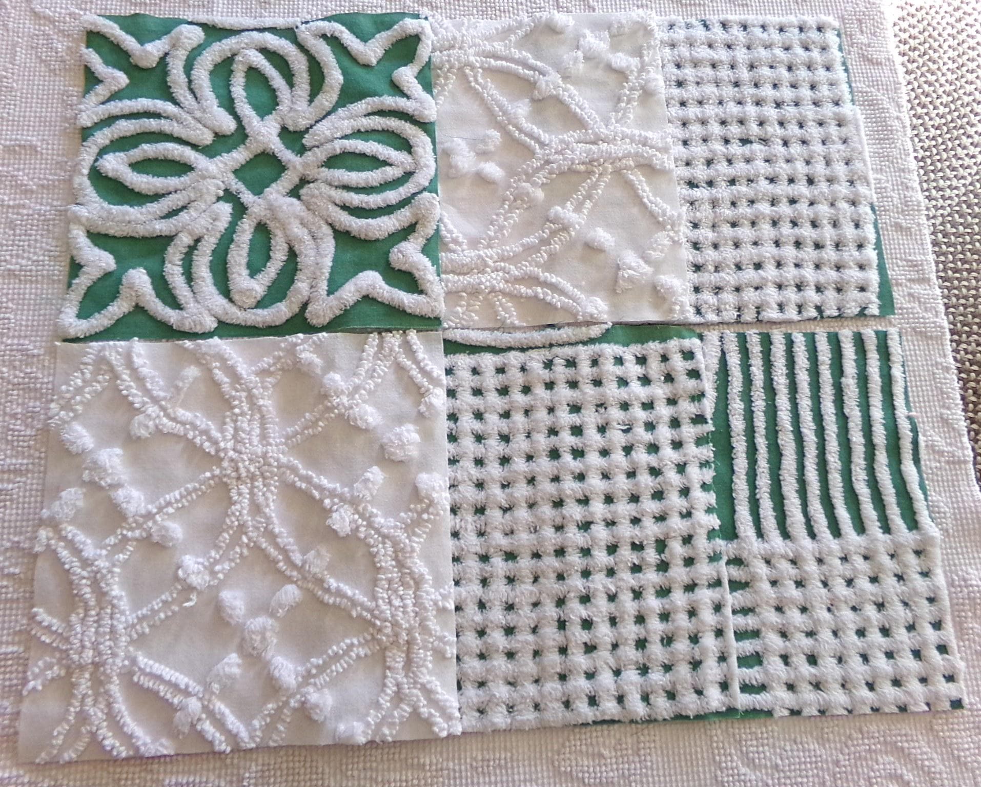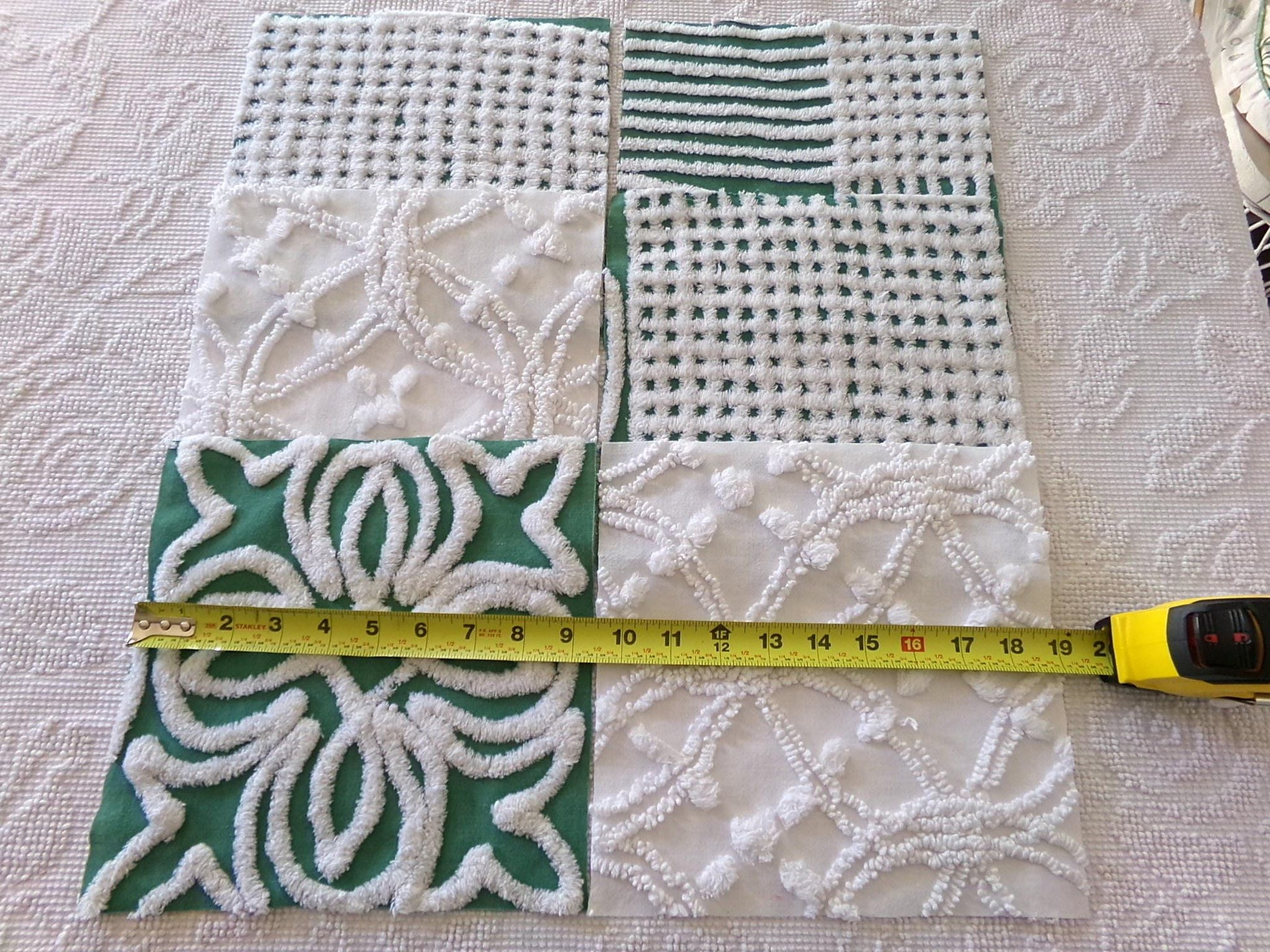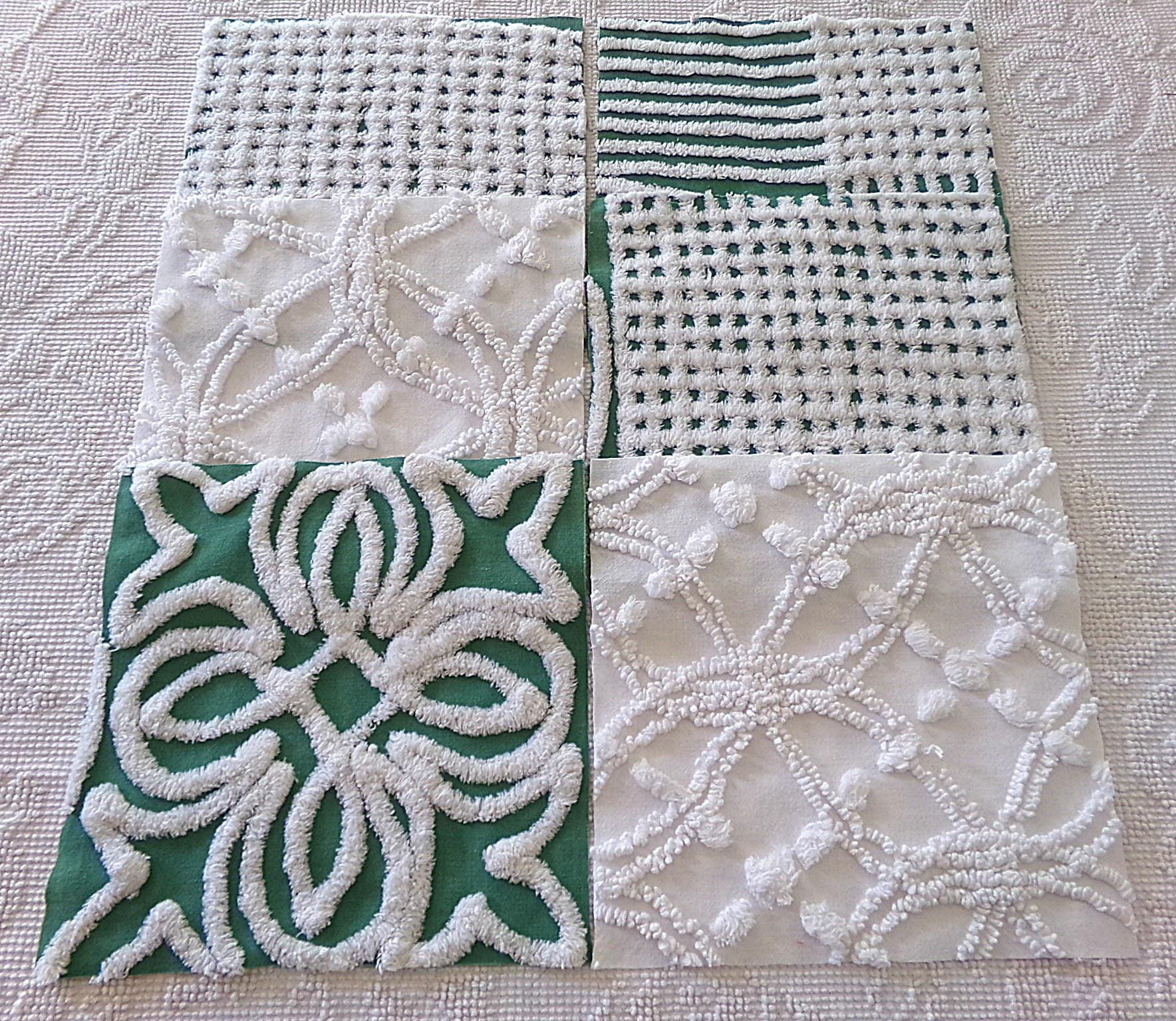 This set of vintage chenille quilt blocks offer a great contrast of snow white & rich green colors with great texture. Each block measures about 9.5" x 9.5" square, and includes a great range of texture. A striking little set of chenille fabric squares, in a nice larger size versus the smaller 6" squares we typically offer.::total qty: 6 vintage chenille quilt squares