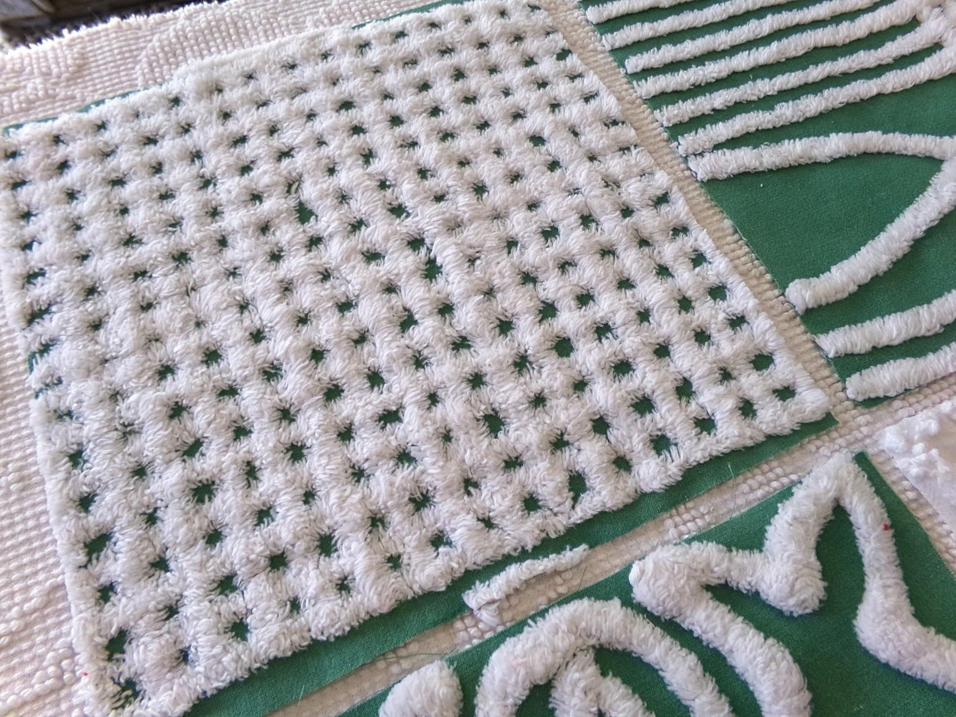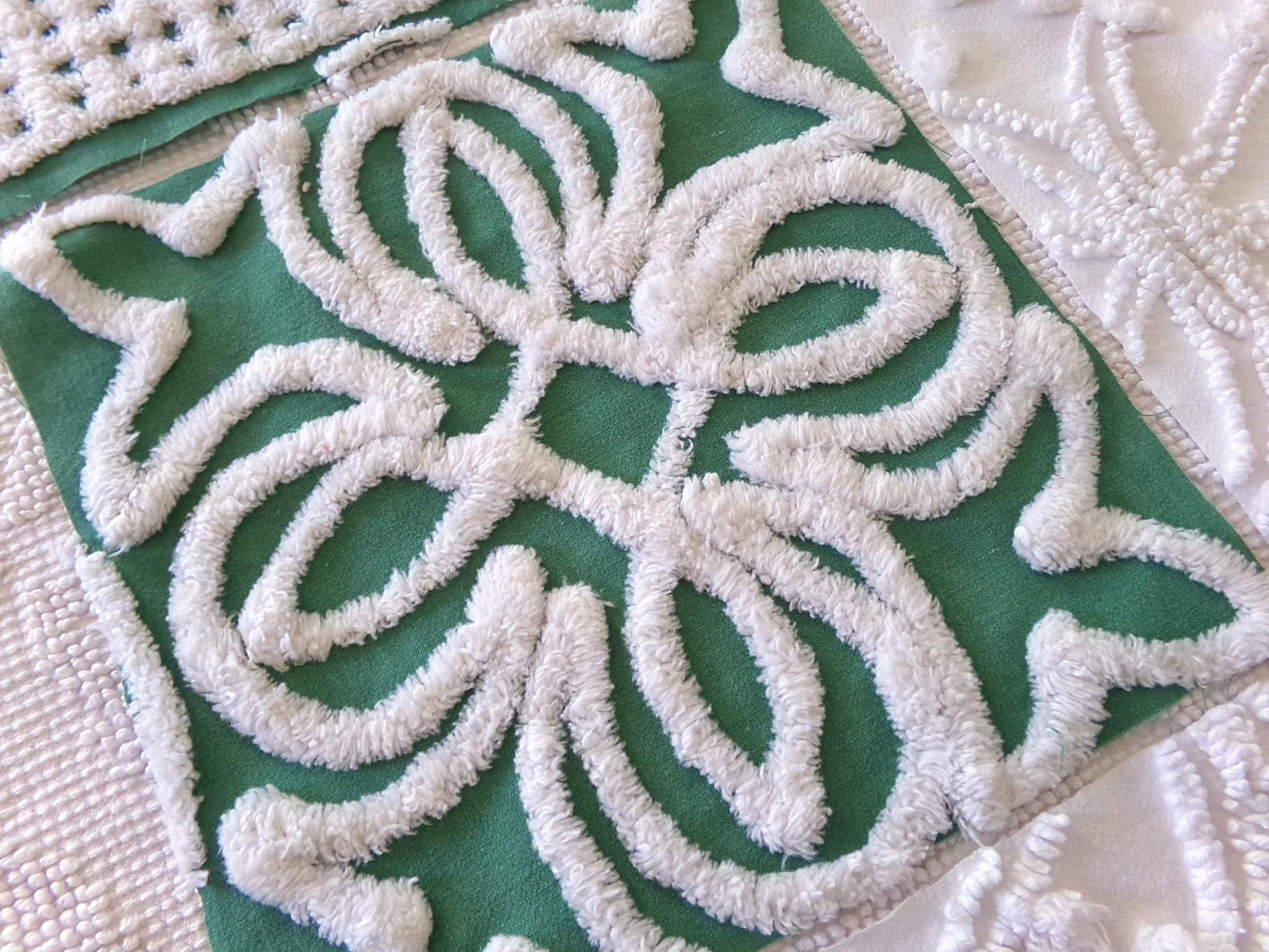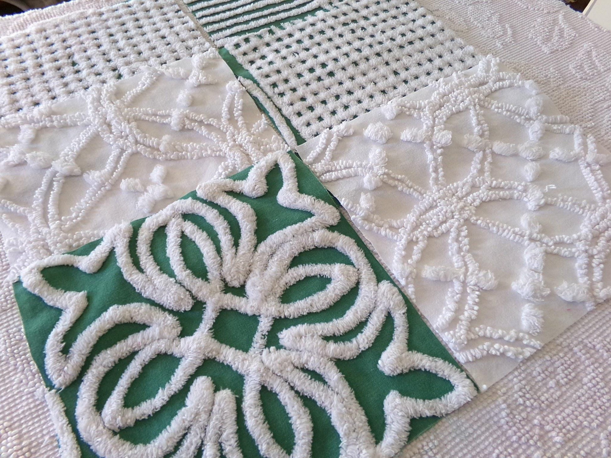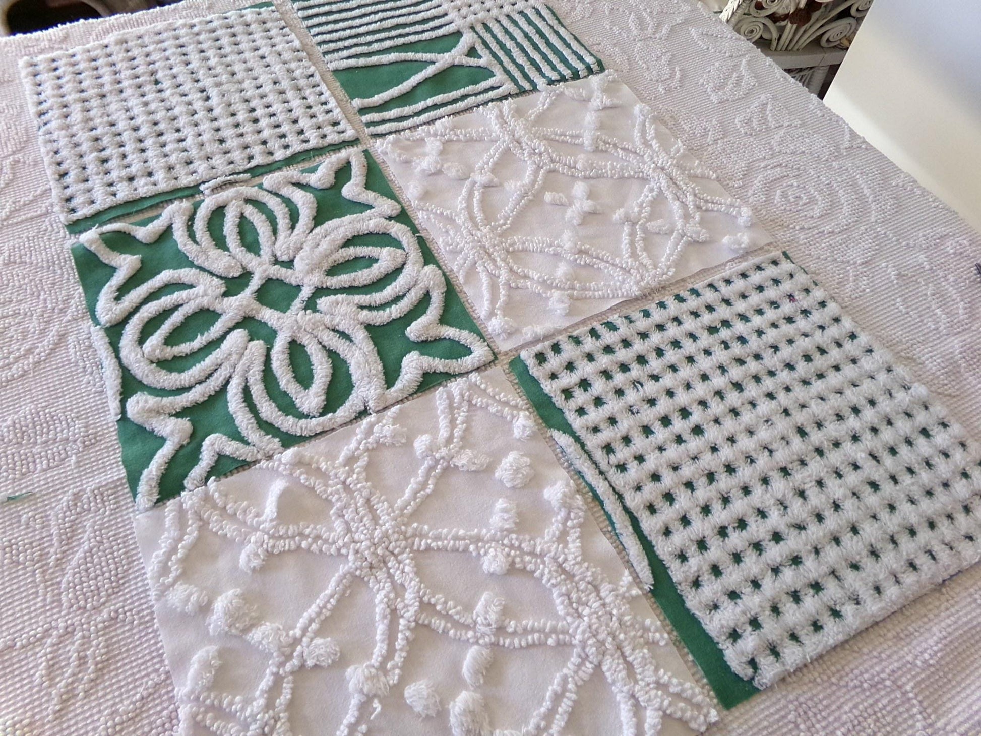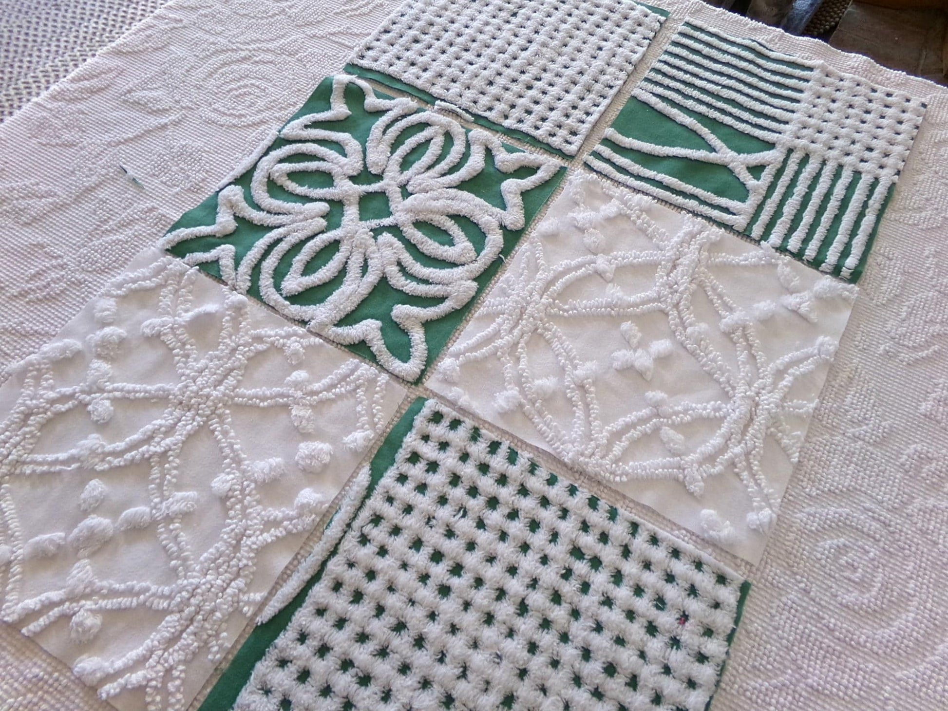 This set of vintage chenille quilt blocks offer a great contrast of snow white & rich green colors with great texture. Each block measures about 9.5" x 9.5" square, and includes a great range of texture. A striking little set of chenille fabric squares, in a nice larger size versus the smaller 6" squares we typically offer.::total qty: 6 vintage chenille quilt squares