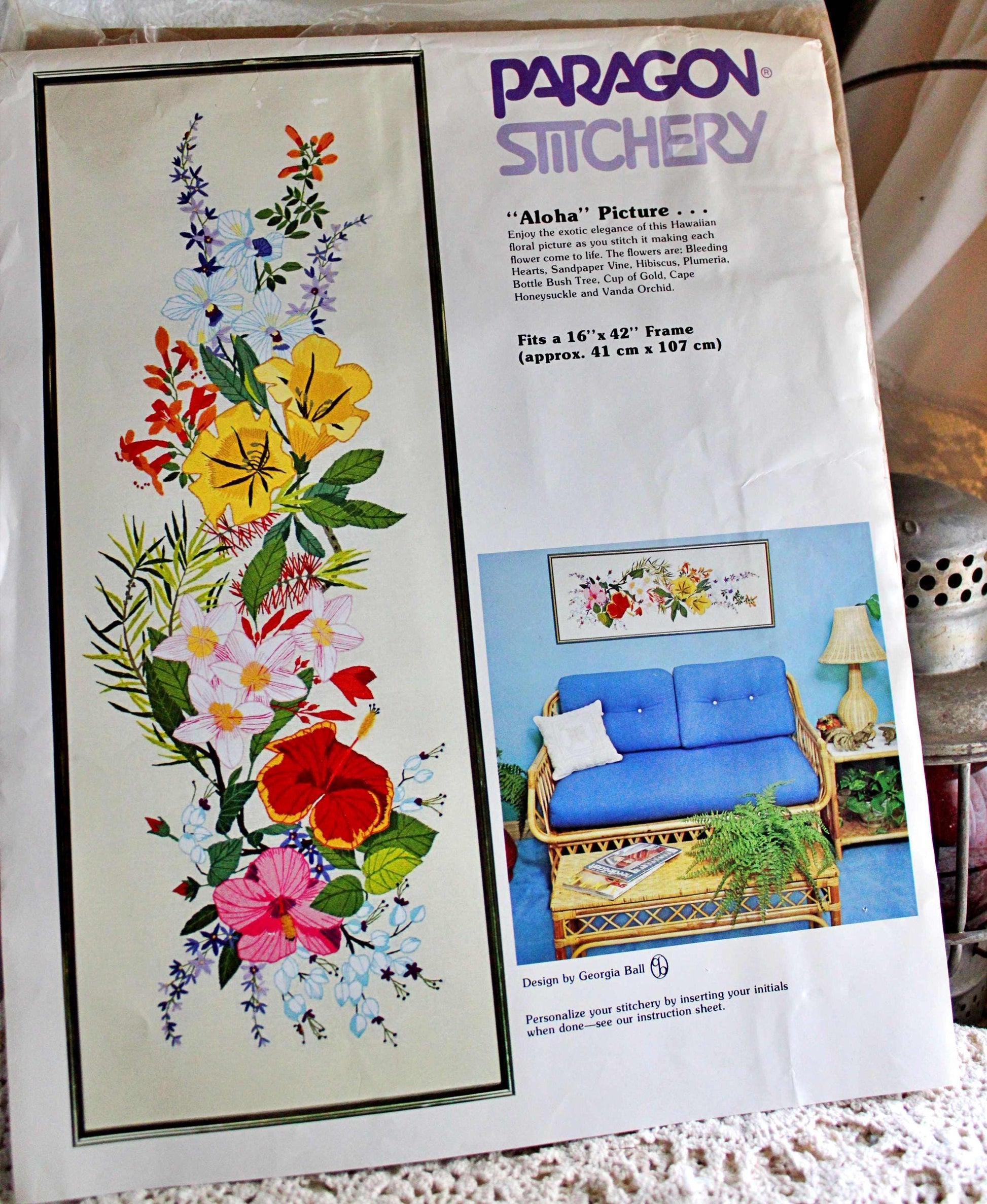 see more, cottagedivine.com"Enjoy the exotic elegance of this Hawaiian floral picture as you stitch it making each flower come to life. The flowers are: Bleeding Hearts, Sandpaper Vine, Hibiscus, Plumeria, Bottle Bush Tree, Cup of Gold, Cape Honeysuckle and Vanda Orchid."
