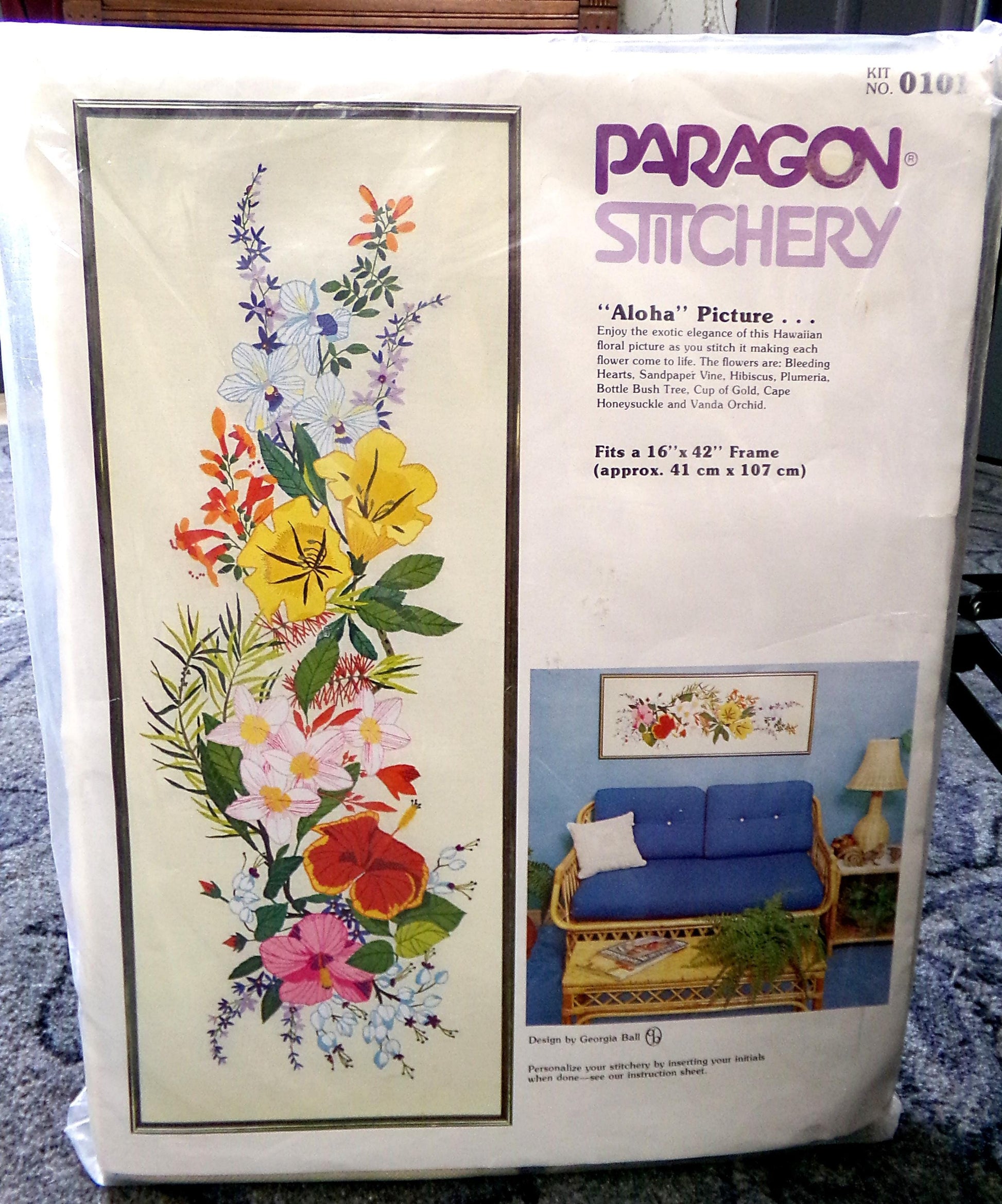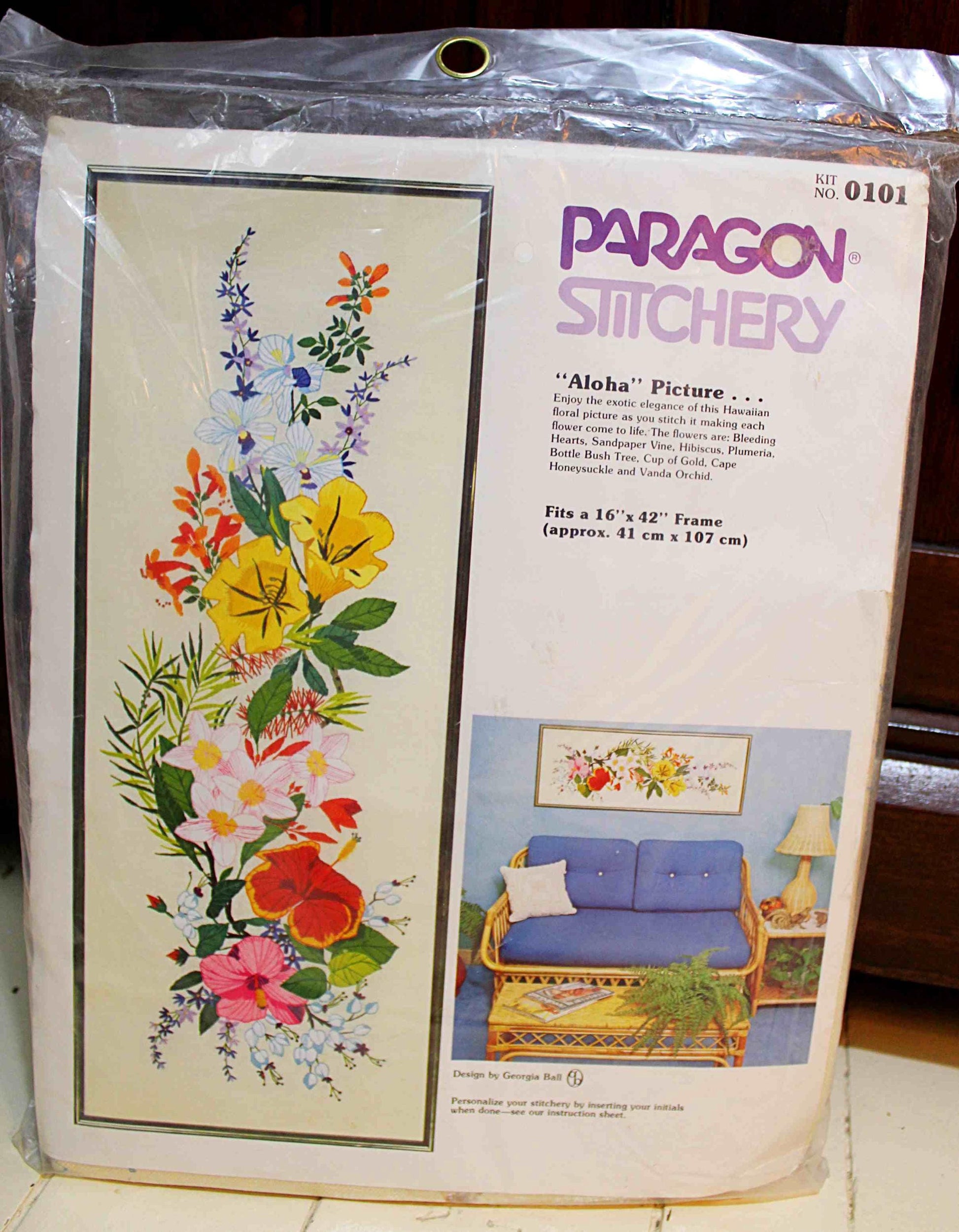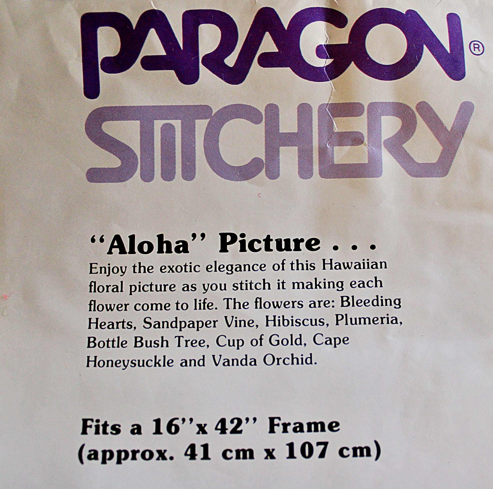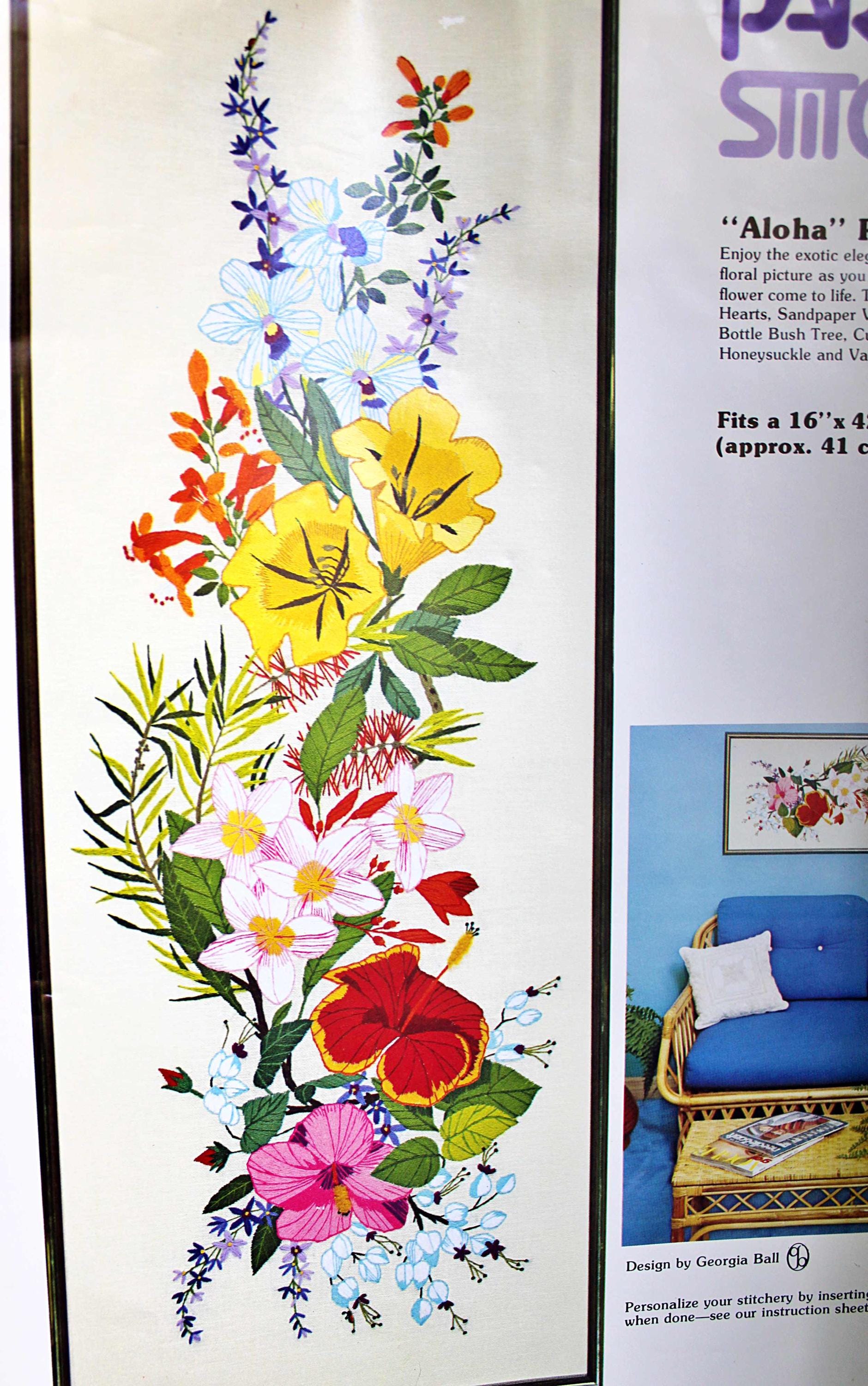 "Aloha Picture," a vintage exotic 1970s era Georgia Ball design for Paragon Needlecraft that would make an amazing tropical boho style wallhanging. Very substantial in size - fits a 16" x 42" frame when complete. Kit # 0101.