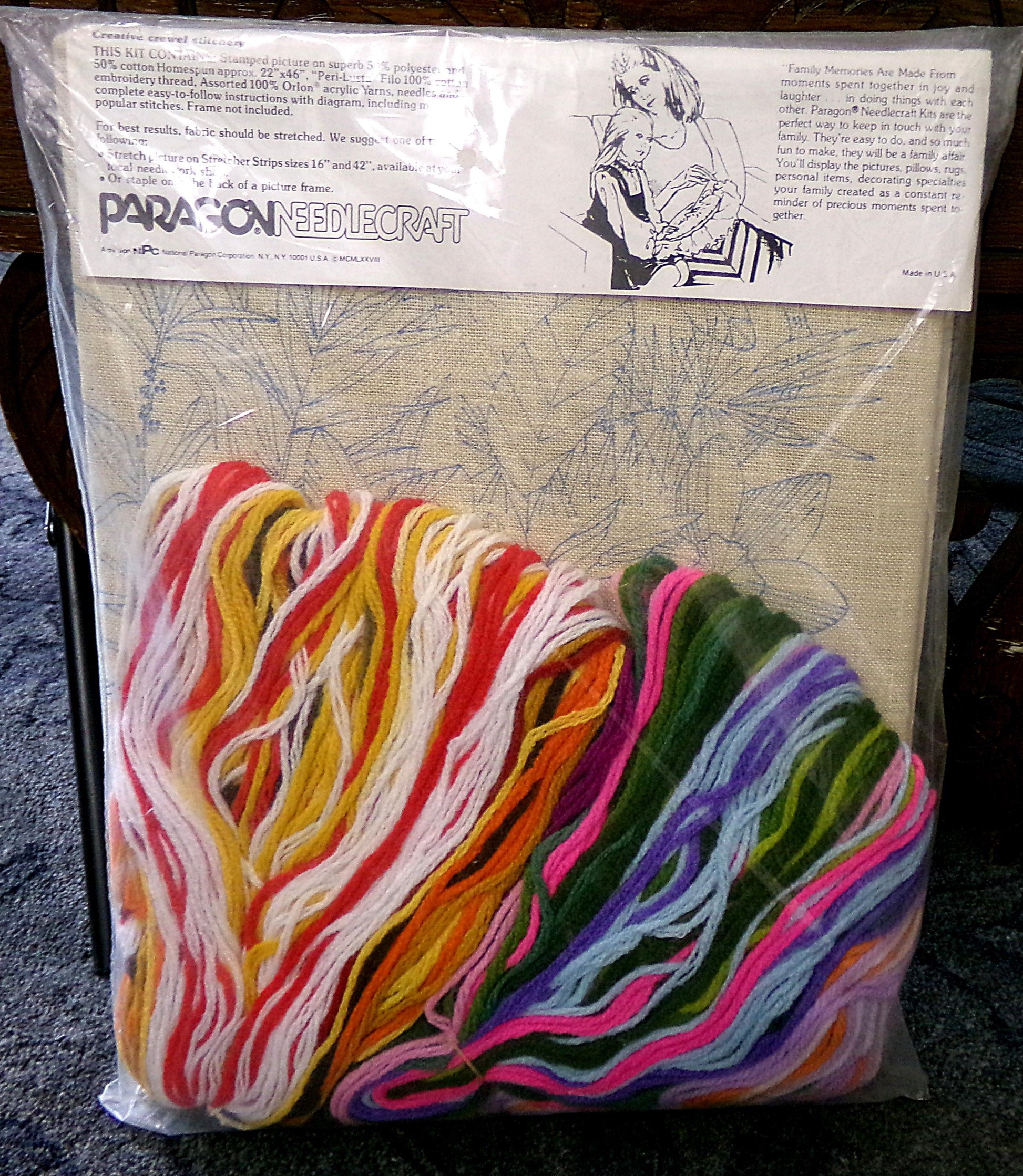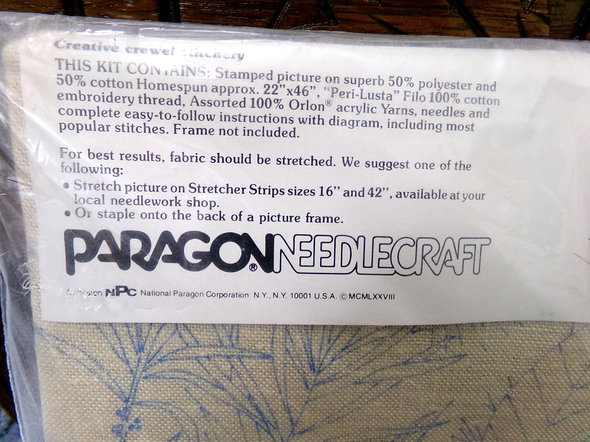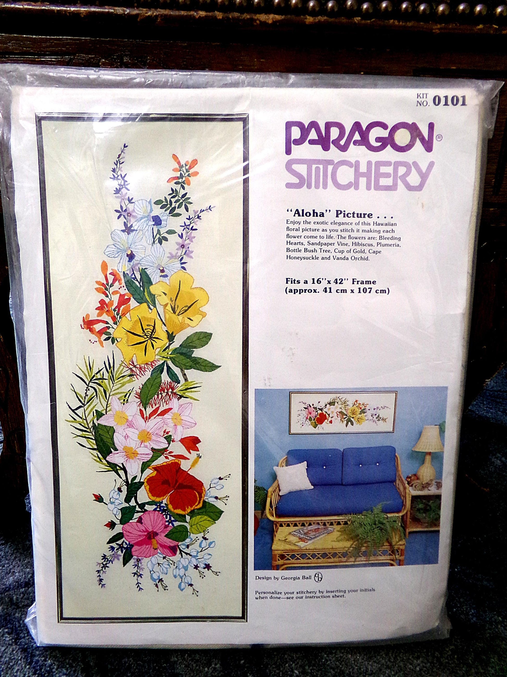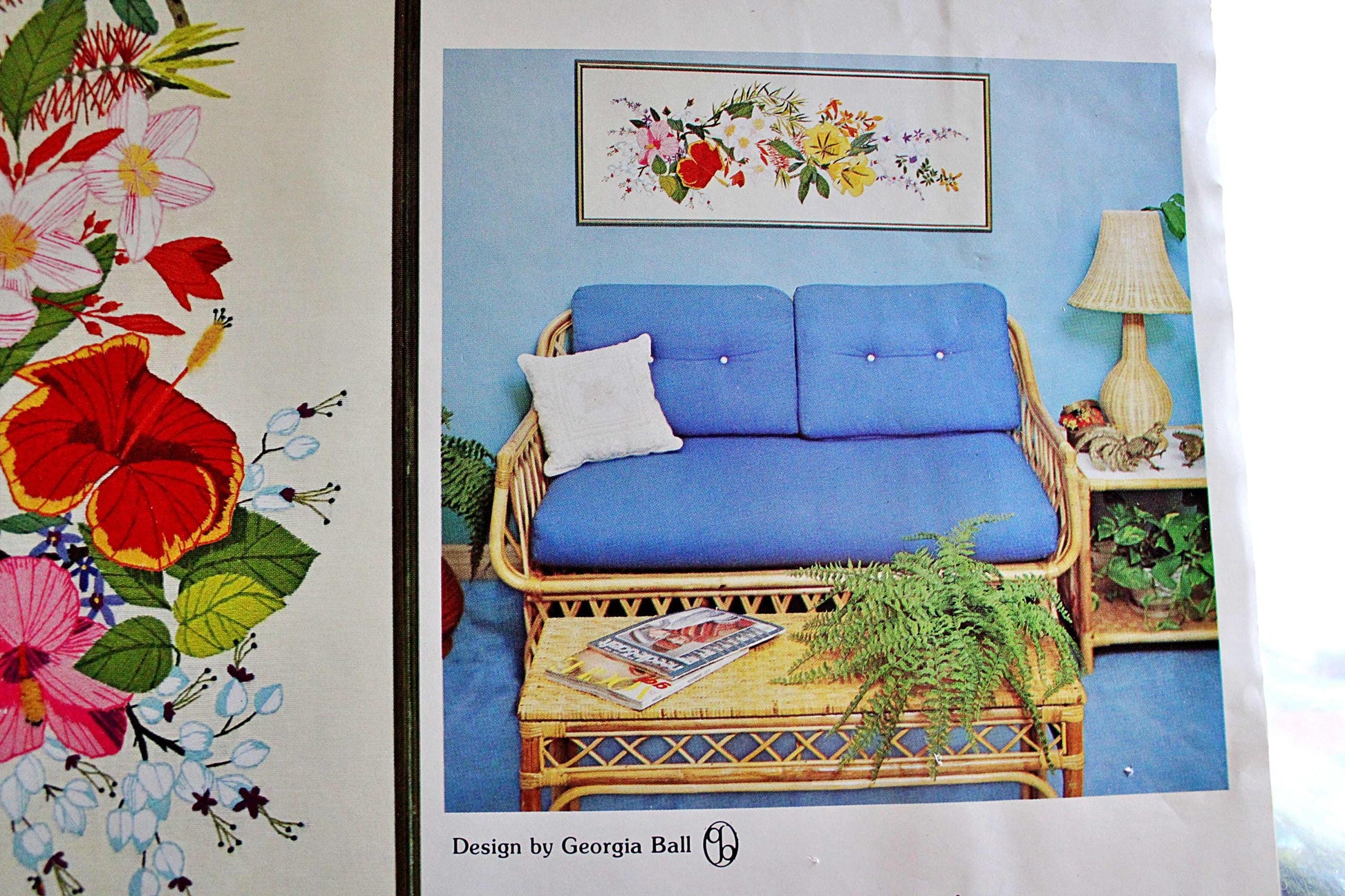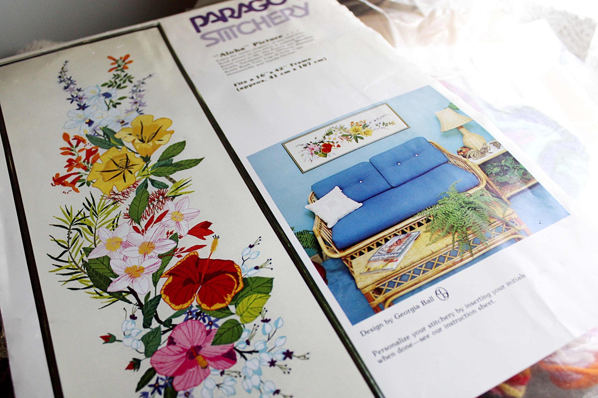 "Aloha Picture," a vintage exotic 1970s era Georgia Ball design for Paragon Needlecraft that would make an amazing tropical boho style wallhanging. Very substantial in size - fits a 16" x 42" frame when complete. Kit # 0101.