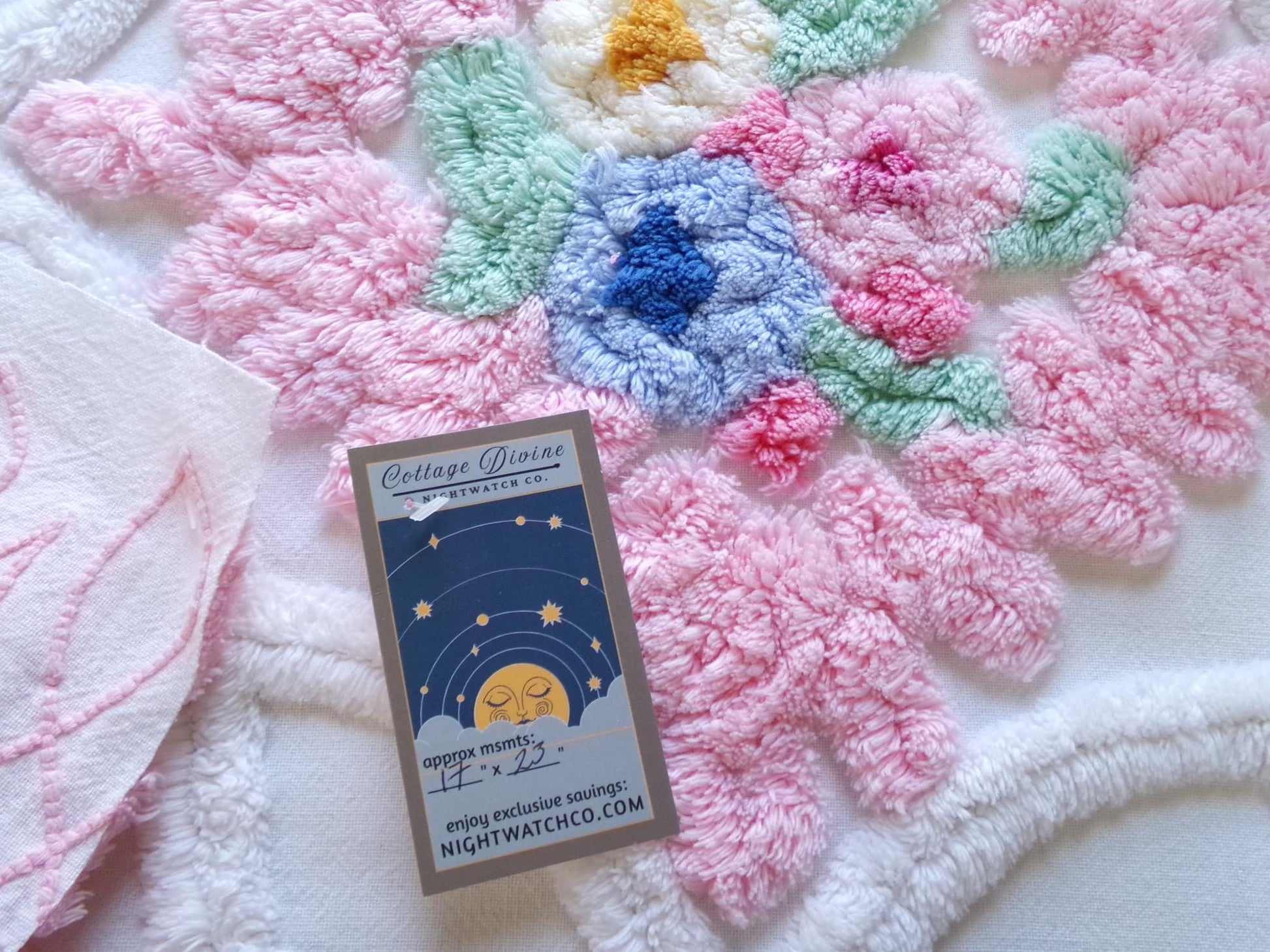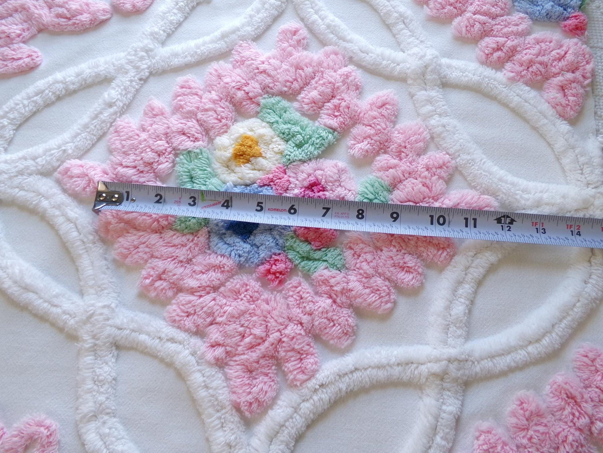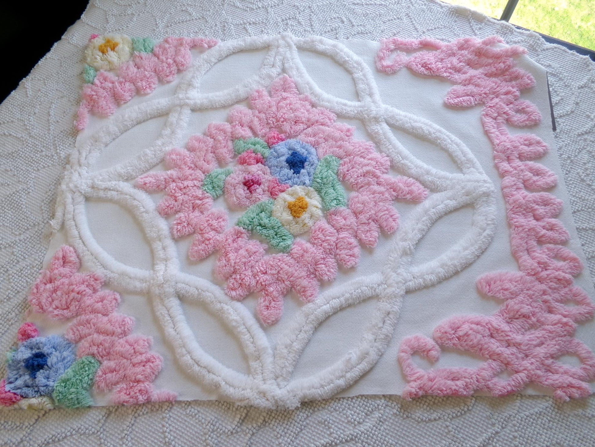 No doubt, this is by far the most impossibly gorgeous pattern of vintage chenille fabric I have. If you're looking for the ultimate in cottage chic grandeur, this is that fabric. Exquisite pink thick "frosting" and a standout central wedding cake floral motif set in a wide infinity square make this piece unforgettable.Measures approx 17" x 23" inches. 100% heavy cotton with thick plush chenille tufting. You may spot a few lite pinholes or small marks, common to the fabric.