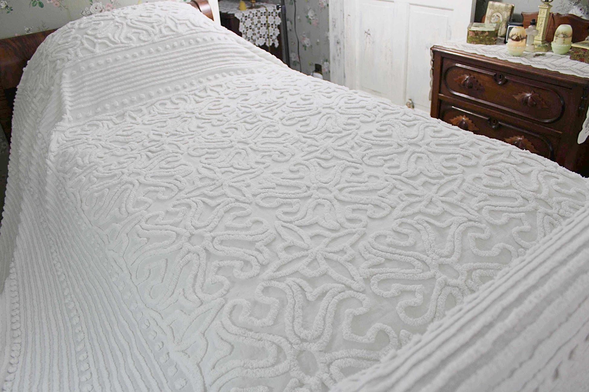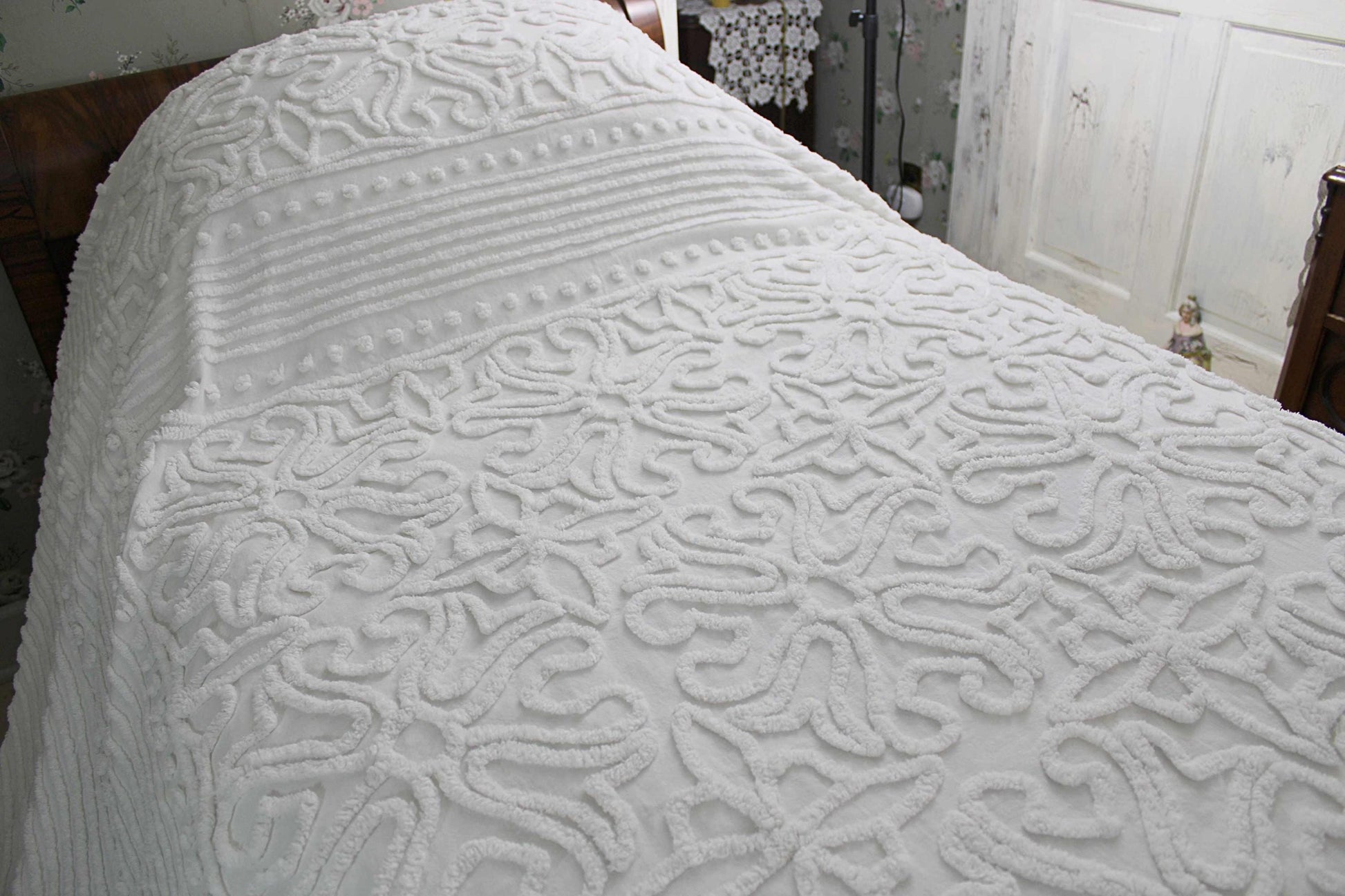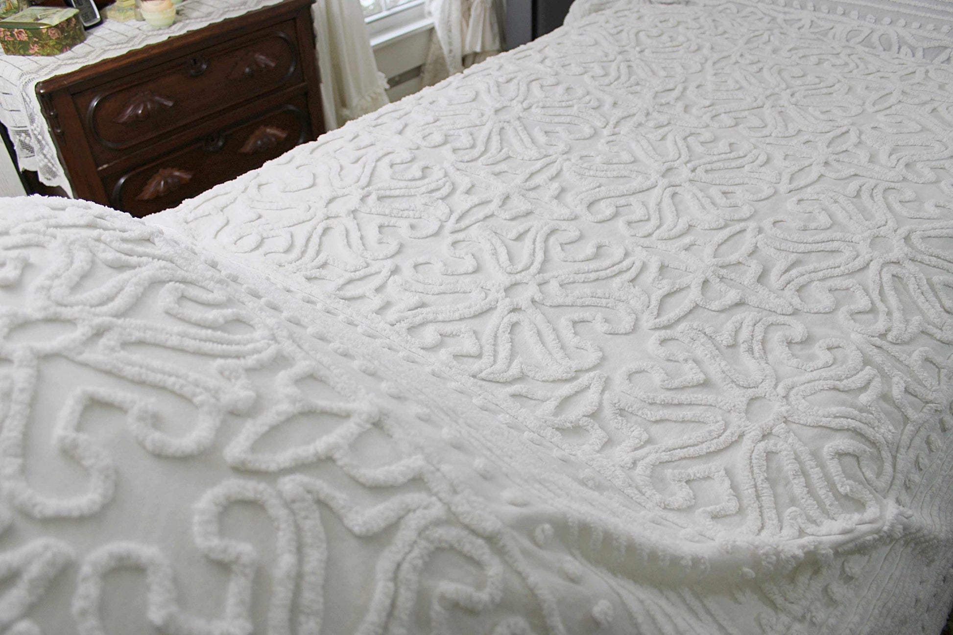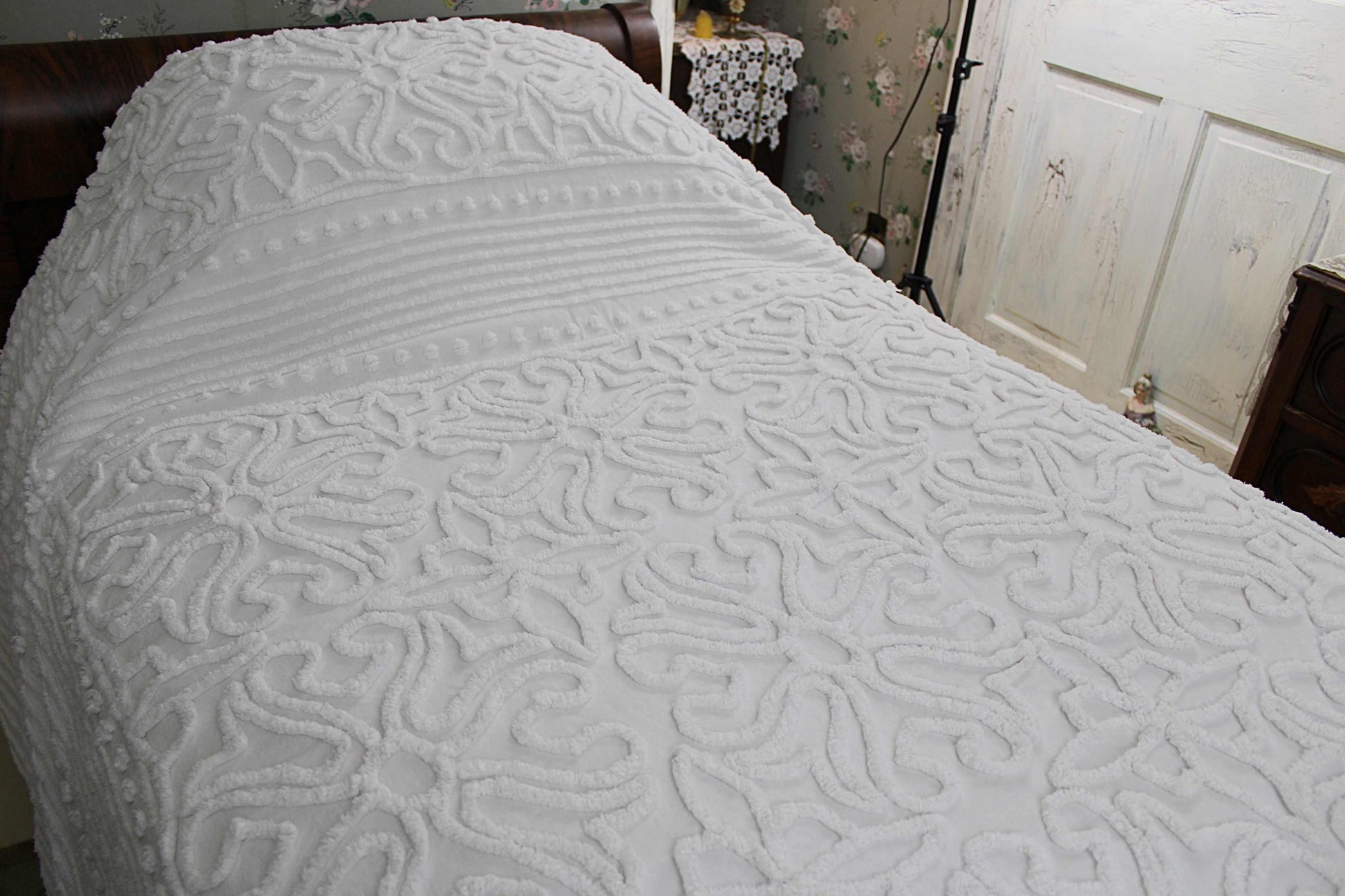 A heavenly vintage chenille bedspread to incorporate into your farmhouse style decor. Beautiful, large sculpted scrollwork predominates the central portion, while the sides feature a simple line design interspersed with dots.Ideal as a summer coverlet, the bedspread is lightweight, 100% cotton. Or, it's versatile enough to layer with your other favorite linens for an effortlessly chic look.